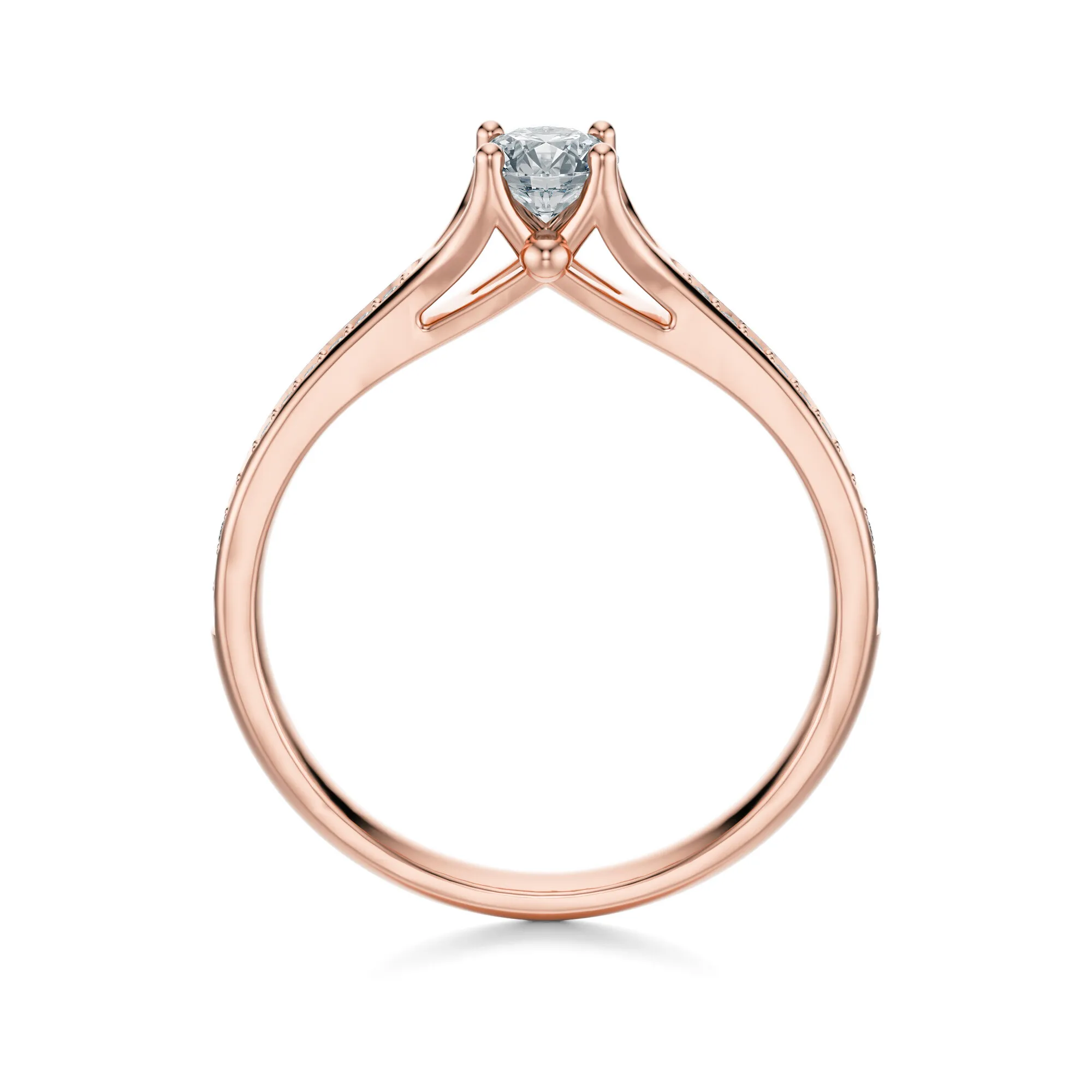 Główny kamień wyróżnia się okrągłym szlifem typu Excellent, czystością VS2 i barwą H – parametrami, które zapewniają wyjątkowy połysk i doskonałą grę światła. Pierścionek dostępny jest w wersjach z masą kamienia 0.30, 0.40, 0.50 lub 0.70 ct. Precyzyjne ułożenie mniejszych diamentów wzdłuż obrączki podkreśla świetlisty efekt i dodaje pierścionkowi wyrafinowanego uroku.