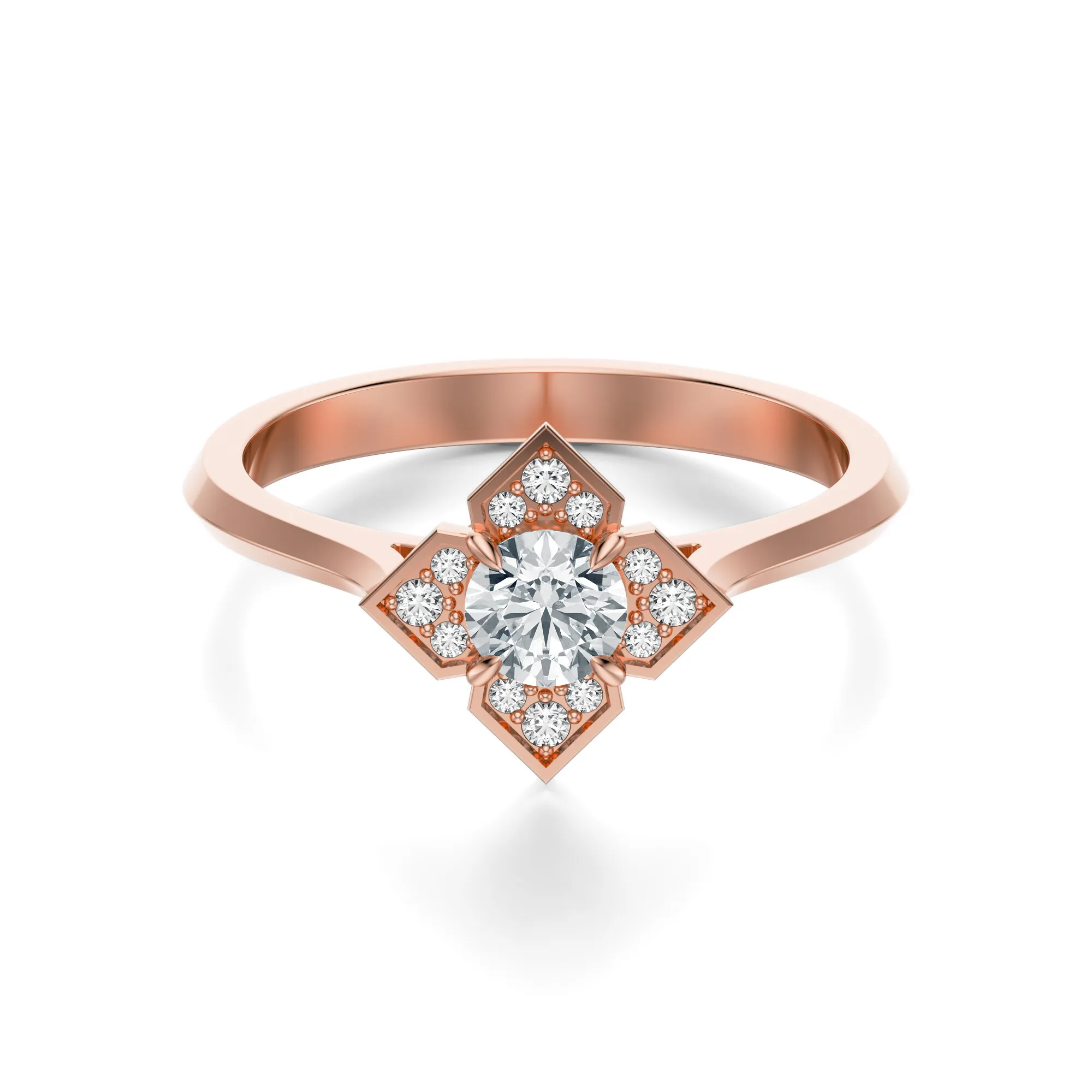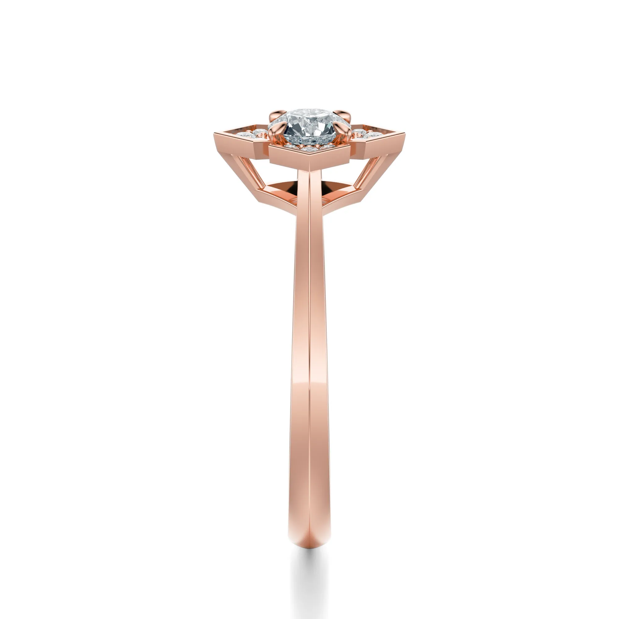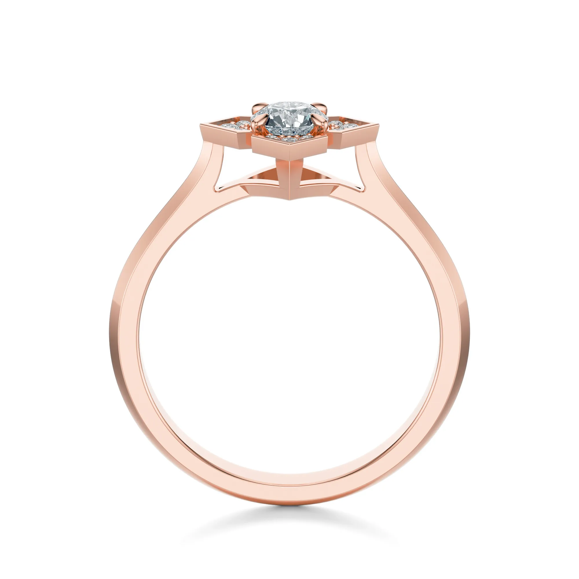 Ten zachwycający pierścionek z różowego złota emanuje subtelną elegancją i ponadczasowym wdziękiem. Wykonany ze złota o próbie 585, łączy w sobie nowoczesność z romantyzmem, który podkreśla wyjątkowy charakter biżuterii zaręczynowej. Centralny okrągły diament olśniewa intensywnym blaskiem, a jego urok dodatkowo wzmacniają mniejsze kamienie rozmieszczone wokół w harmonijnym układzie.