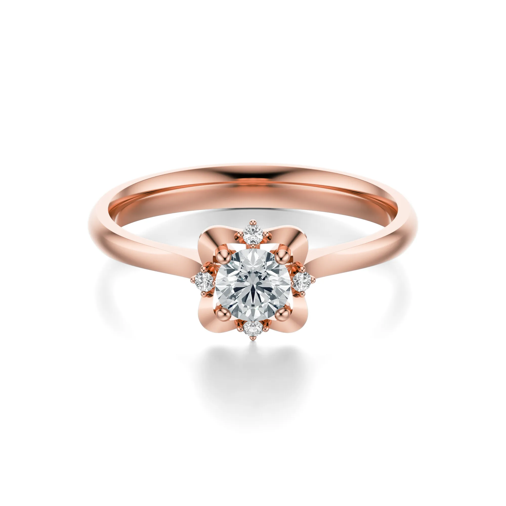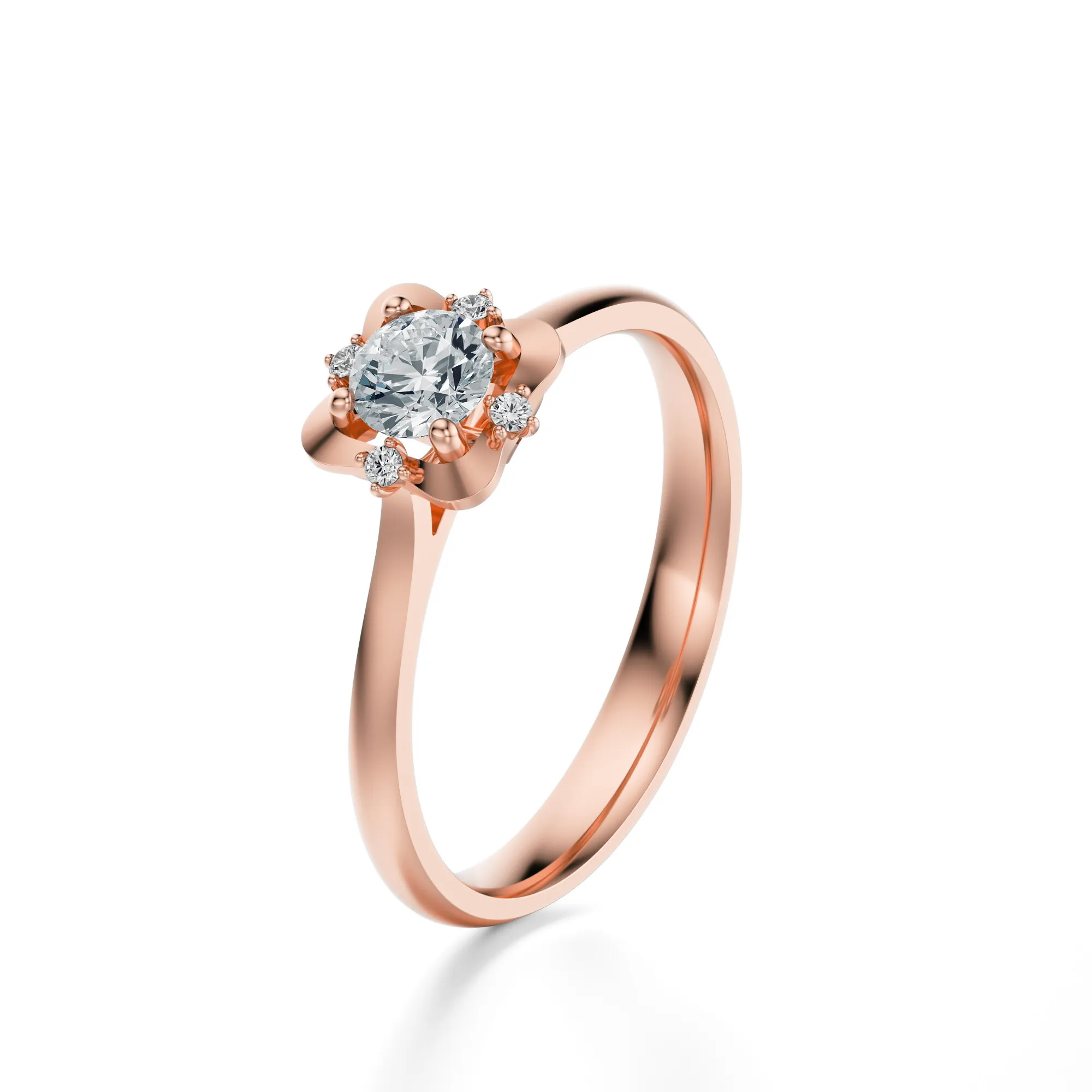 Ozdobiony centralnym brylantem oraz trzema mniejszymi kamieniami z każdej strony, pierścionek emanuje delikatnym blaskiem i harmonią. Starannie wyprofilowana korona przypomina kwiat, co dodatkowo nadaje całości zmysłowego, kobiecego charakteru. To idealny wybór dla osób ceniących biżuterię łączącą klasykę z nowoczesną finezją.
