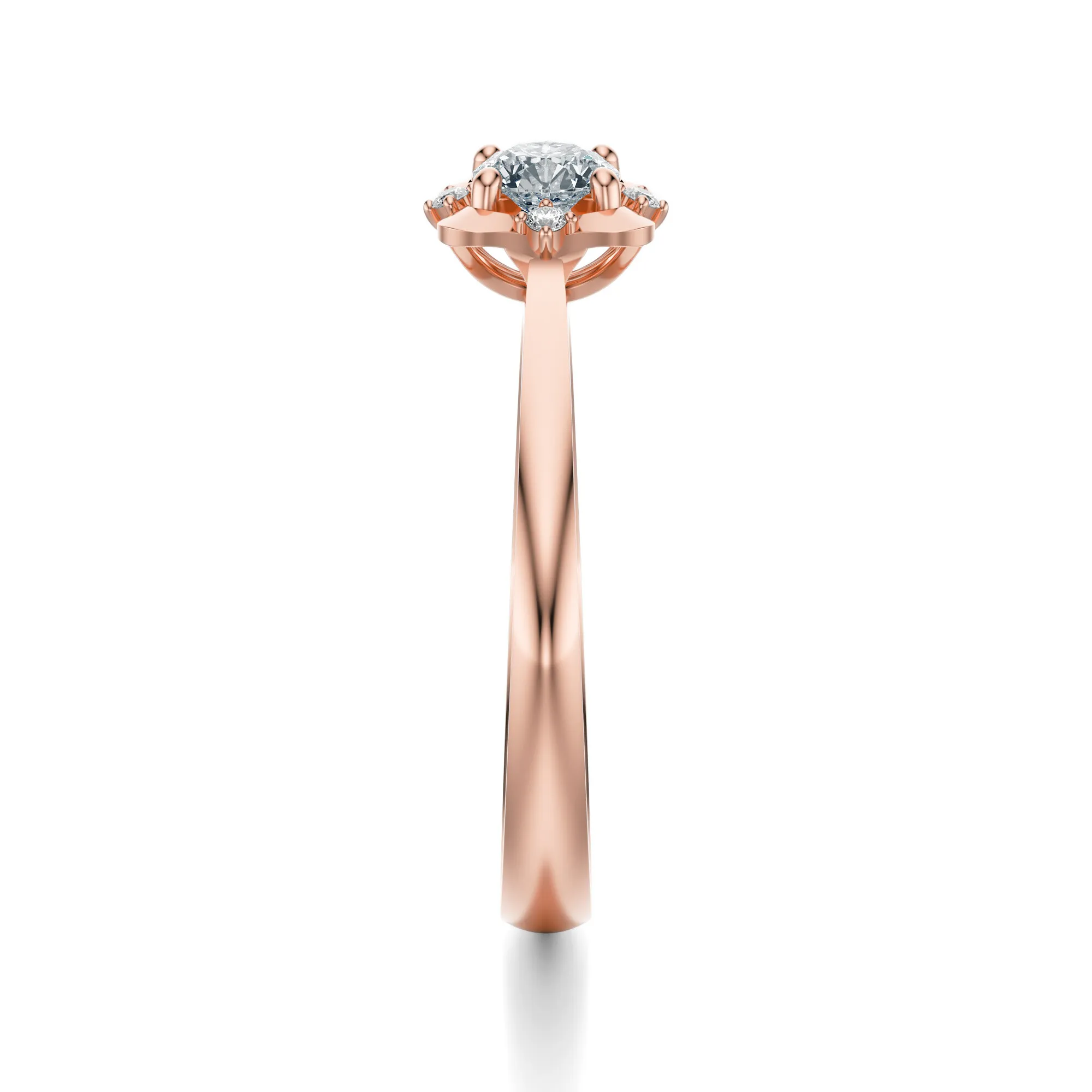Układ kamieni nawiązuje do naturalnej równowagi – główny diament symbolizuje jedność i wieczność, natomiast boczne kamienie podkreślają trwałość i stabilność uczucia. Styl pierścionka, inspirowany motywem kwiatowym, sprawia, że będzie idealny nie tylko jako pierścionek zaręczynowy, ale również jako wyjątkowy prezent z okazji rocznicy lub ważnego jubileuszu.