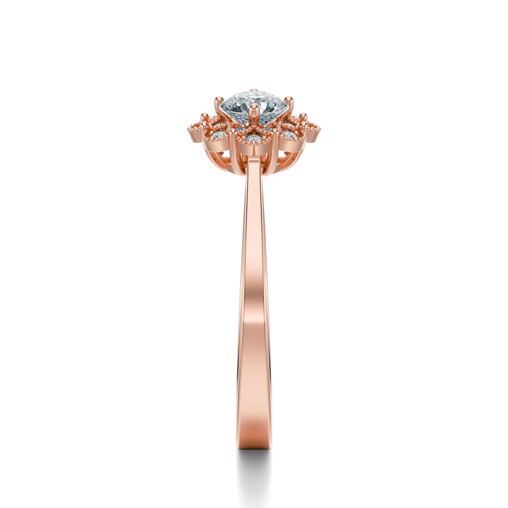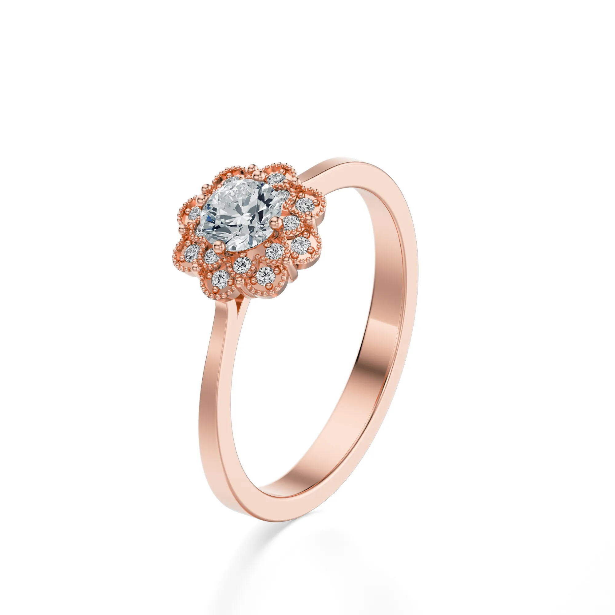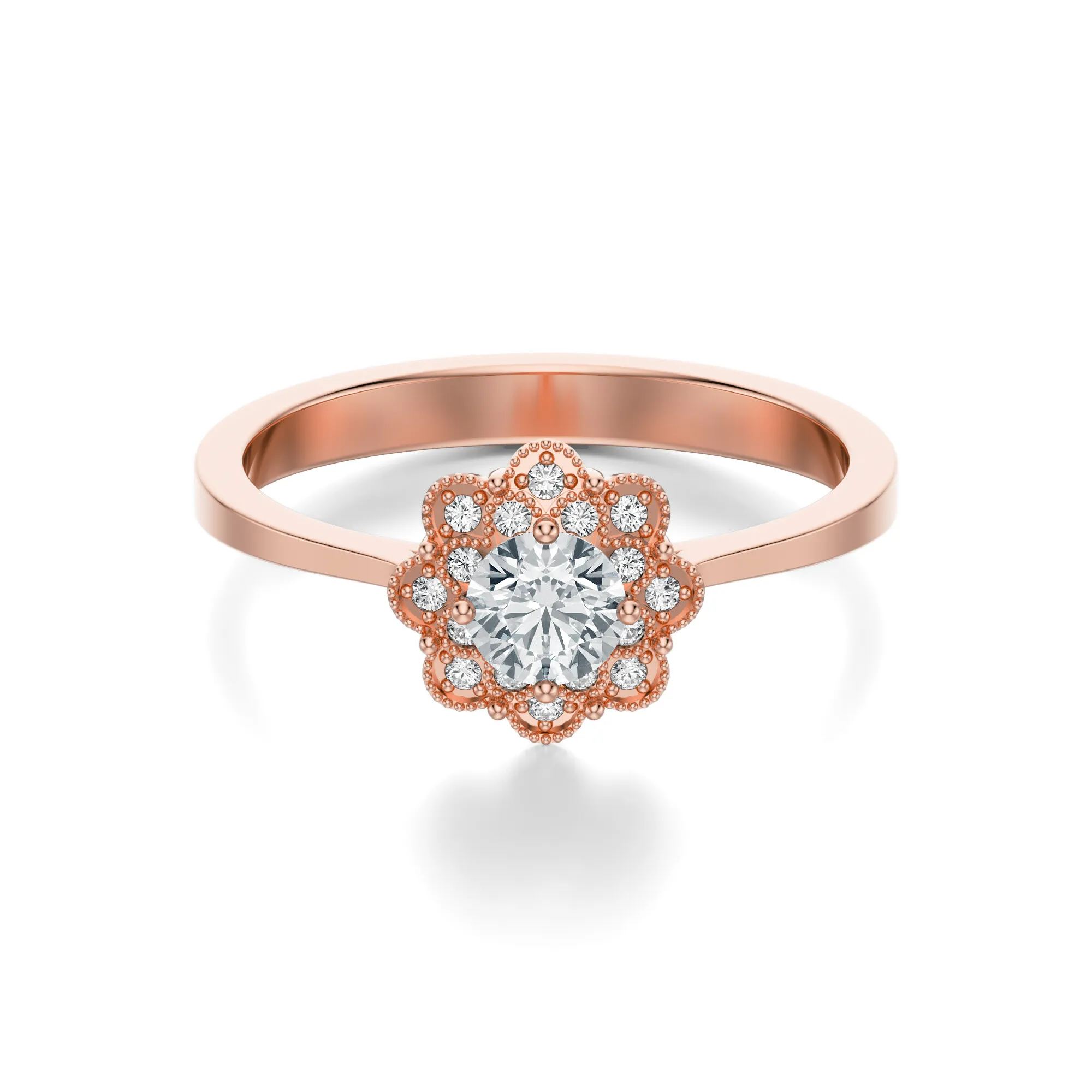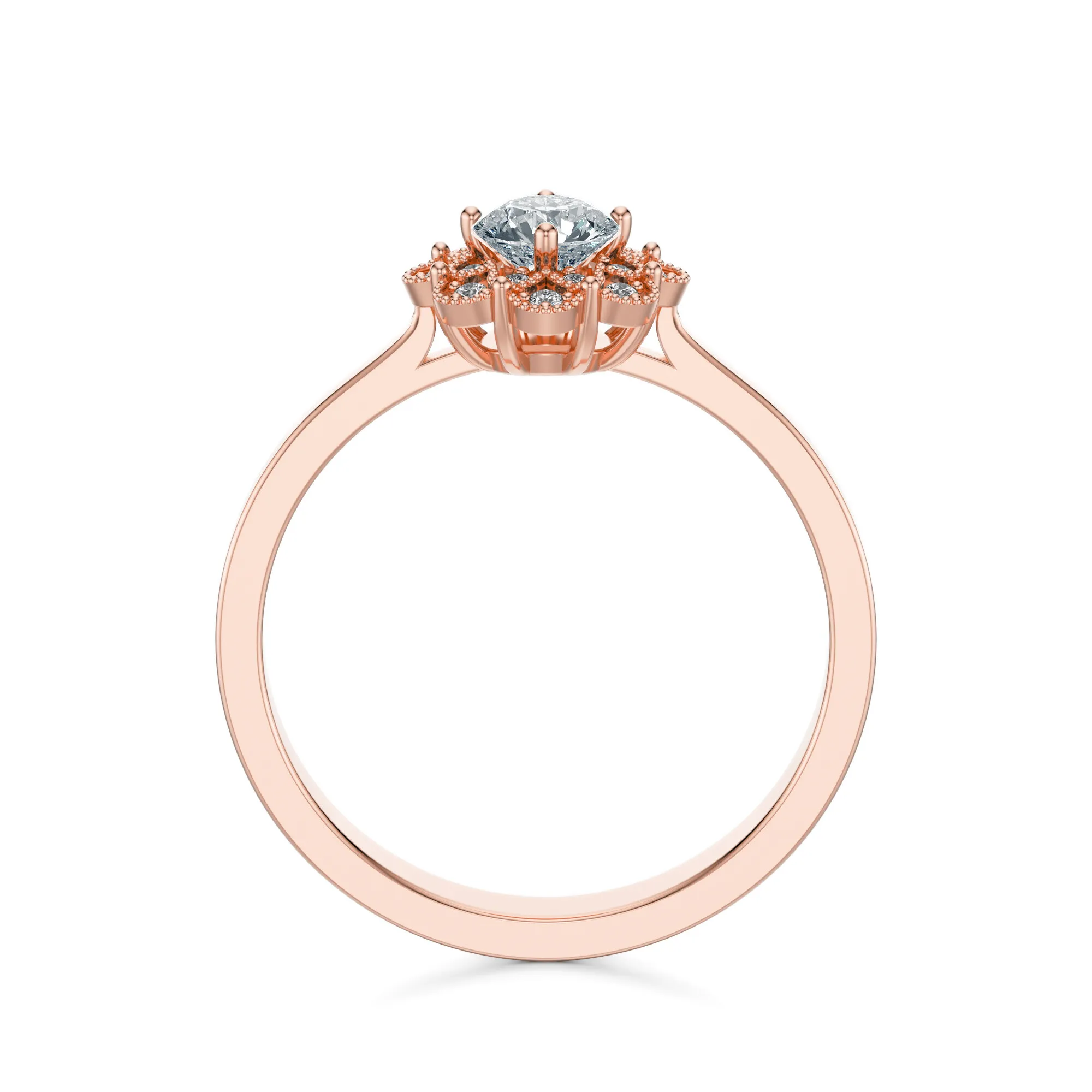 Ten pierścionek z różowego złota o próbie 585 to harmonijne połączenie subtelnego romantyzmu z klasyczną elegancją. Jego wyjątkowy design zachwyca detalem – centralny, okrągły diament osadzony jest w kwiatowej koronie złożonej z mniejszych, precyzyjnie oprawionych kamieni. Dzięki temu całość emanuje intensywnym blaskiem i wyjątkowym wdziękiem, który nie pozostaje niezauważony.