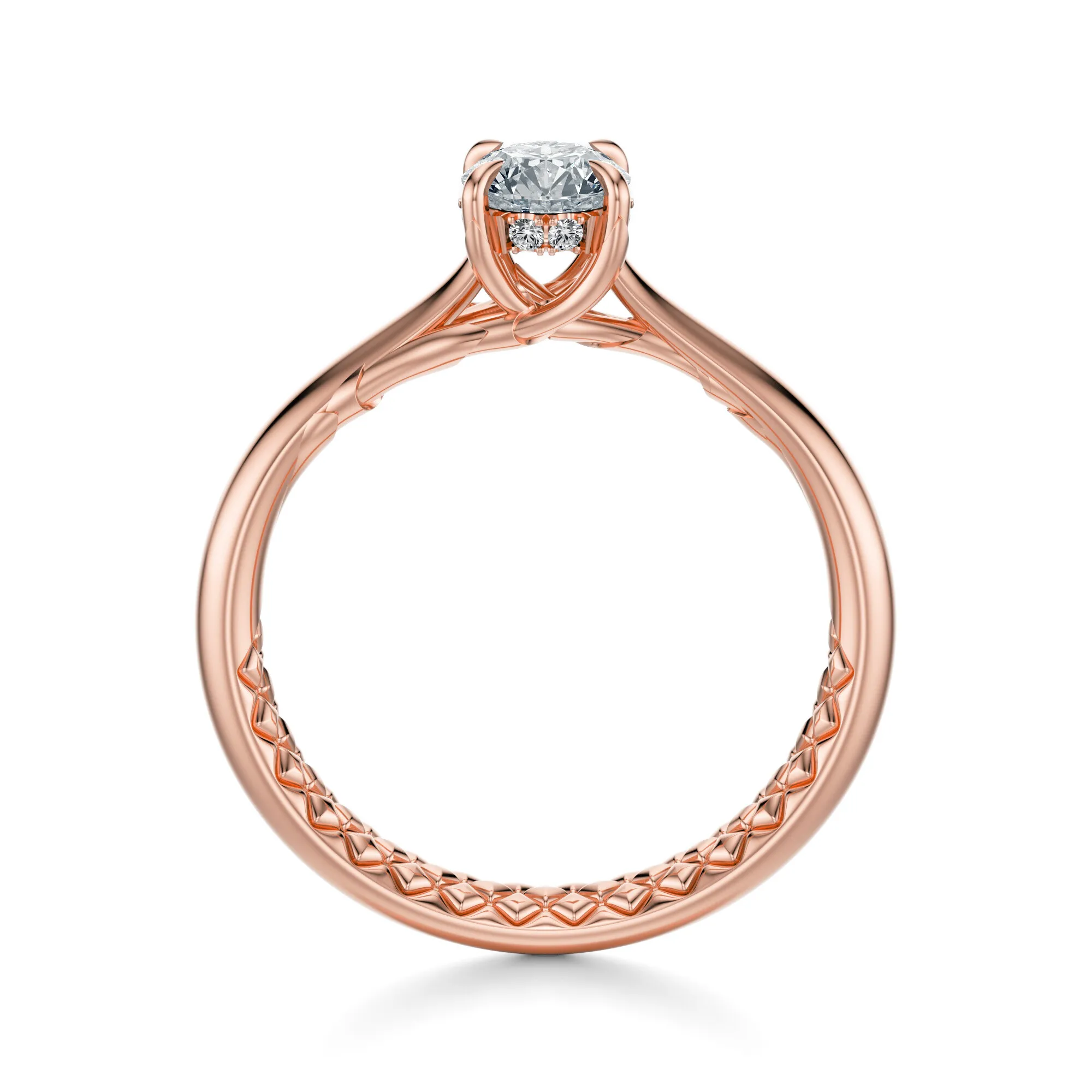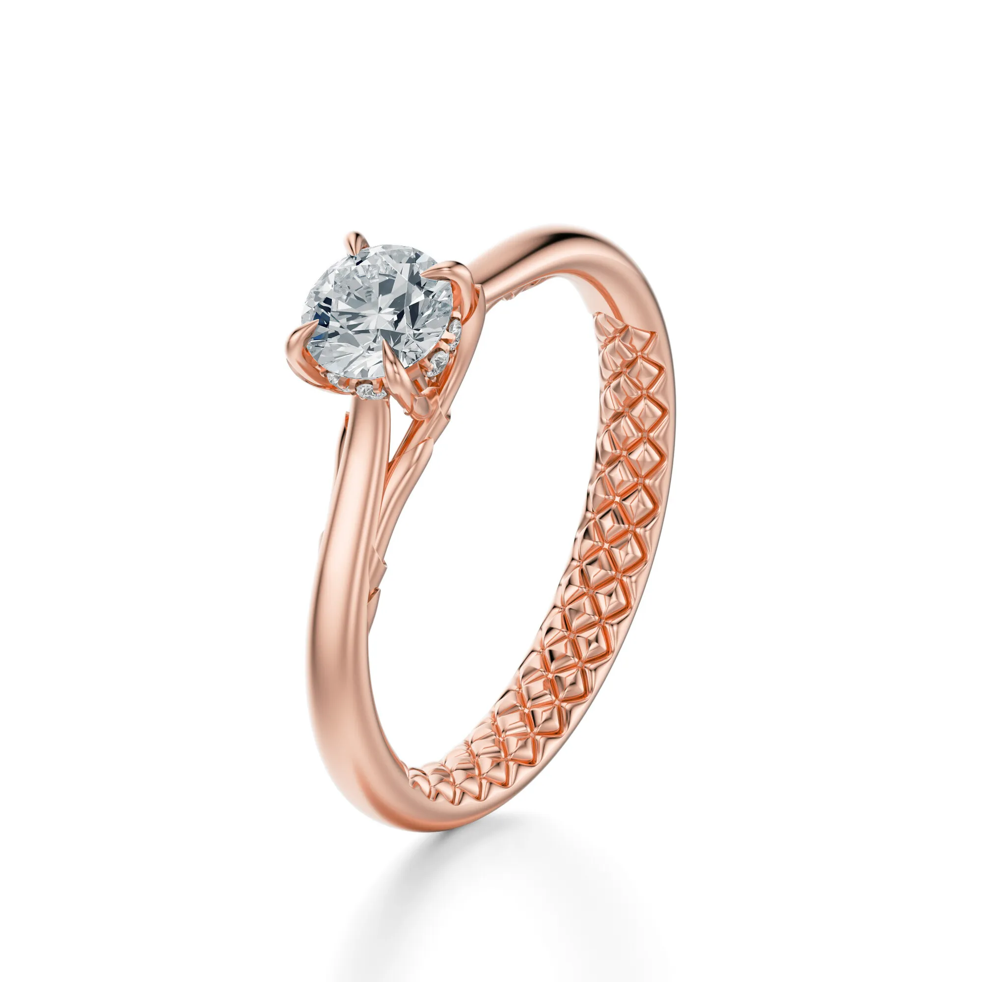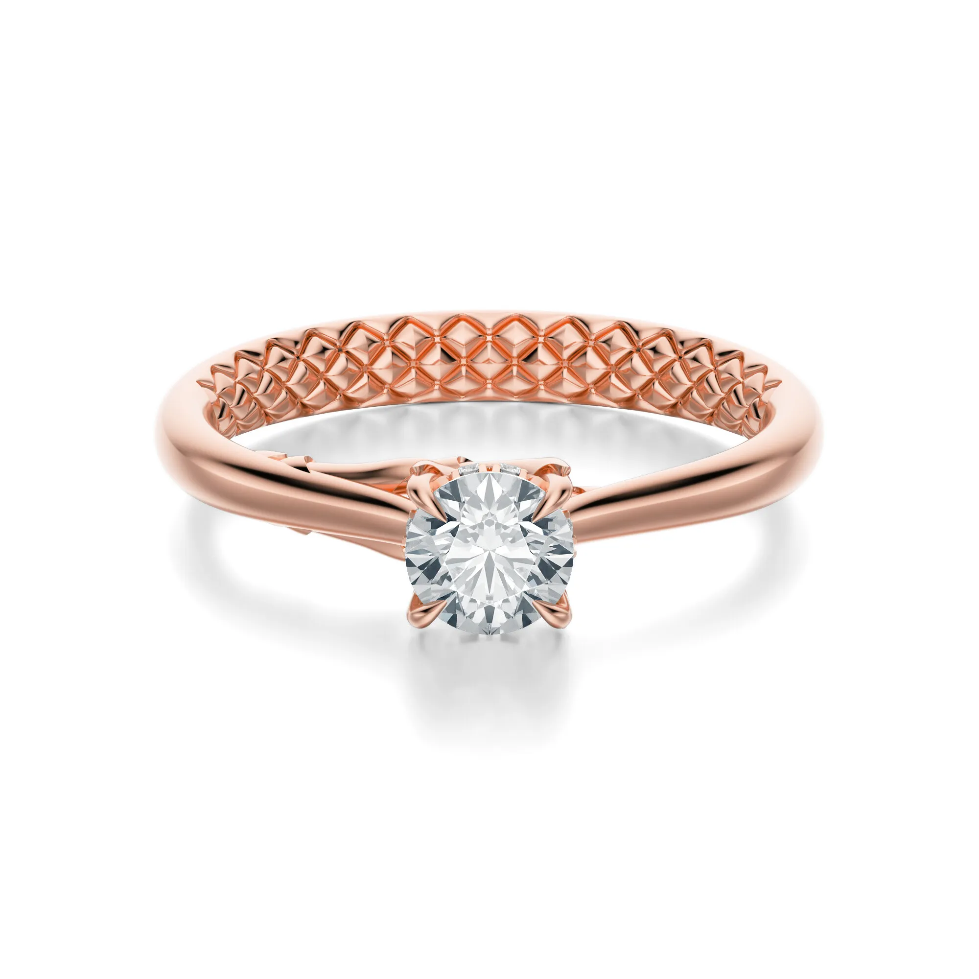Zmysłowy i niezwykle subtelny – ten pierścionek zaręczynowy wykonany z różowego złota próby 585 przyciąga uwagę delikatnym kolorem i doskonałą harmonią detali. Lśniący okrągły diament osadzony w finezyjnej oprawie zachwyca czystością i blaskiem, a całość dopełnia dekoracyjny wzór wewnętrznej części obrączki, który podkreśla niepowtarzalny charakter tej biżuterii.