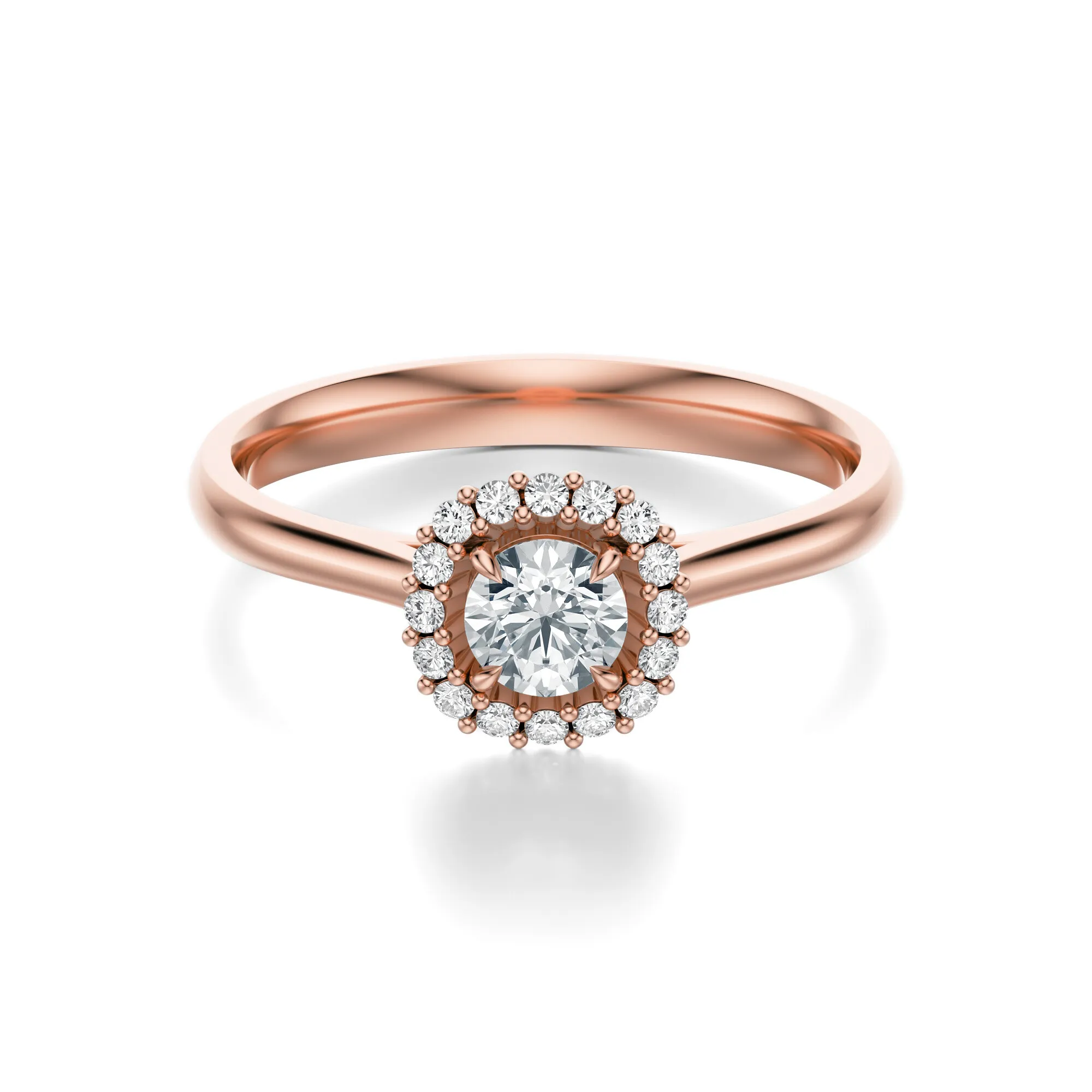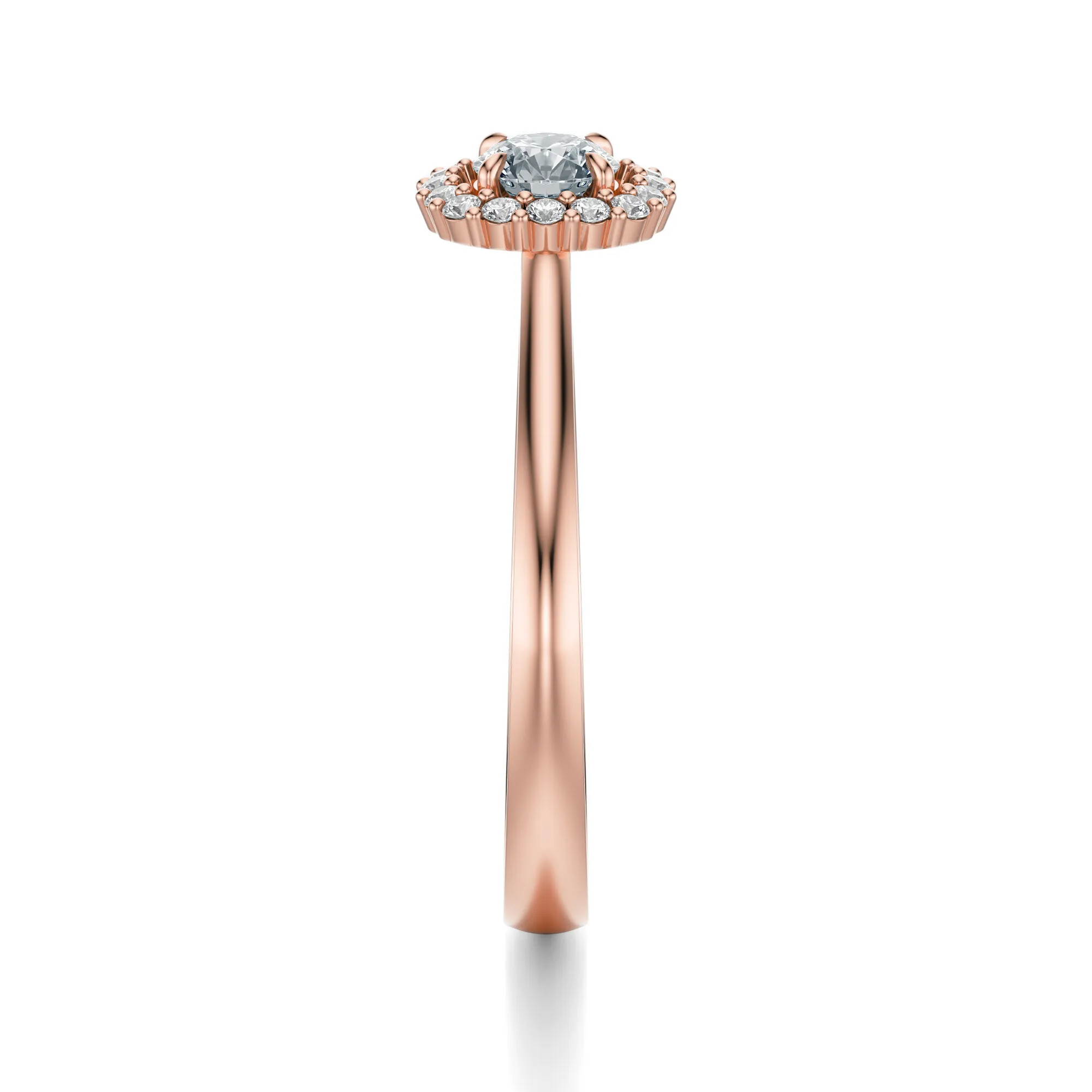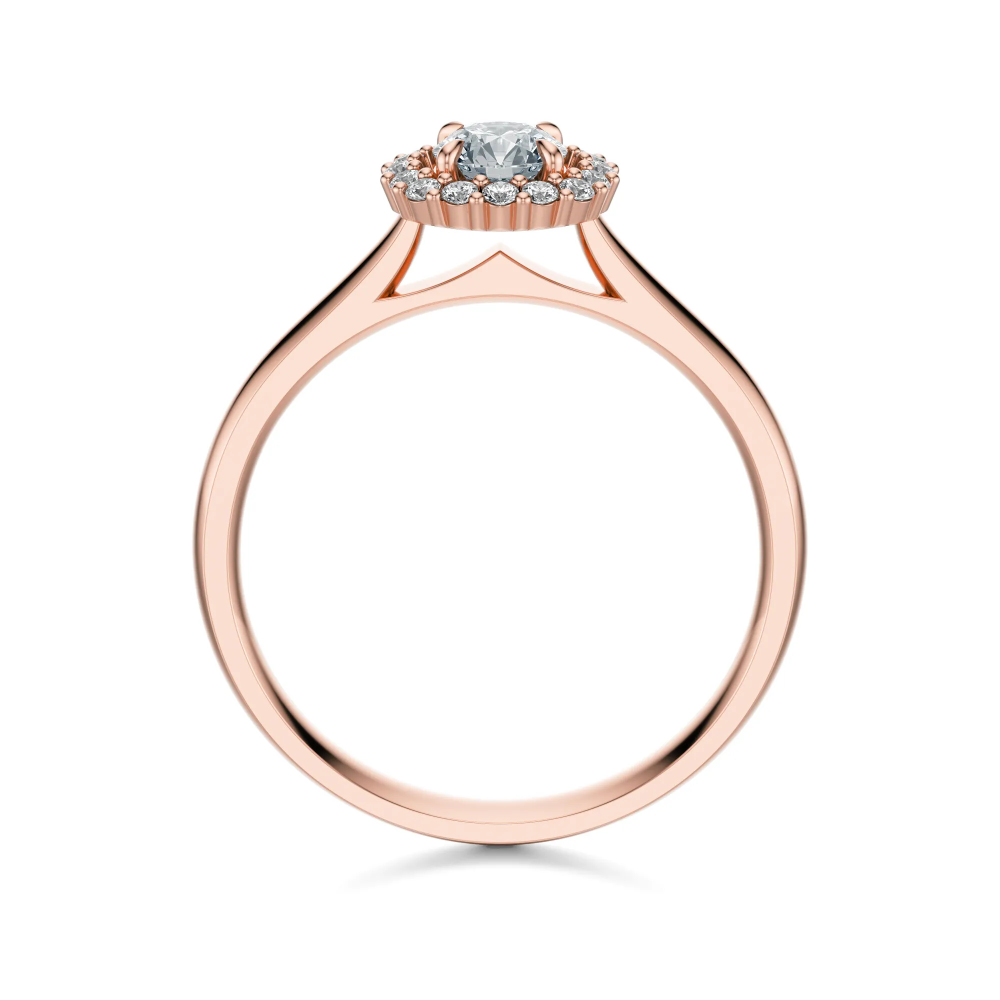 Główny kamień dostępny jest w czterech wersjach masy: 0.30, 0.40, 0.50 oraz 0.70 ct. Parametry diamentów to czystość VS2, barwa H i szlif Excellent – wszystko to przekłada się na znakomity blask, doskonałą przejrzystość i efekt głębi. Otaczające go drobniejsze kamienie pięknie rozpraszają światło, wydobywając jeszcze większy urok centralnego diamentu.
