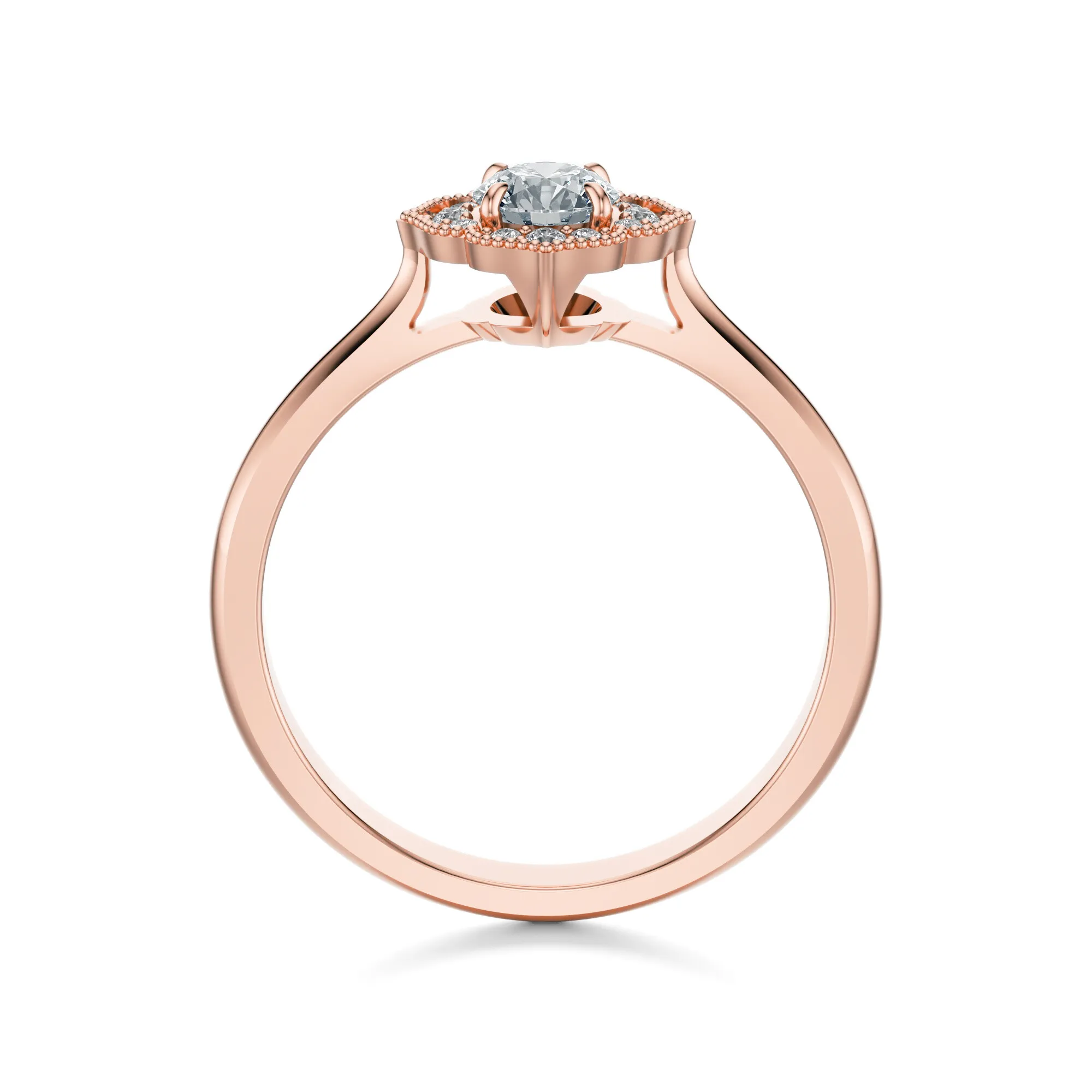 W centrum kompozycji znajduje się okrągły diament w szlifie brilliant, którego blask wzmocniony jest przez otaczające go mniejsze kamienie. W standardzie oferujemy parametry: czystość VS2, barwa H, szlif Excellent i masa 0.30, 0.40, 0.50 lub 0.70ct. Parametry mogą być dostosowane do indywidualnych życzeń klienta, co pozwala na pełną personalizację pierścionka.