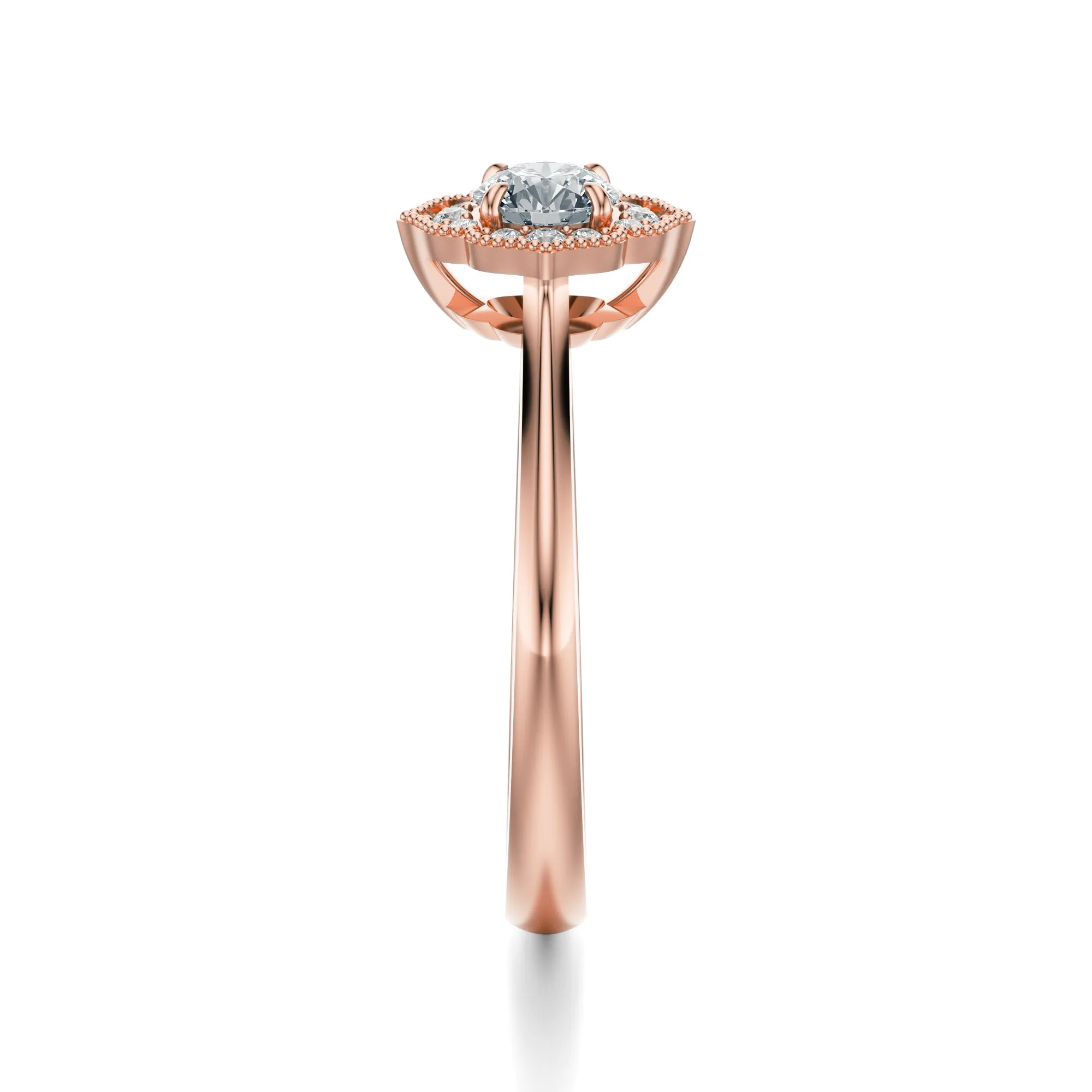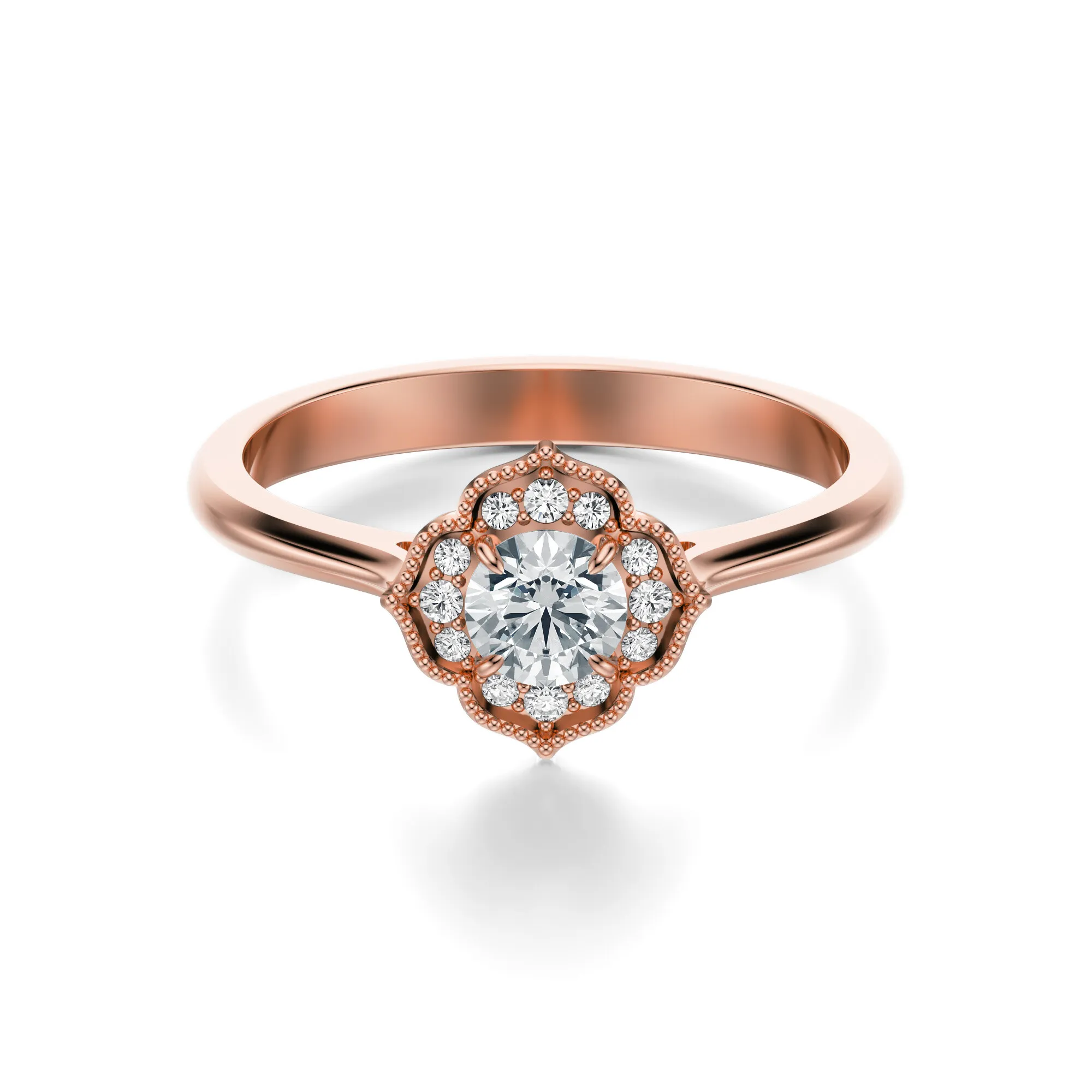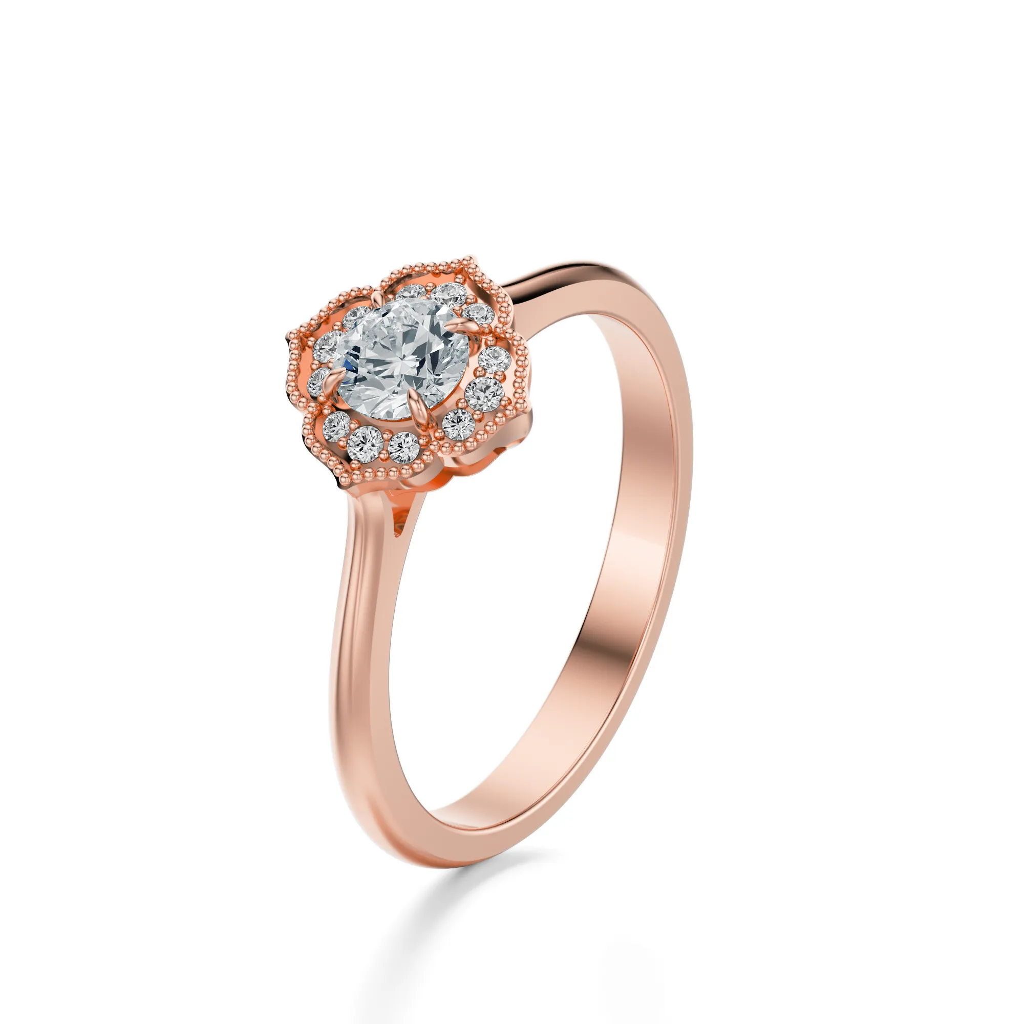 Ten wyjątkowy pierścionek z różowego złota o próbie 585 urzeka subtelną elegancją i romantycznym wdziękiem. Jego projekt zachwyca delikatnością formy i intensywnym blaskiem diamentów, które tworzą harmonijną kompozycję przypominającą rozkwitający kwiat. Główna część ozdobna to lśniący, okrągły diament otoczony koroną mniejszych kamieni osadzonych w misternie profilowanej oprawie.