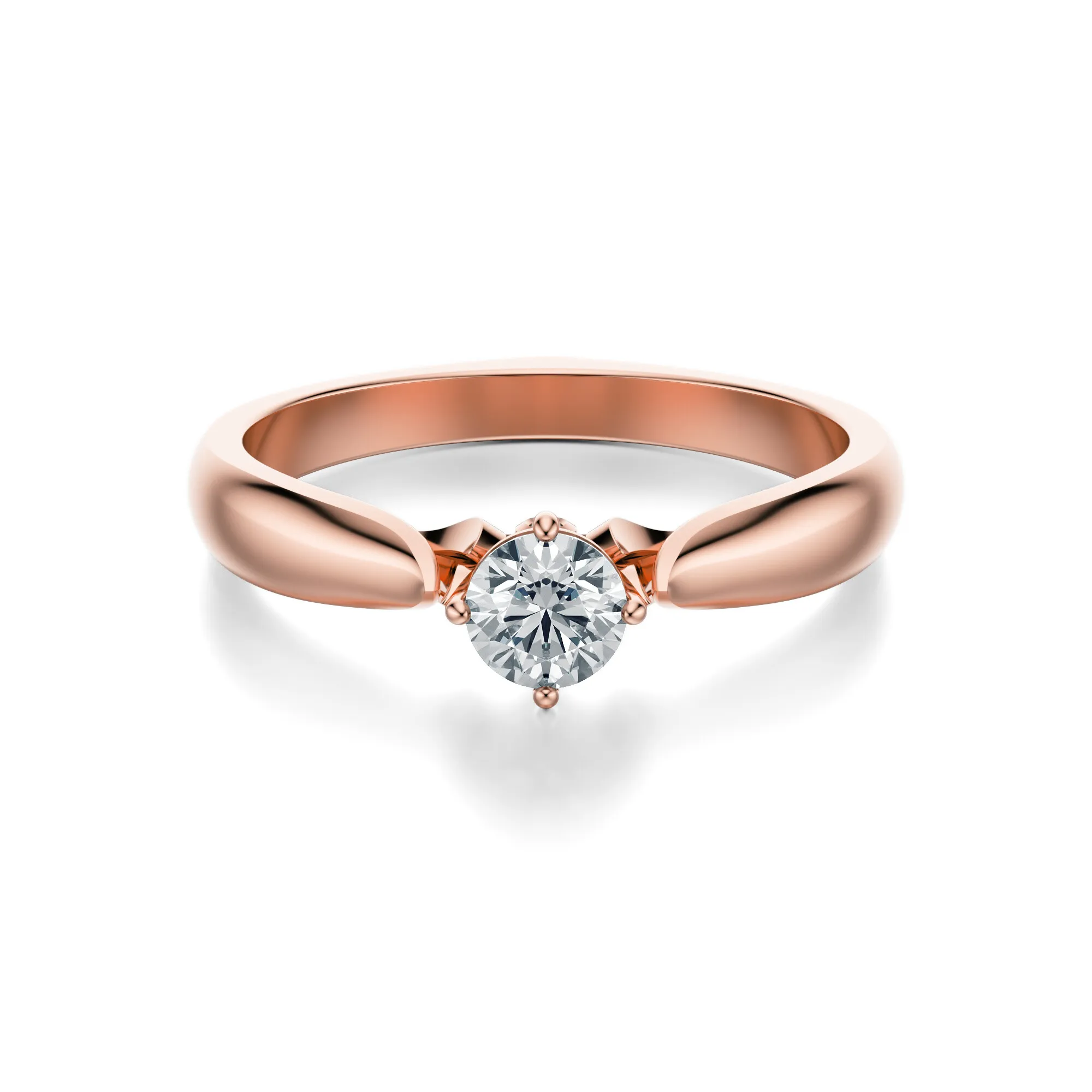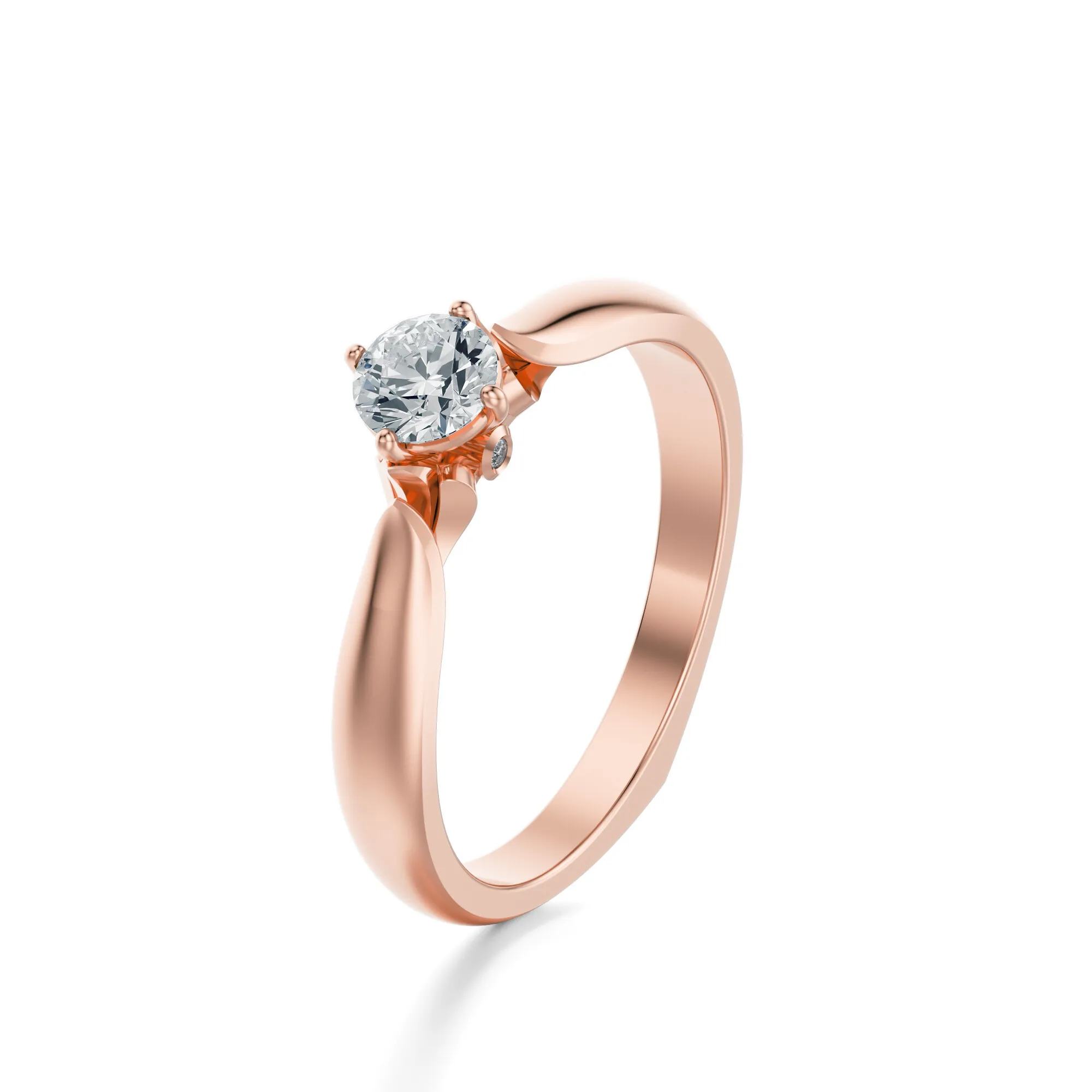 Ten wyjątkowy pierścionek z różowego złota o próbie 585 zachwyca subtelnością i romantycznym blaskiem. Harmonijne połączenie delikatnie skręconej obrączki i centralnego diamentu tworzy projekt o wyrafinowanej lekkości. Elegancki i ponadczasowy, idealnie wpisuje się w estetykę nowoczesnej klasyki. Okrągły diament, osadzony w smukłej koronie, przyciąga wzrok intensywnym blaskiem, a dwa mniejsze kamienie boczne podkreślają jego wyjątkowość.