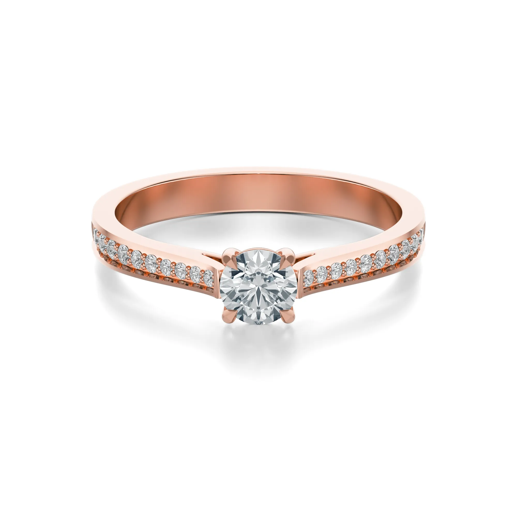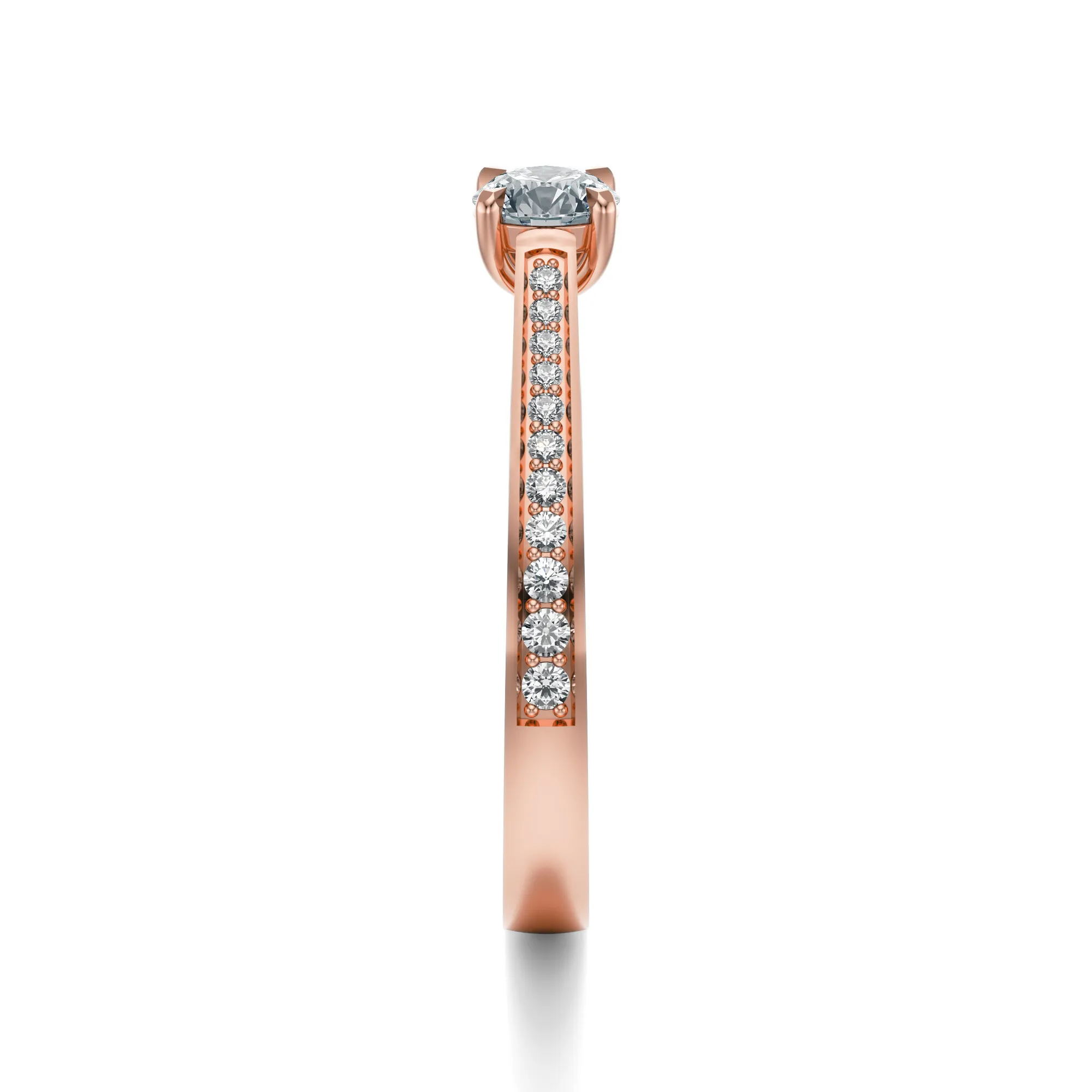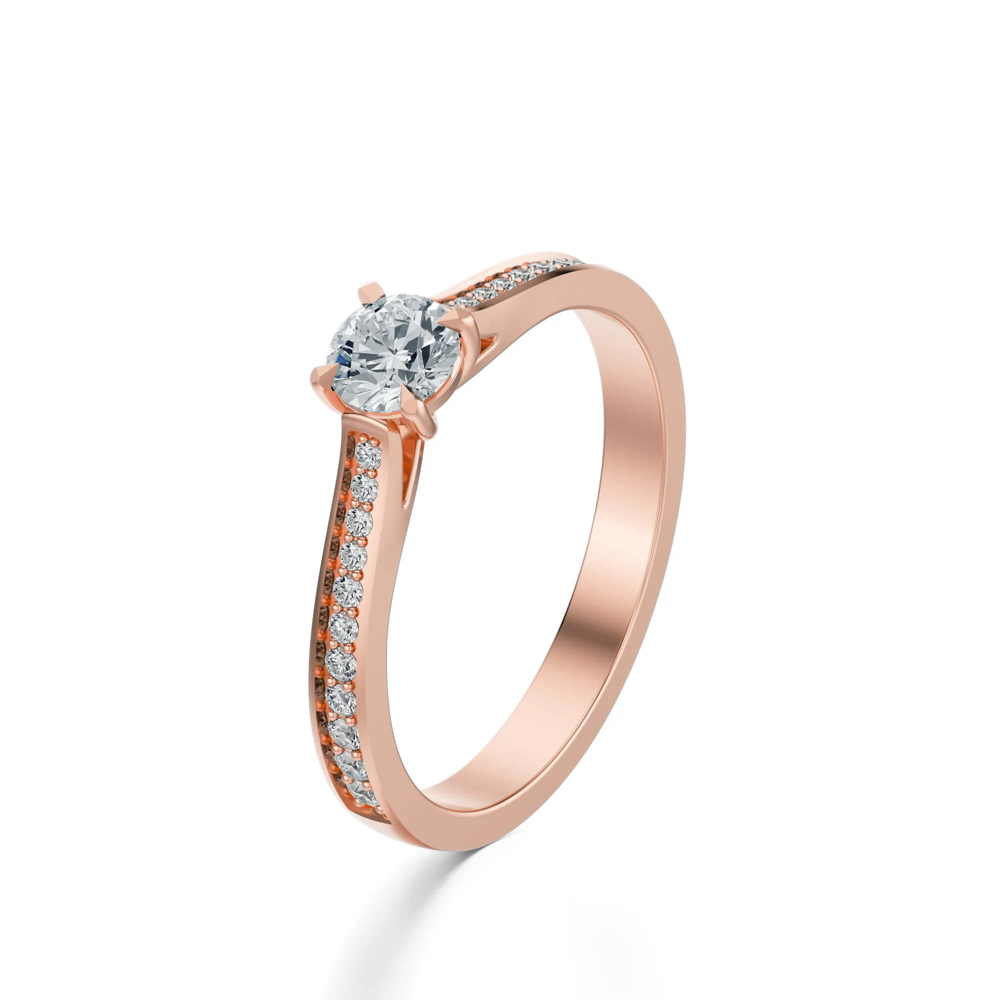 Ten zachwycający pierścionek z różowego złota to esencja subtelnej elegancji i ponadczasowego piękna. Wykonany ze złota o próbie 585, przyciąga uwagę ciepłym, różanym odcieniem metalu, który harmonijnie współgra z intensywnym blaskiem okrągłych diamentów. Jego wyrafinowany projekt łączy klasyczne inspiracje z nowoczesnym wyczuciem formy, tworząc biżuterię o wyjątkowym charakterze.