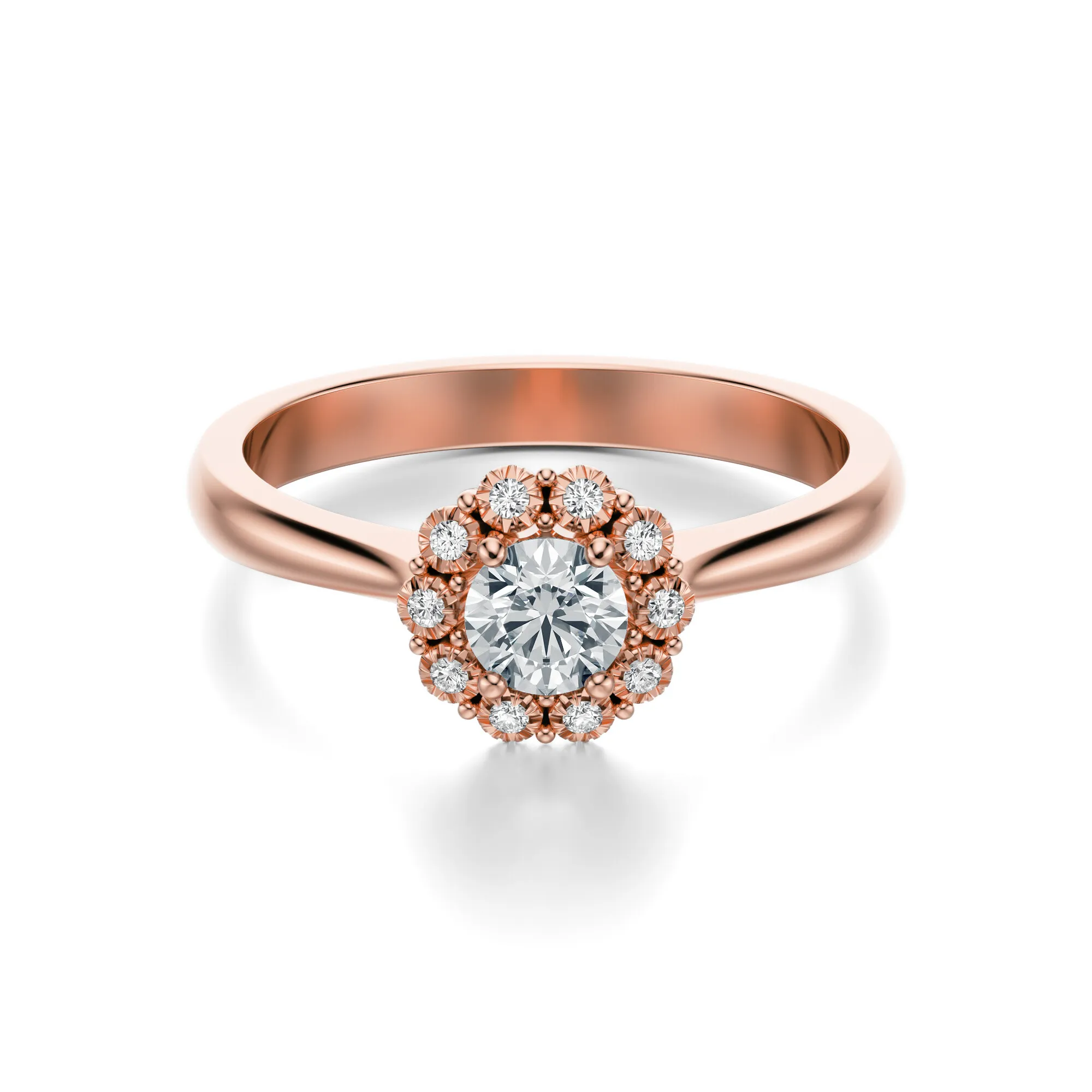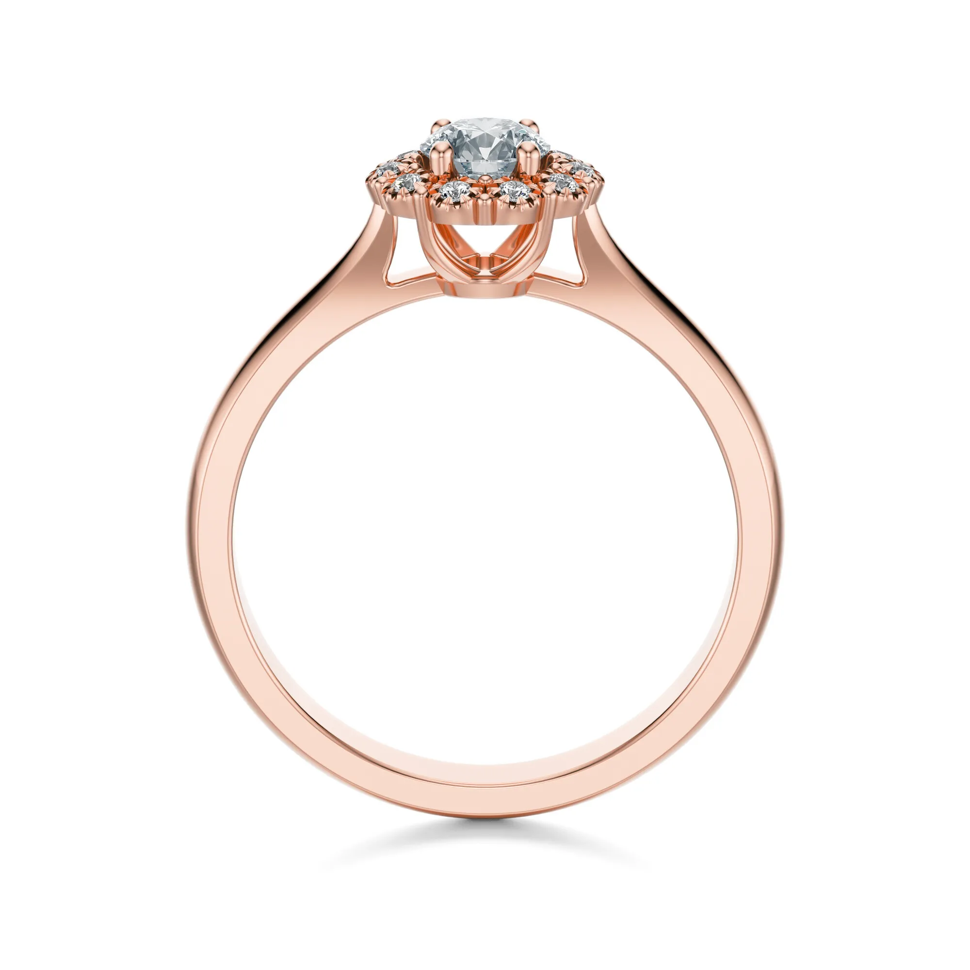 Zjawiskowy pierścionek z różowego złota z diamentami to esencja romantyzmu i ponadczasowej elegancji. Jego wyważony design przyciąga wzrok subtelnym blaskiem i finezyjnym wykończeniem. Wykonany ze złota o próbie 585 w odcieniu delikatnego różu, zachwyca kobiecą formą i wyrafinowanym stylem. Okrągły diament w centrum otoczony został lśniącym wieńcem mniejszych kamieni, co nadaje całości wyjątkowego charakteru.