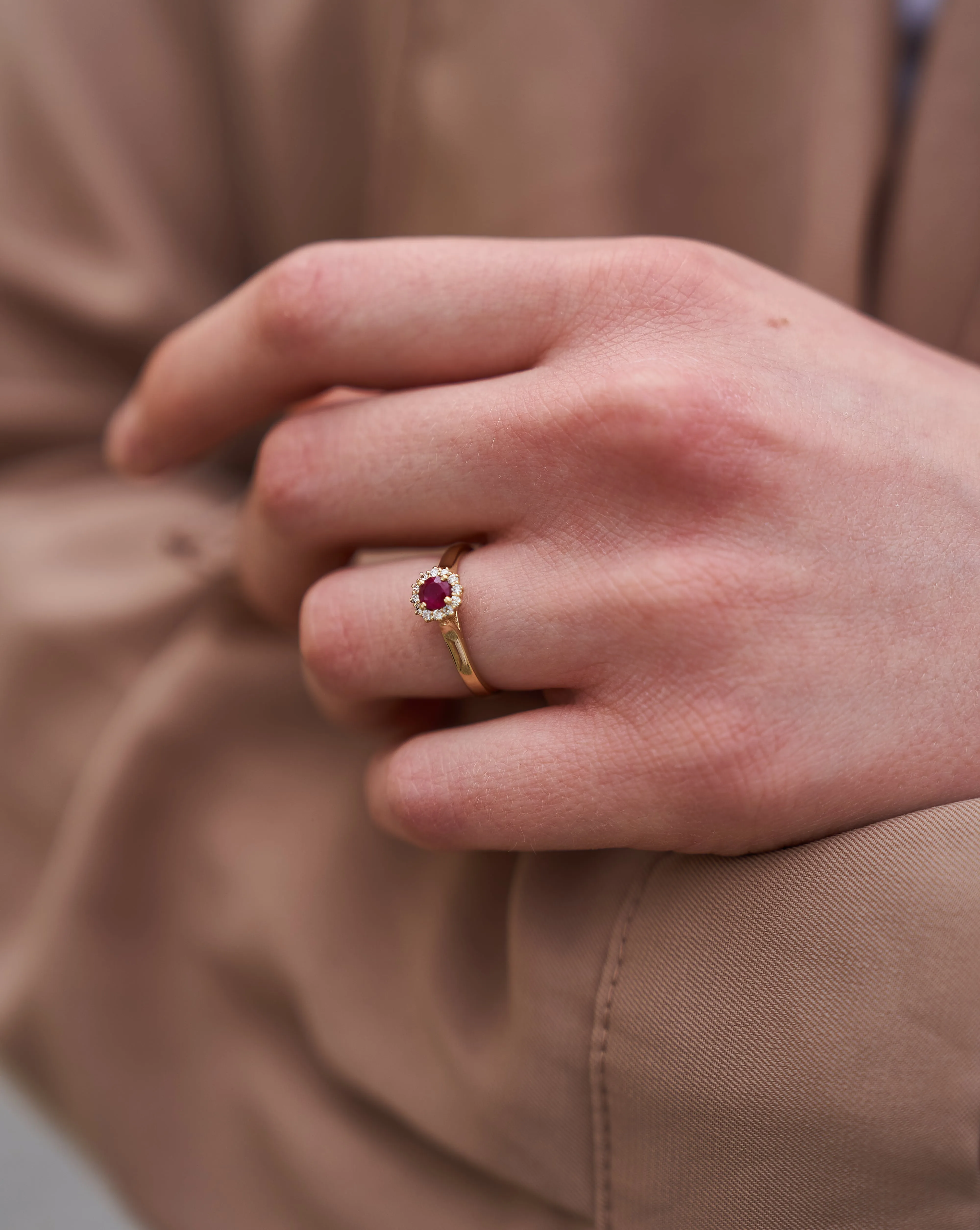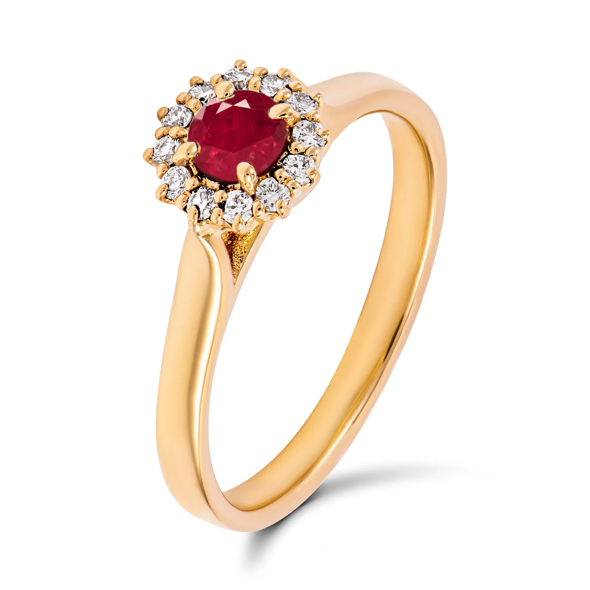 Idealnie okrągły rubin, osadzony w centrum gładkiej obrączki z klasycznego żółtego złota, otoczony jest dwunastoma mniejszymi diamentami. Dopracowany szlif rubinu oraz klasyczny diamentowy szlif brylantów to tajemnica nieskończonego blasku tego pięknego pierścionka.