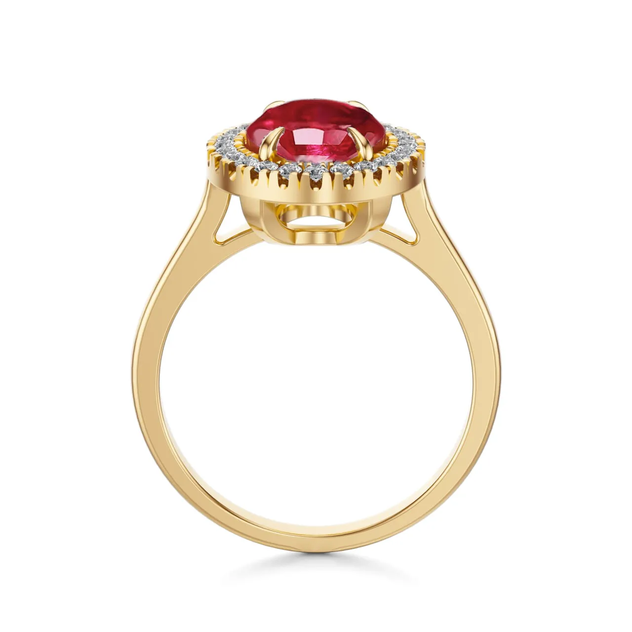 Ten wyjątkowy pierścionek z rubinem i diamentami to kwintesencja luksusu i elegancji. Wykonany z najwyższej jakości złota, przyciąga wzrok intensywną czerwoną barwą rubinu, która symbolizuje miłość i pasję. Diamenty o brylantowym szlifie nadają blasku i świetlistości, podkreślając wyjątkowy urok czerwonego kamienia. Idealny pierścionek zaręczynowy lub na prezent dla kobiety, która ceni ponadczasowe piękno i styl. Subtelne połączenie klasyki i nowoczesności czyni ten pierścionek doskonałym wyborem na każdą okazję, dodając nuty wyrafinowania każdej stylizacji. Świetnie komponuje się z kolczykami z rubinami i delikatnym naszyjnikiem z diamentem, tworząc harmonijny i elegancki zestaw.