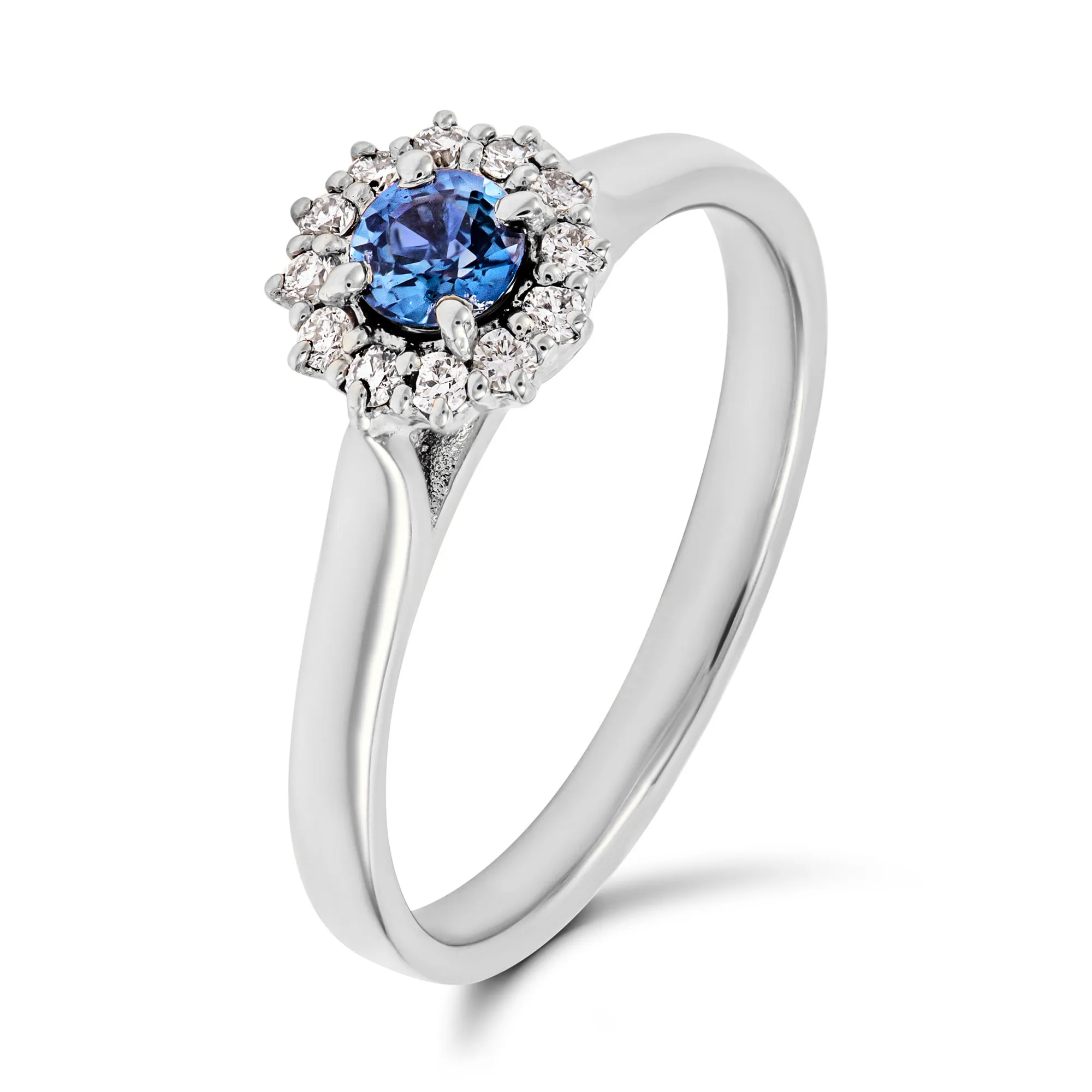 Ten projekt dedykowany jest miłośnikom białego złota. Bardzo kobiecy, subtelny wzór i nietuzinkowa forma pozwala na wyrażenie swojego gustu i pasji do piękna oryginalnej, autorskiej biżuterii. Pierścionek z niebieskim szafirem ma klasyczną formę pierścionka zaręczynowego. Gładka obrączka wykonana z białego złota rozwidla się ku punktowi centralnemu, czyli drobnym diamentom okalającym niewielkich rozmiarów szafir. Ciekawy projekt obrączki to nie wszystko. Spoglądając z boku można zauważyć designerskie rozwiązanie proponowane przez Blue Topaz, czyli oprawę uformowaną w kształt podstawy kwiatu. Razem z koroną pierścionka całość zachwyca delikatnością, ale również oryginalnością.