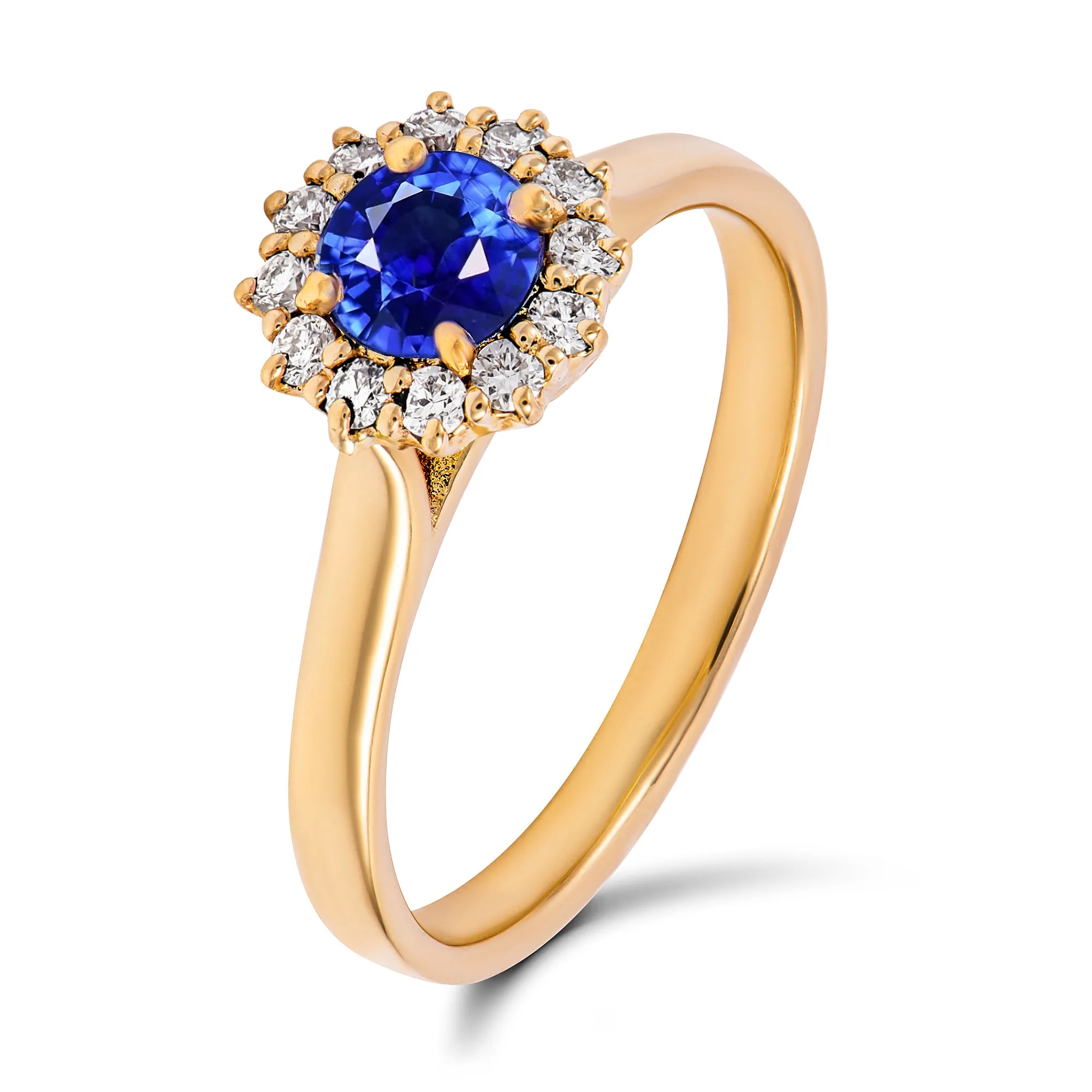 Ukłon klasyce to z pewnością standardowa, gładka obrączka z żółtego złota, oraz oprawa w tym samym kolorze. Kolejnym elementem nawiązującym do tradycyjnej formy pierścionka jest centralny kamień - w tym modelu duży, niebieski szafir otoczony drobnymi diamentami wokół. Całość jest idealnym pierścionkiem na prezent, a także pierścionkiem zaręczynowym.