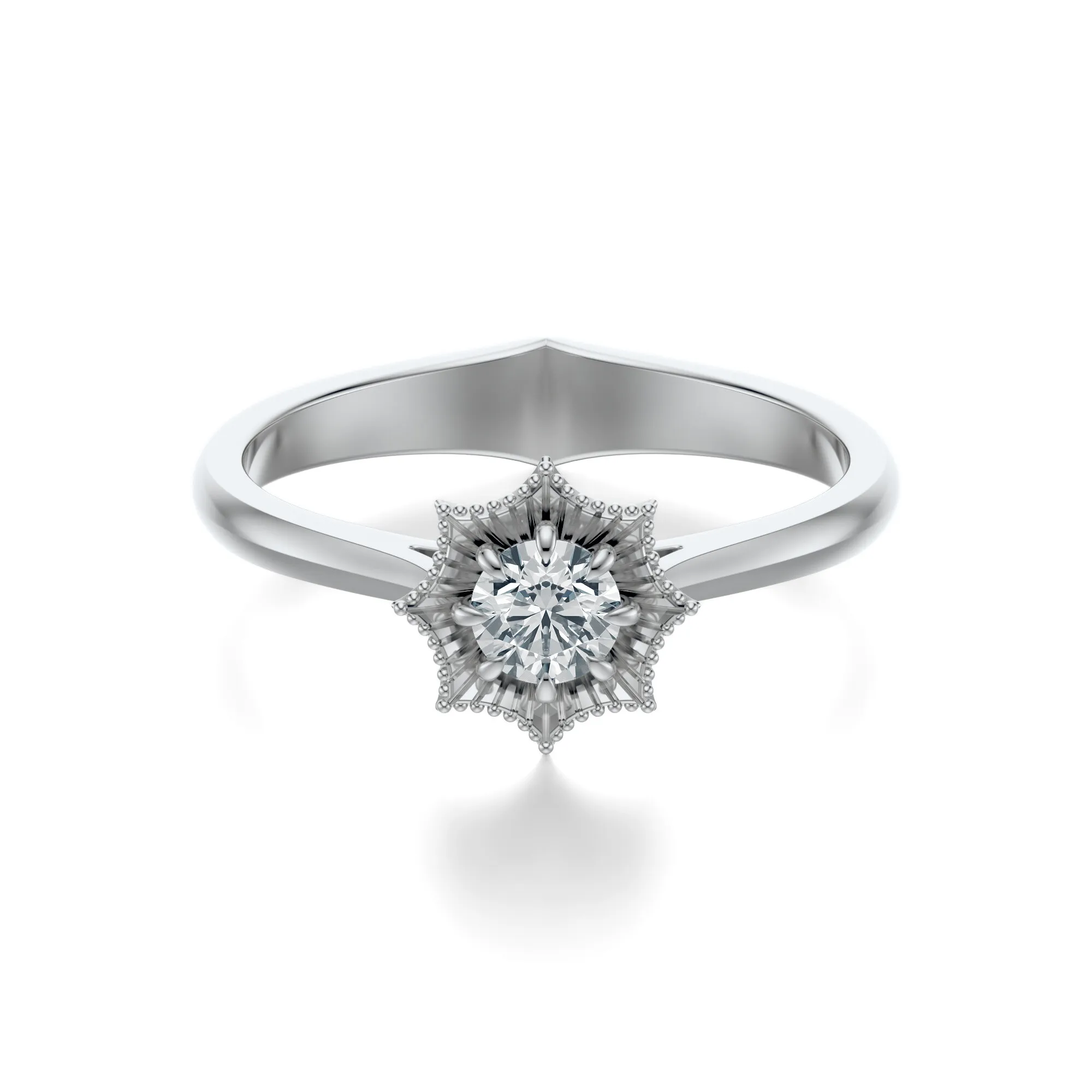 Oprawa diamentu w formie stylizowanego kwiatu, wykonana z precyzją i dbałością o detale, nadaje pierścionkowi artystyczny charakter i ponadczasową elegancję. Zestawienie białego złota z lśniącym diamentem podkreśla nowoczesny, ale i romantyczny styl. To doskonały wybór dla kobiet, które poszukują wyjątkowej biżuterii o głębszym znaczeniu – wyrażającej zarówno trwałość, jak i delikatność uczucia.
