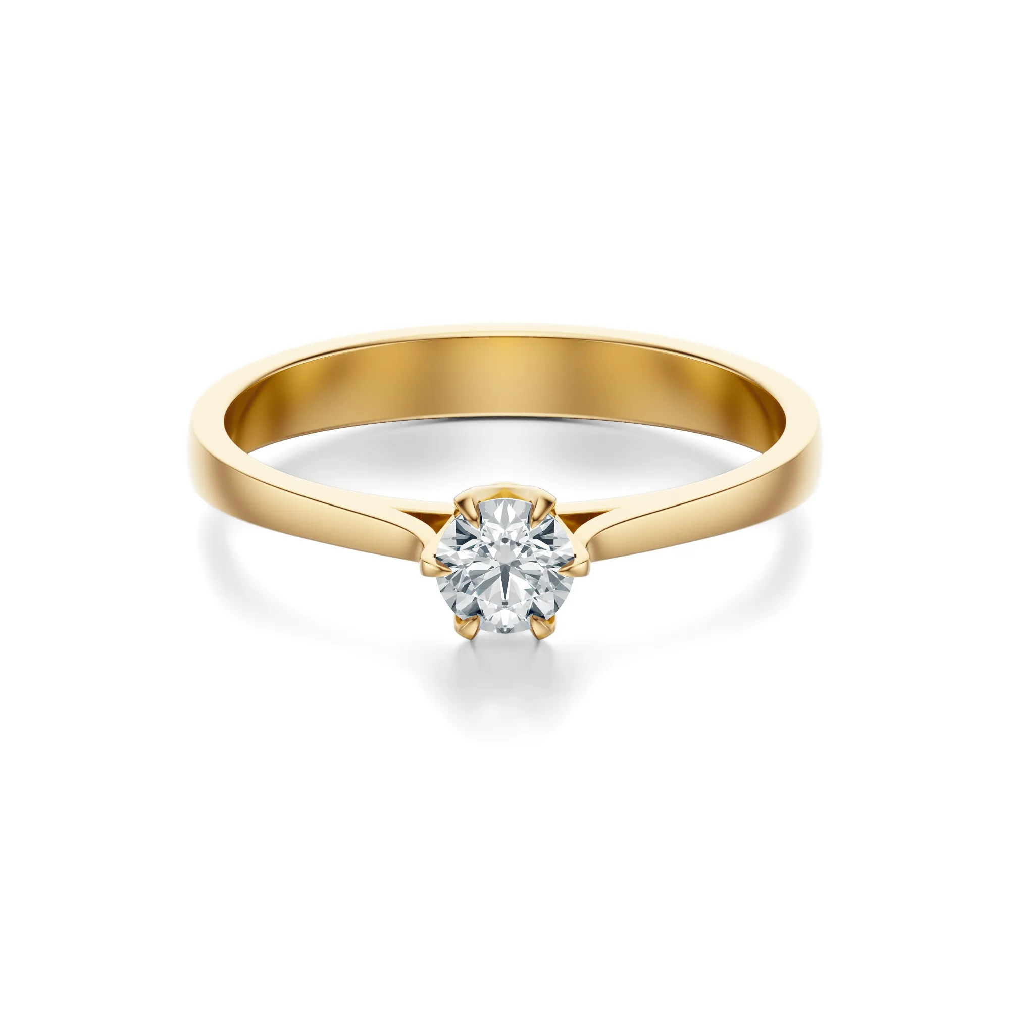Ten złoty pierścionek zaręczynowy z diamentem to połączenie ponadczasowej elegancji i nowoczesnej subtelności. Wykonany ze złota o próbie 585 w ciepłym odcieniu żółtego koloru, zachwyca prostotą formy i luksusowym wykończeniem. Centralnie osadzony, okrągły diament przyciąga uwagę intensywnym blaskiem i wyjątkową przejrzystością, nadając biżuterii wyrafinowany charakter.