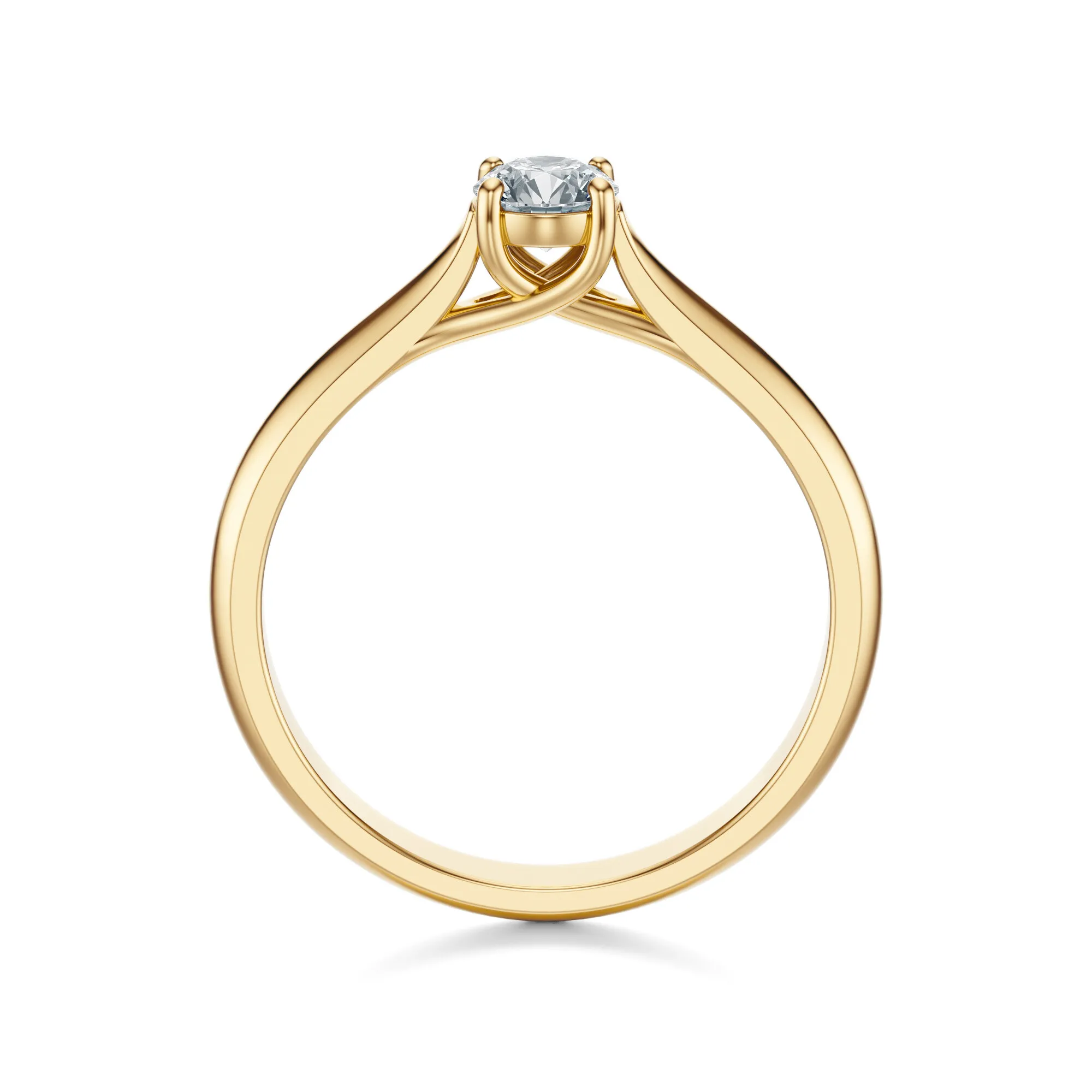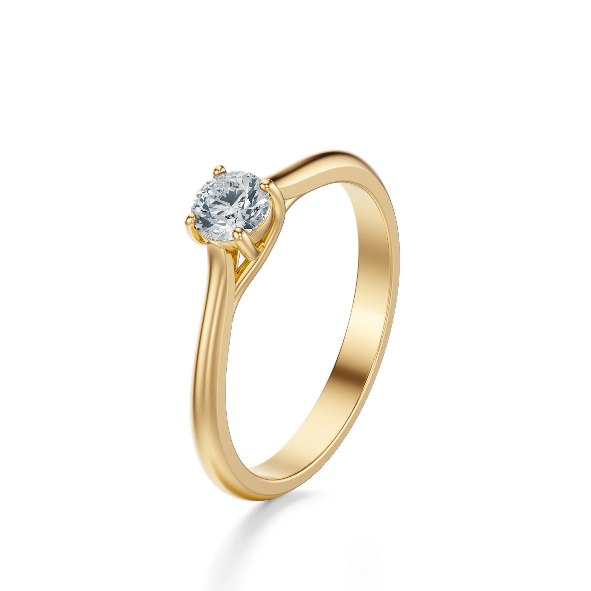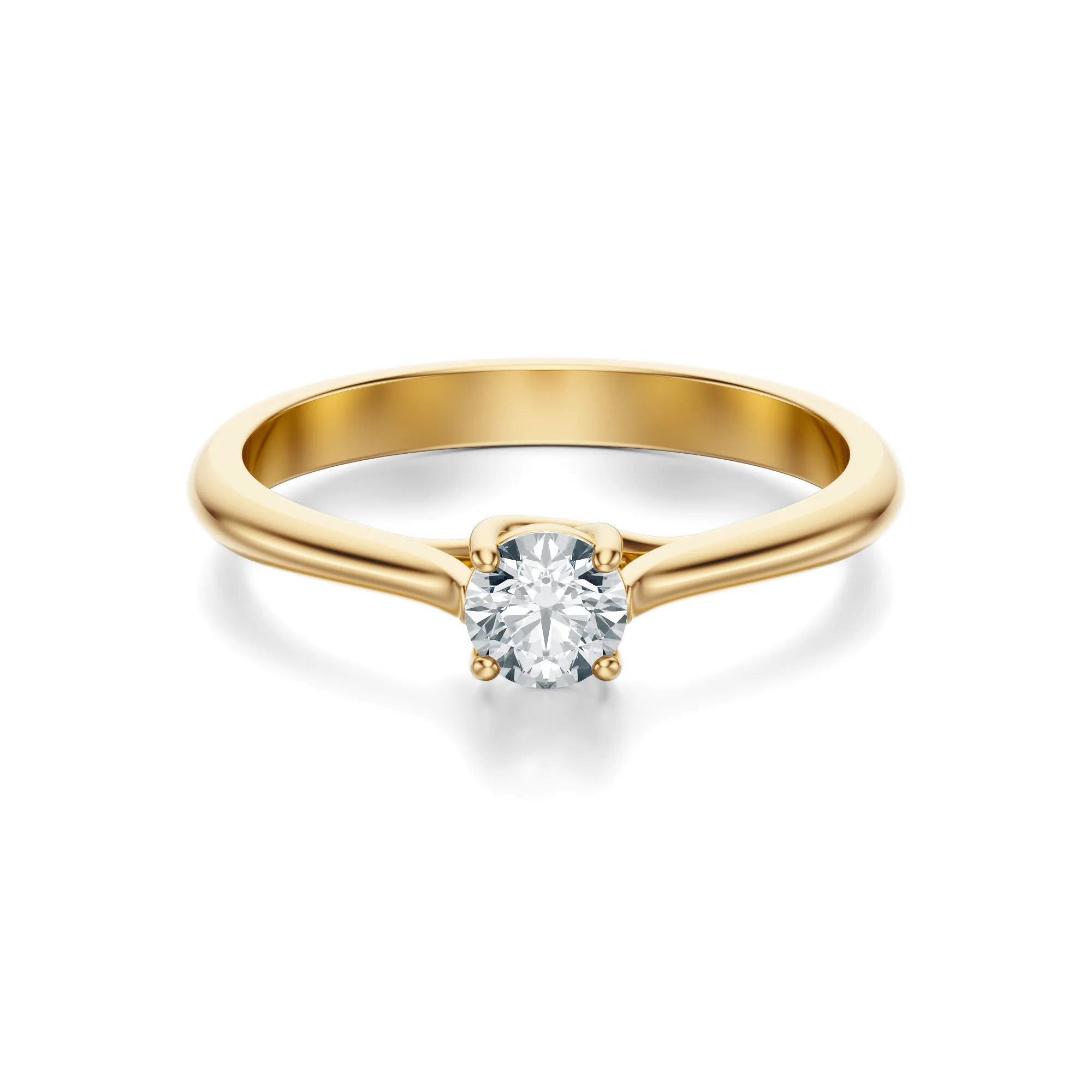 Ten wyjątkowy pierścionek zaręczynowy zachwyca szlachetną prostotą i ponadczasową elegancją. Wykonany ze złota o próbie 585 w ciepłym odcieniu żółtego złota, łączy klasyczny charakter z nowoczesną lekkością. Centralnie osadzony okrągły diament emanuje intensywnym blaskiem, przyciągając wzrok i podkreślając wyjątkowość każdej chwili.