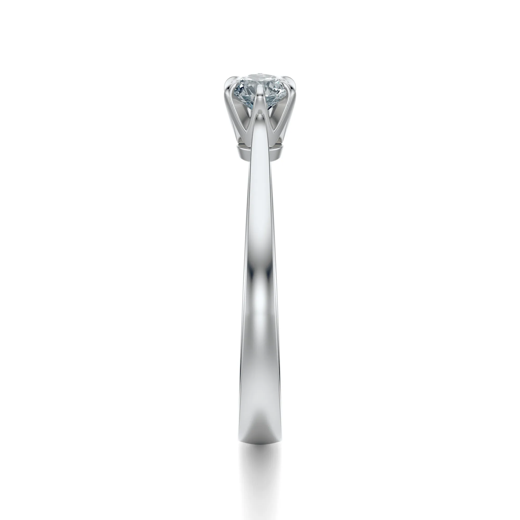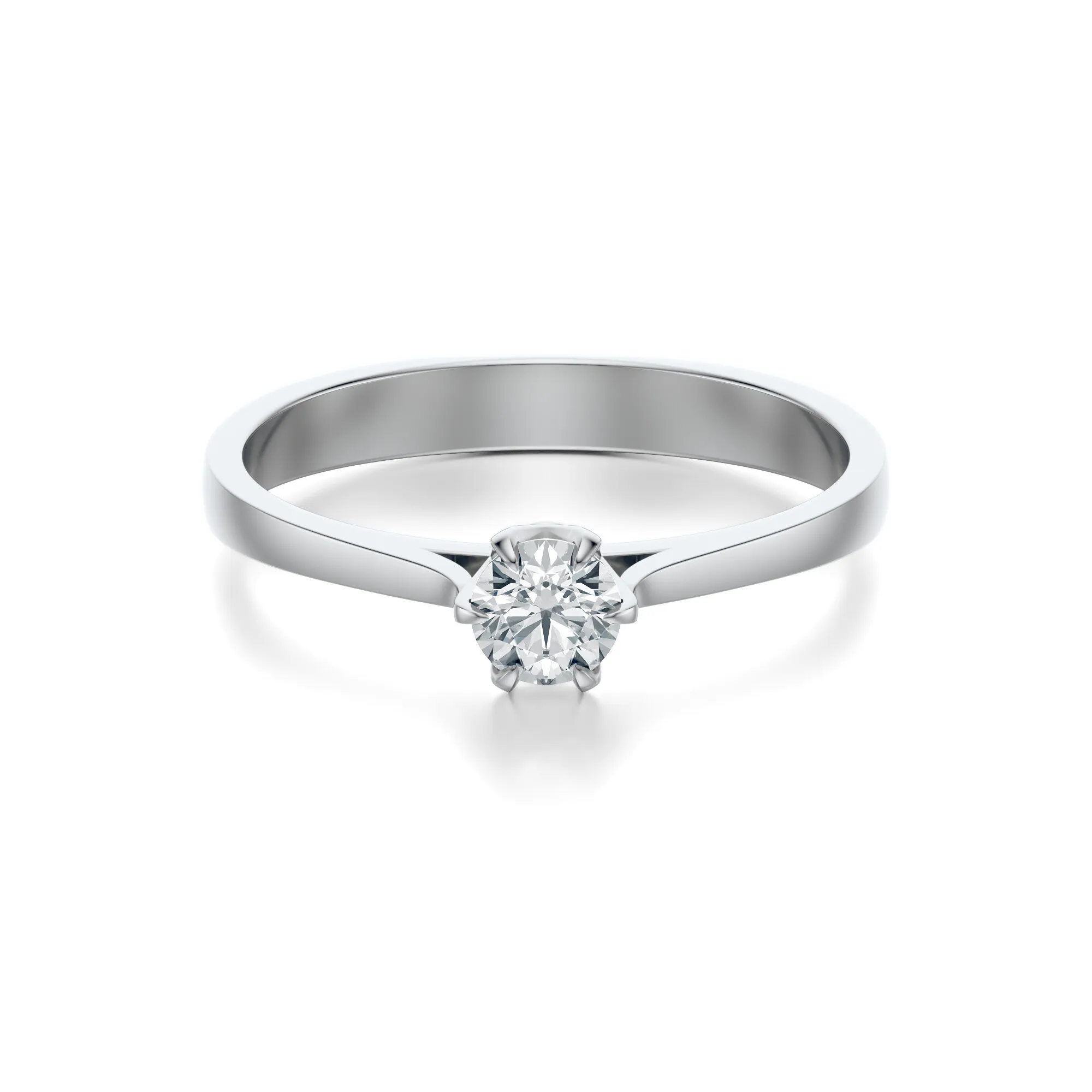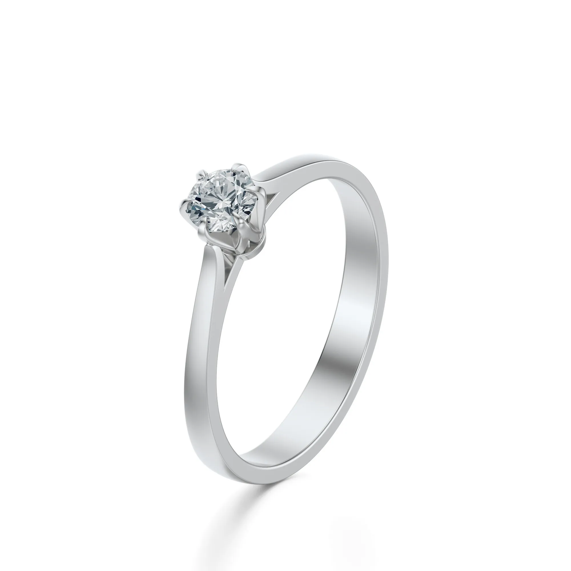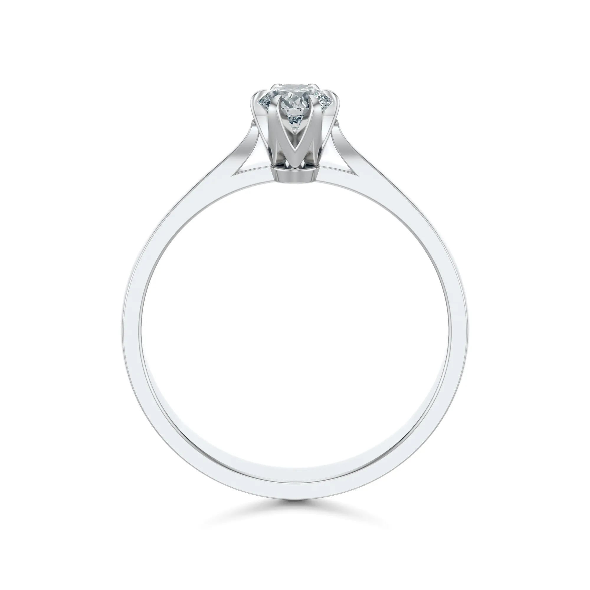 W centrum pierścionka znajduje się pojedynczy, okrągły diament, zamocowany w klasycznej koronie z sześcioma łapkami. Takie ułożenie eksponuje kamień w pełni, pozwalając mu łapać światło pod każdym kątem. To idealna propozycja dla osób, które cenią minimalistyczny styl i ponadczasowy charakter biżuterii. Symbolika diamentu – trwałość, wierność i czystość intencji – czyni ten pierścionek doskonałym wyborem na zaręczyny lub inne wyjątkowe chwile.