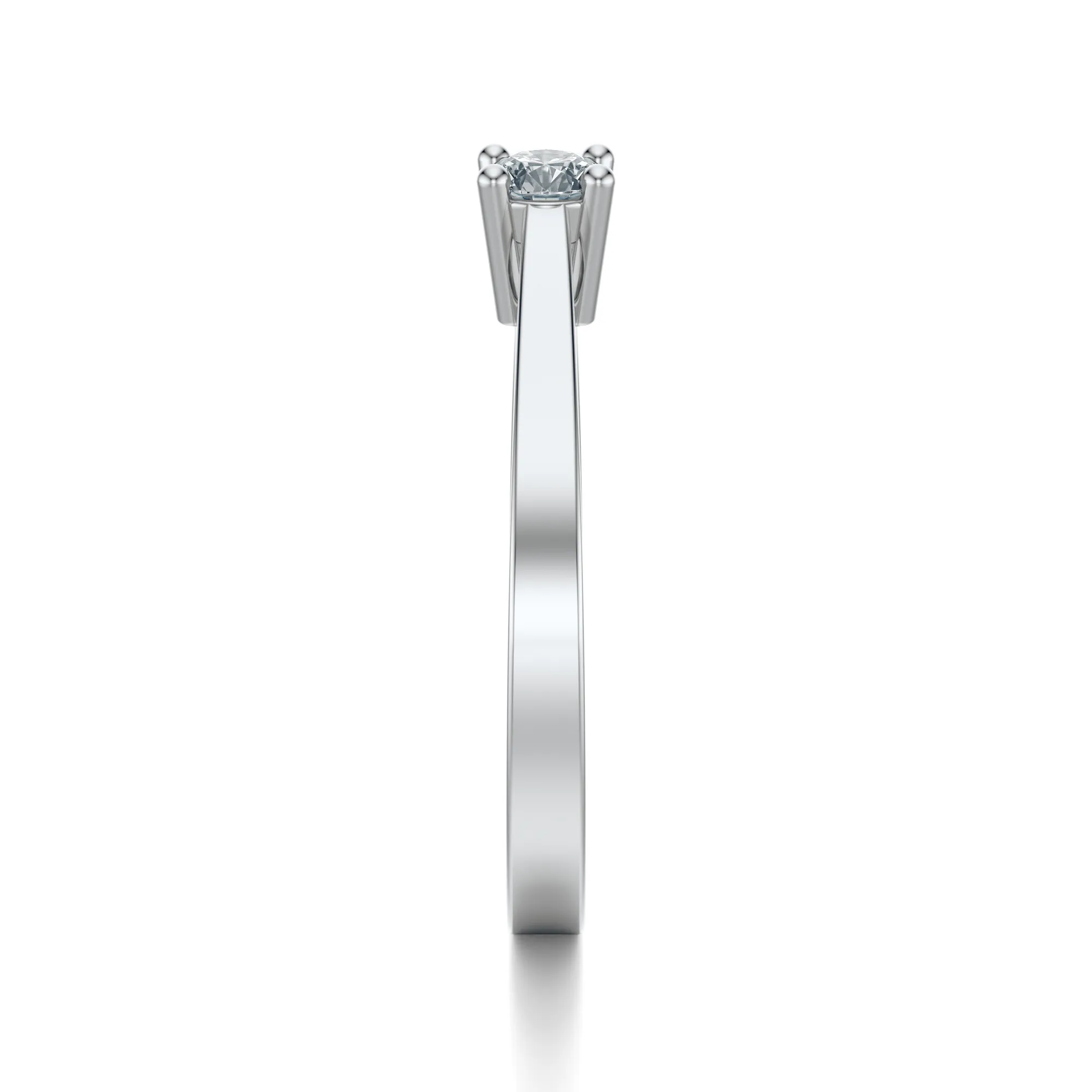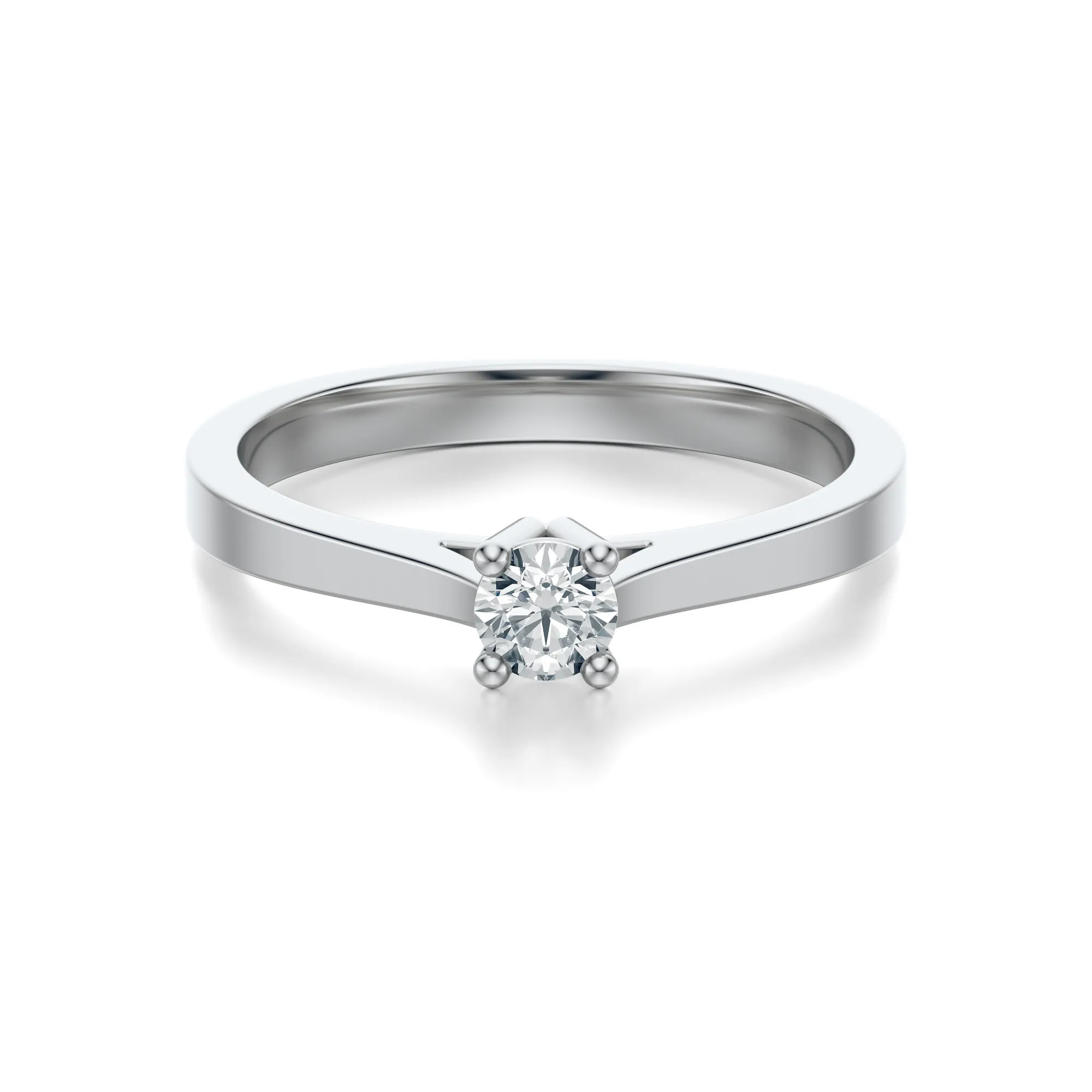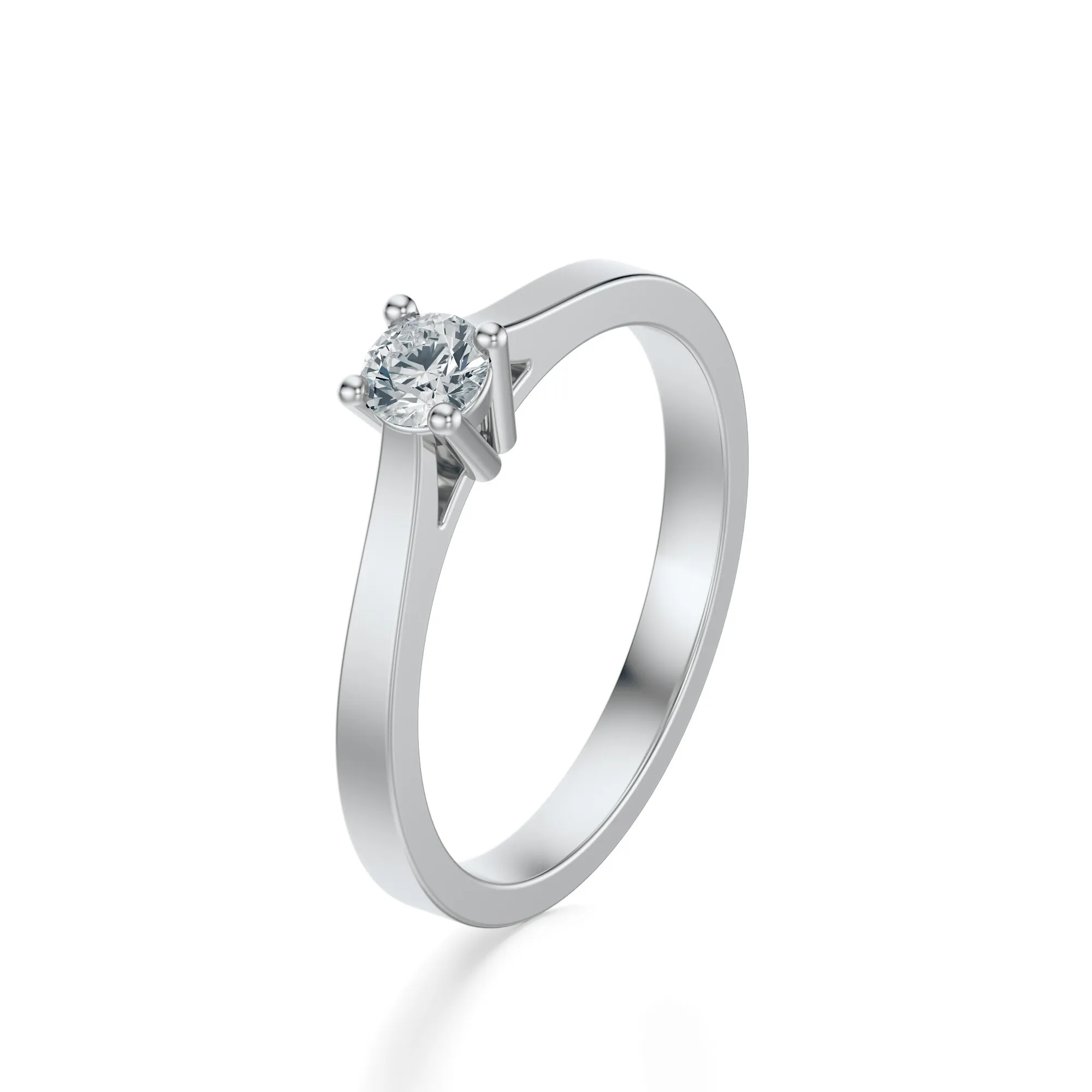 Ten pierścionek zaręczynowy z diamentem to uosobienie subtelnej elegancji i ponadczasowego piękna. Wykonany ze złota o próbie 585 w chłodnym odcieniu białego złota, emanuje nowoczesnym szykiem i szlachetnością. Centralnie osadzony diament o okrągłym szlifie przyciąga wzrok intensywnym blaskiem, który podkreśla precyzyjne, geometryczne osadzenie kamienia.