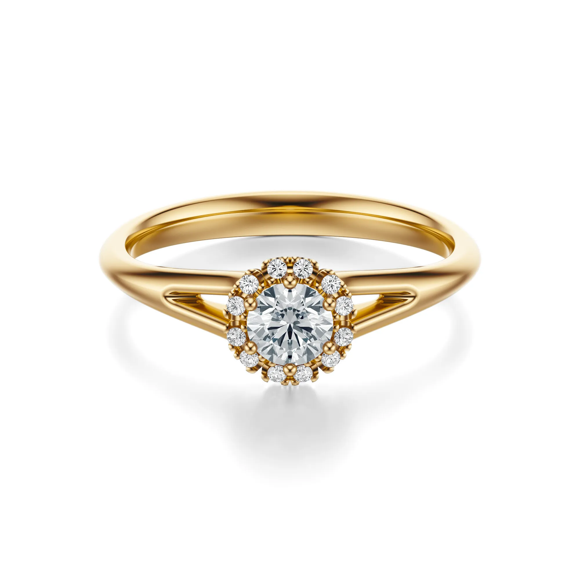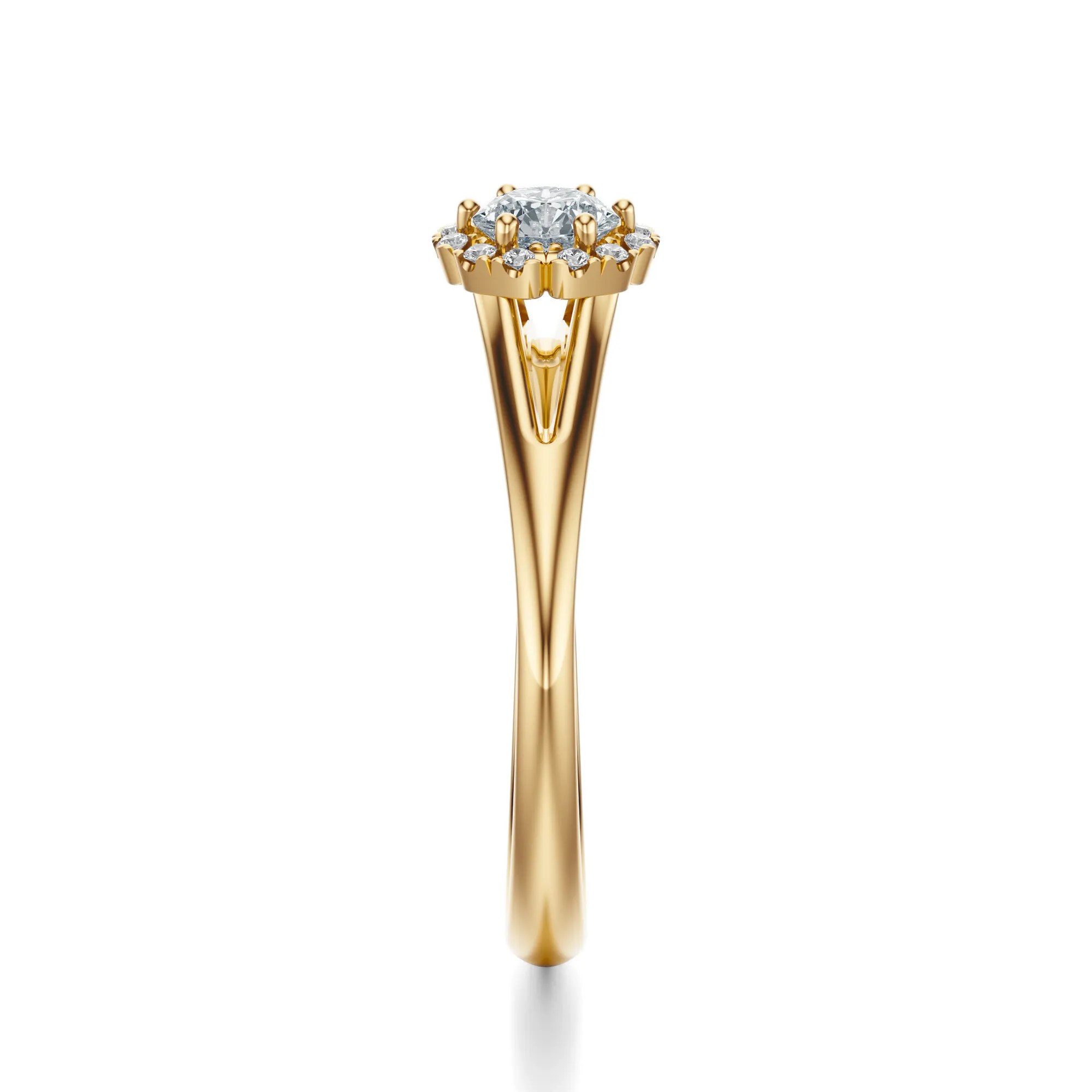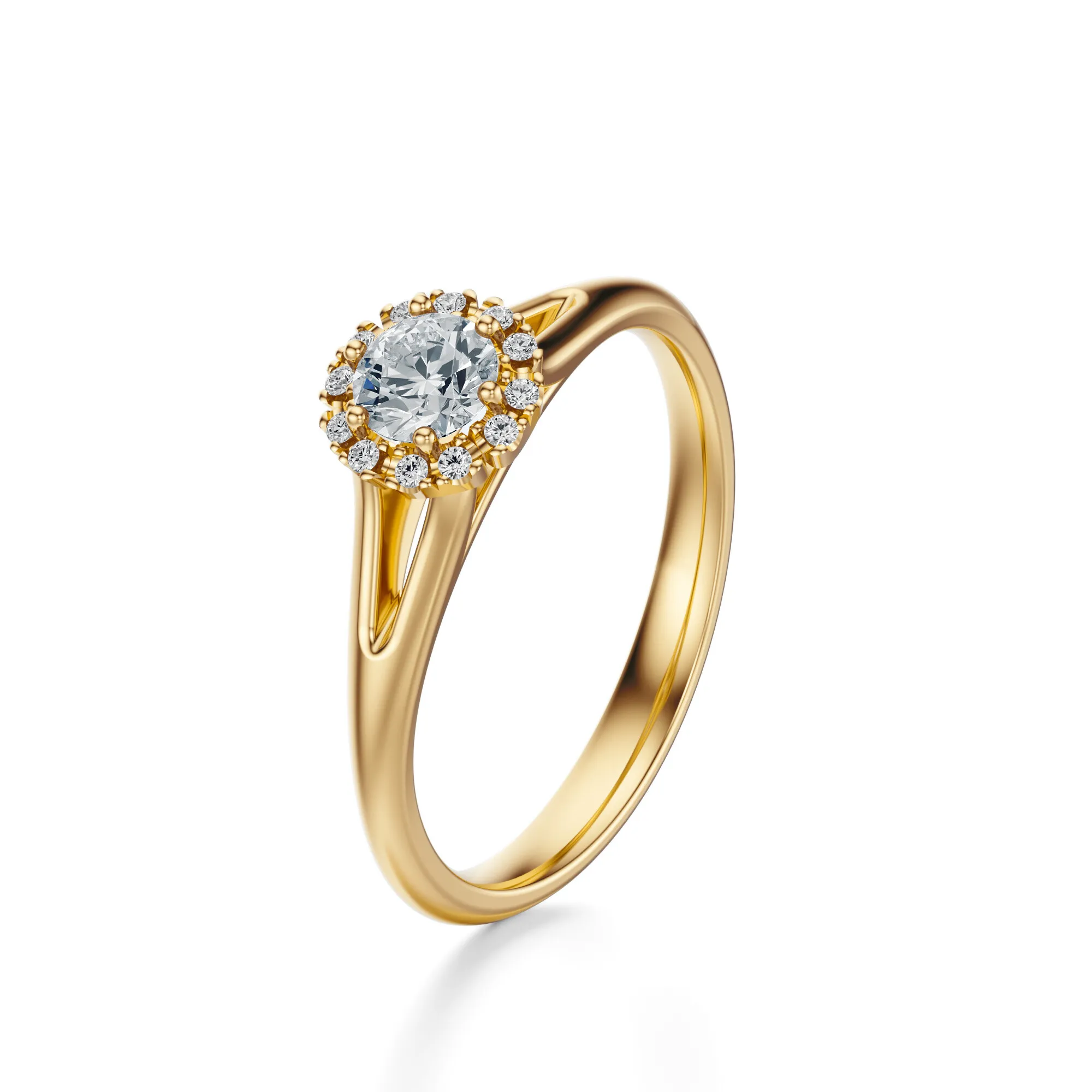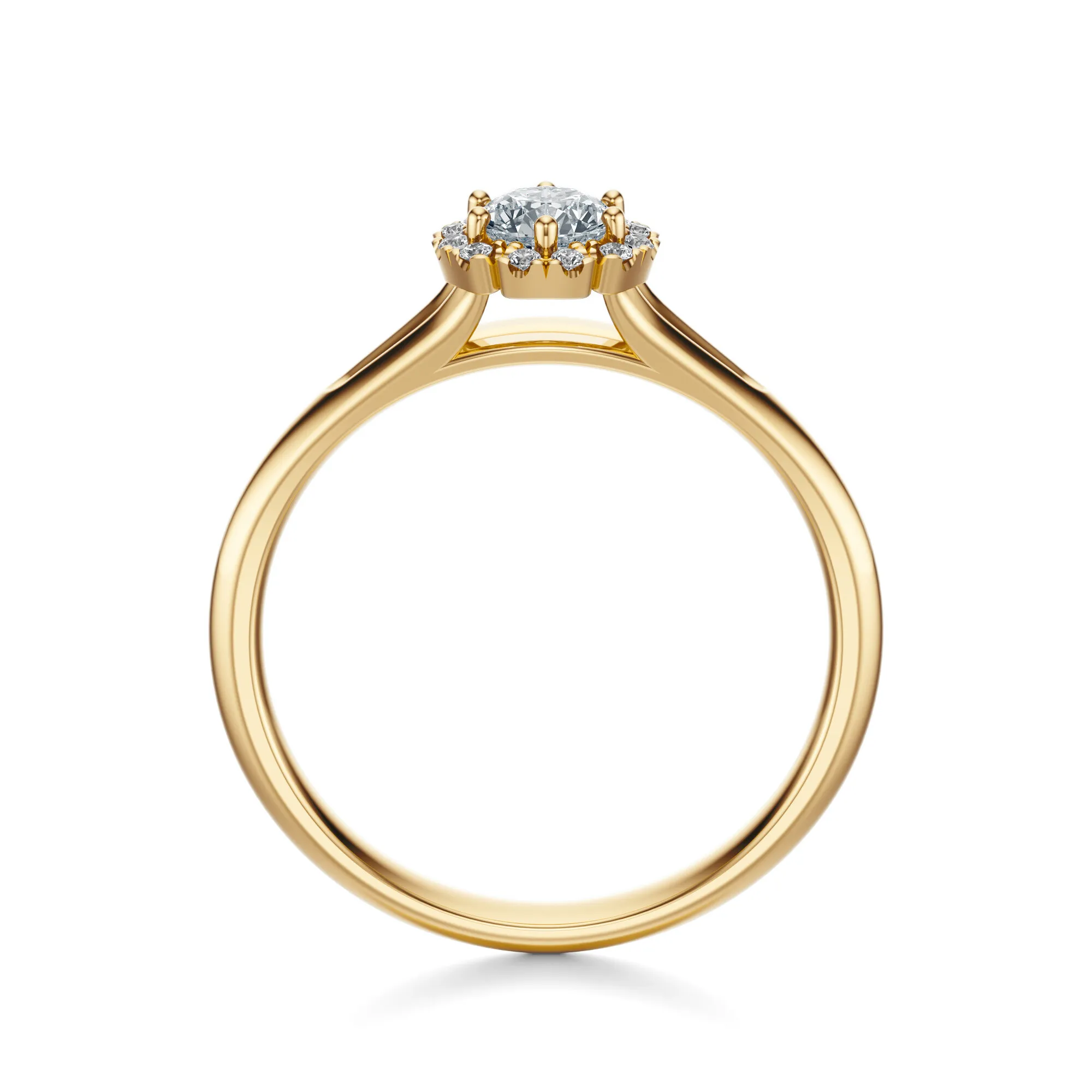 Ten elegancki pierścionek zaręczynowy wykonany ze złota o próbie 585 w ciepłym, żółtym odcieniu, zachwyca ponadczasowym wdziękiem i finezyjnym wykonaniem. Jego wyrafinowany charakter podkreśla centralny, okrągły diament otoczony subtelnym halo z mniejszych kamieni, które wspólnie tworzą efekt migoczącej korony światła. Złota obrączka z lekkim zwężeniem ku górze uwydatnia główny kamień i dodaje całej kompozycji nowoczesnej lekkości.