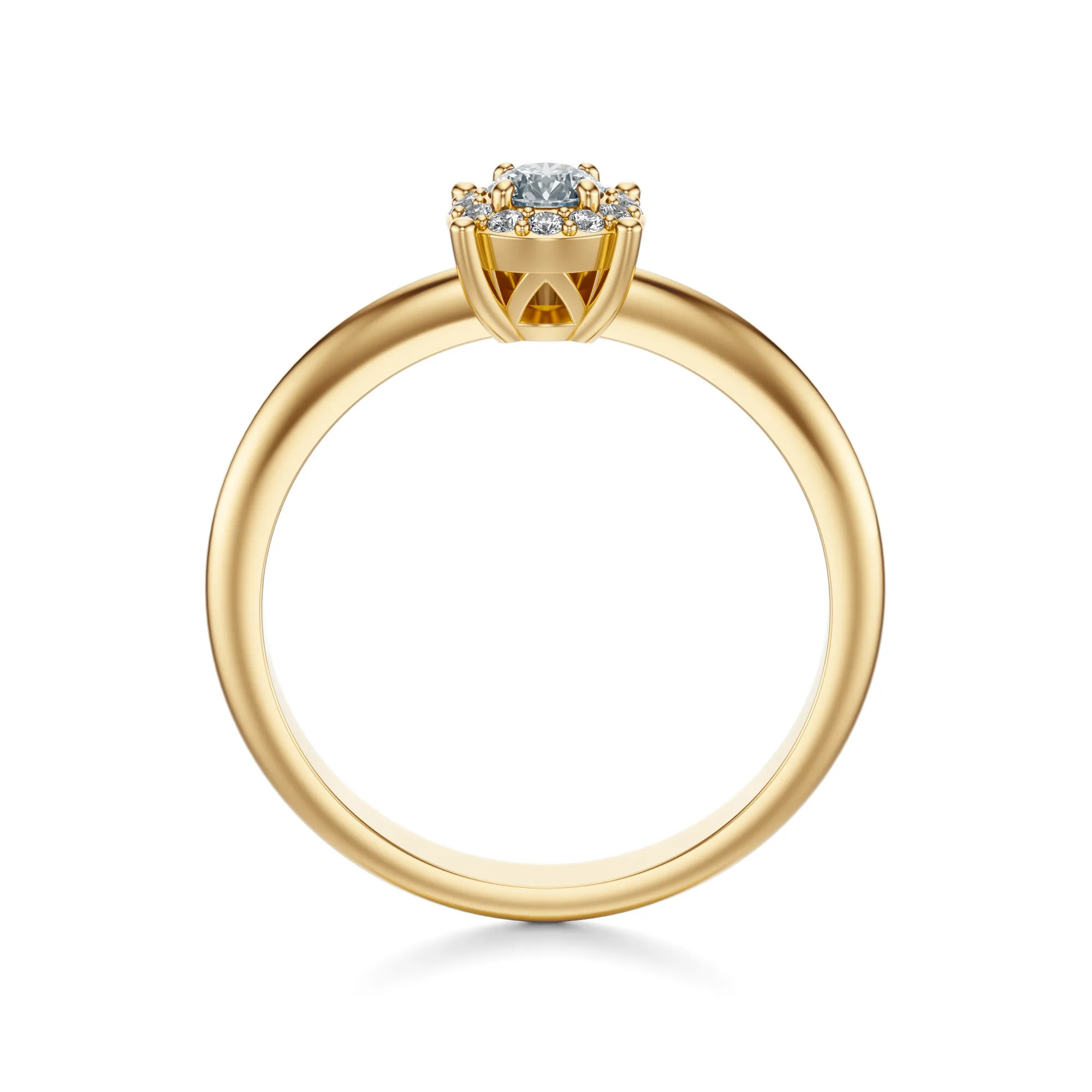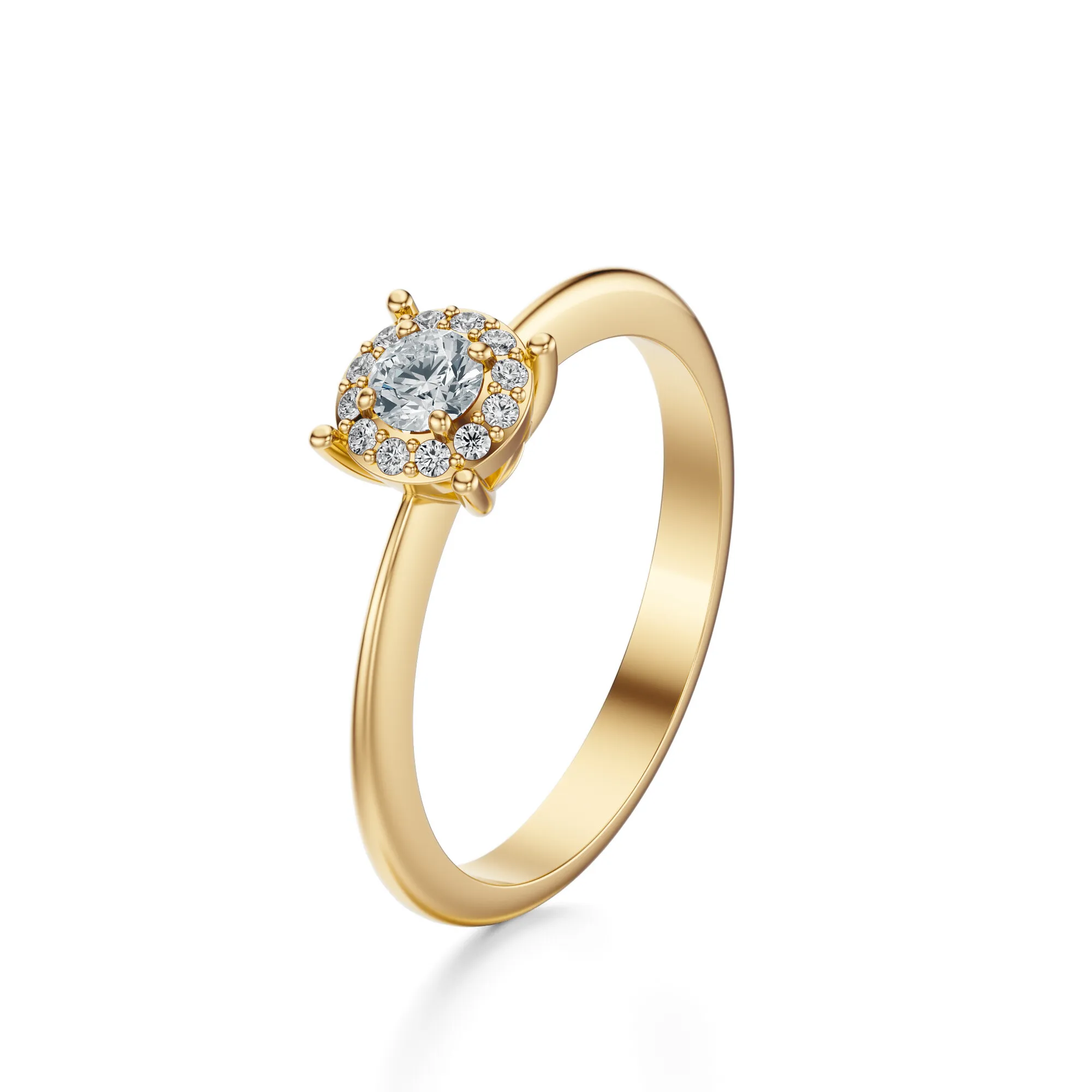Ten olśniewający pierścionek zaręczynowy wykonany ze złota o próbie 585 w kolorze klasycznego żółtego złota zachwyca wyrafinowaną formą i zmysłowym blaskiem. Centralny diament w okrągłym szlifie został otoczony subtelnym wieńcem drobnych kamieni, które tworzą efektowną kompozycję typu halo. Całość lśni intensywnym światłem, tworząc harmonijne połączenie elegancji z romantycznym charakterem.