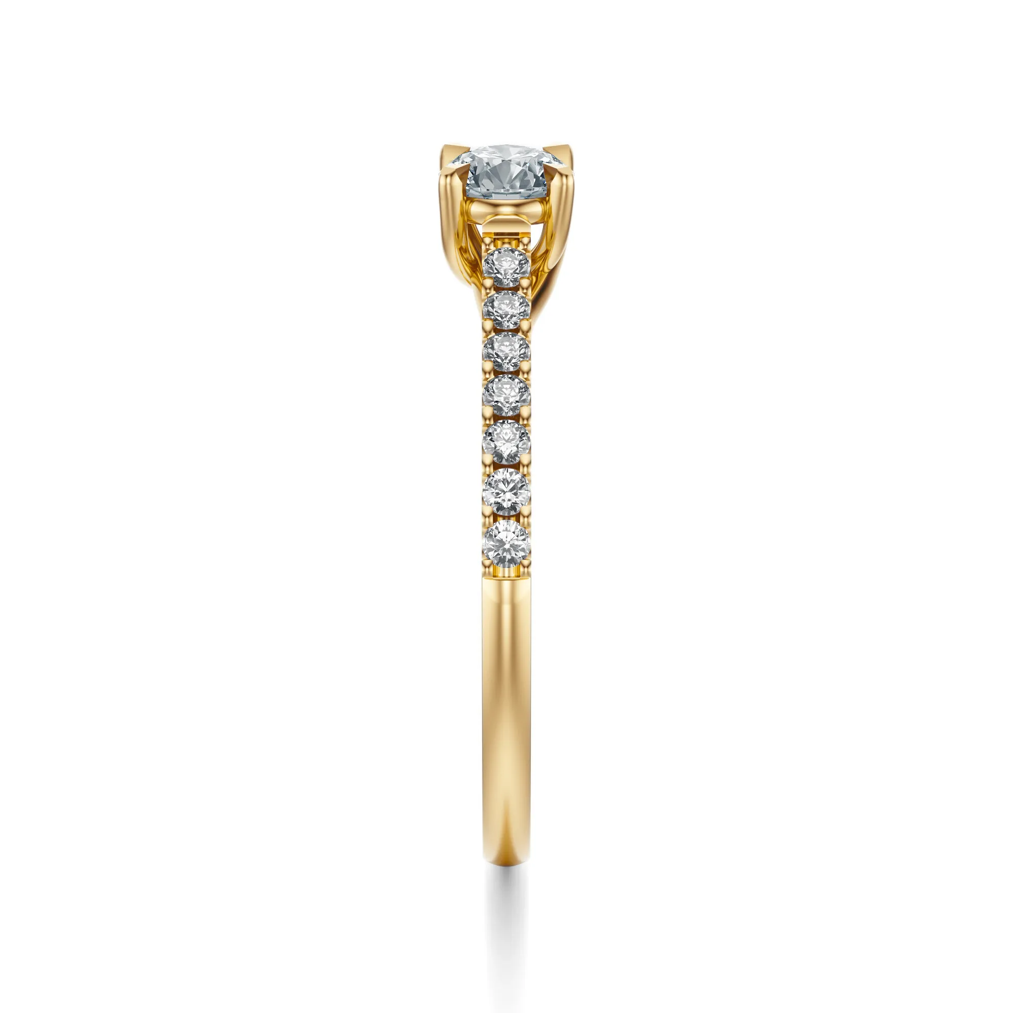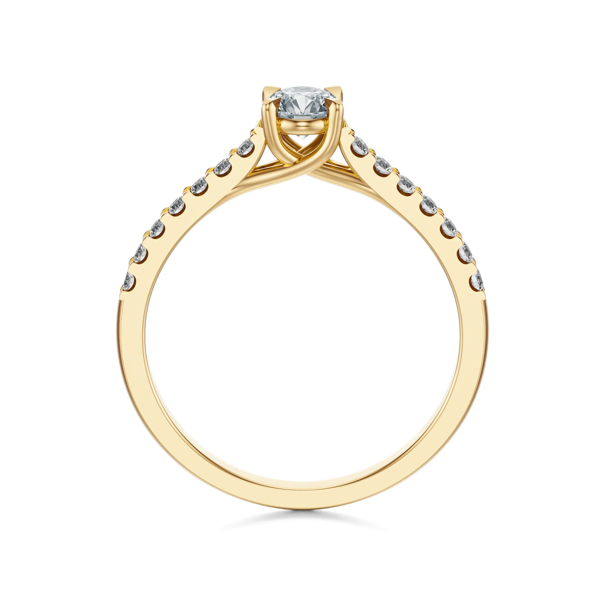 Ten wyjątkowy pierścionek zaręczynowy z żółtego złota o próbie 585 emanuje subtelną elegancją i ponadczasowym urokiem. Centralny, okrągły diament o intensywnym blasku stanowi serce kompozycji, a delikatny rząd mniejszych kamieni wzdłuż obrączki dodaje całości lekkości i finezji. To projekt, który łączy klasykę z nowoczesnym wyrafinowaniem.