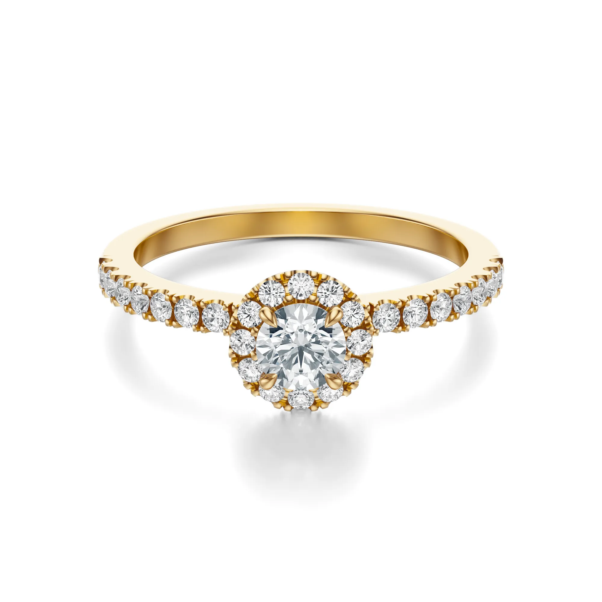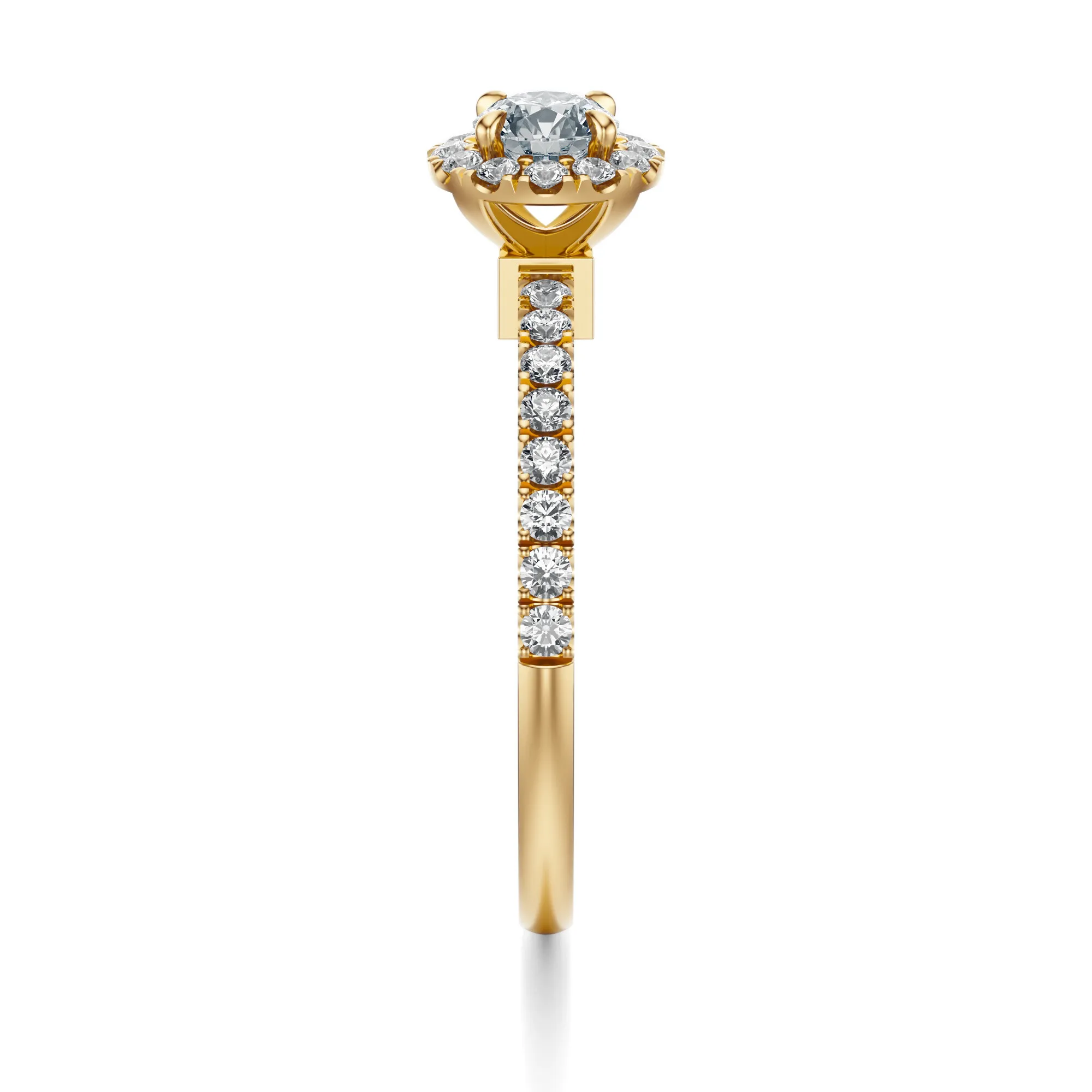 Ten olśniewający pierścionek zaręczynowy wykonany ze złota o próbie 585 w ciepłym odcieniu żółci to kwintesencja klasyki z nutą luksusu. Okrągły diament centralny otoczony jest subtelnym halo z drobnych kamieni, które potęgują jego blask i przyciągają spojrzenia. Całość osadzona została na precyzyjnie zdobionej obrączce, której powierzchnię zdobią równo rozmieszczone, mniejsze diamenty.