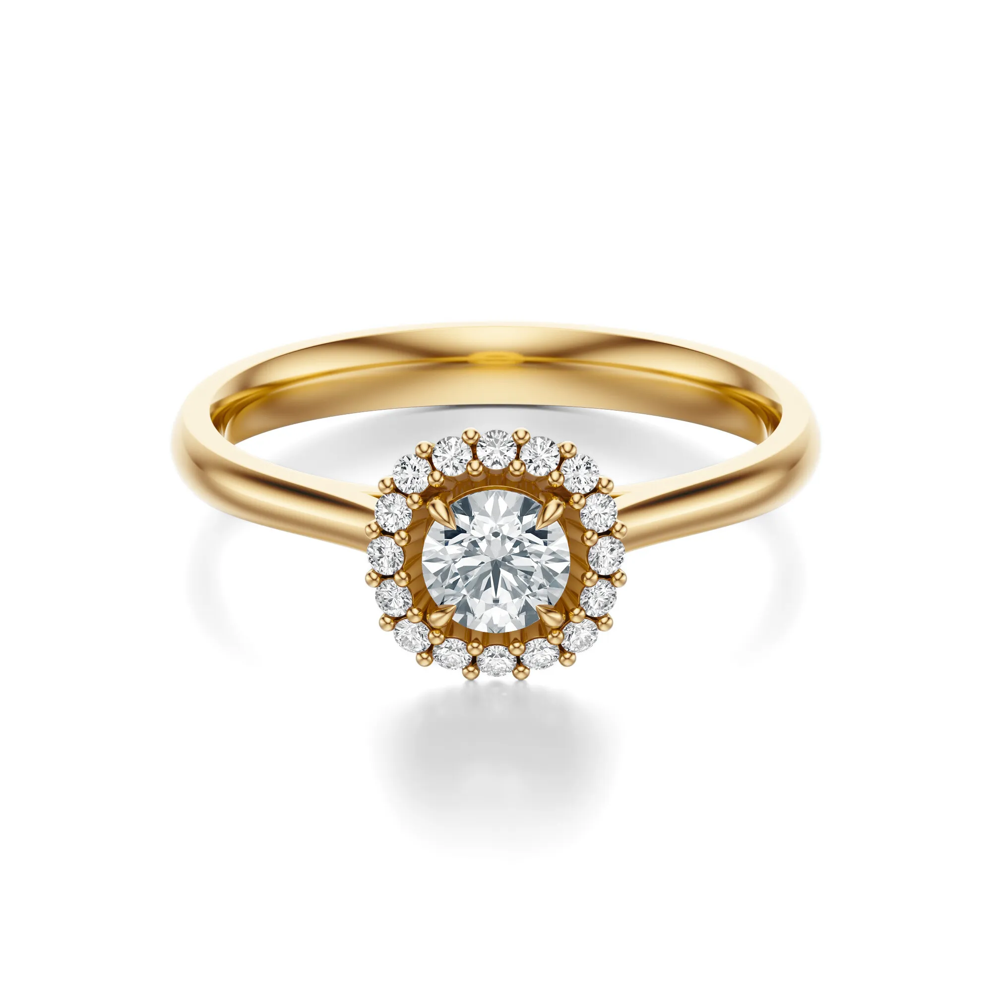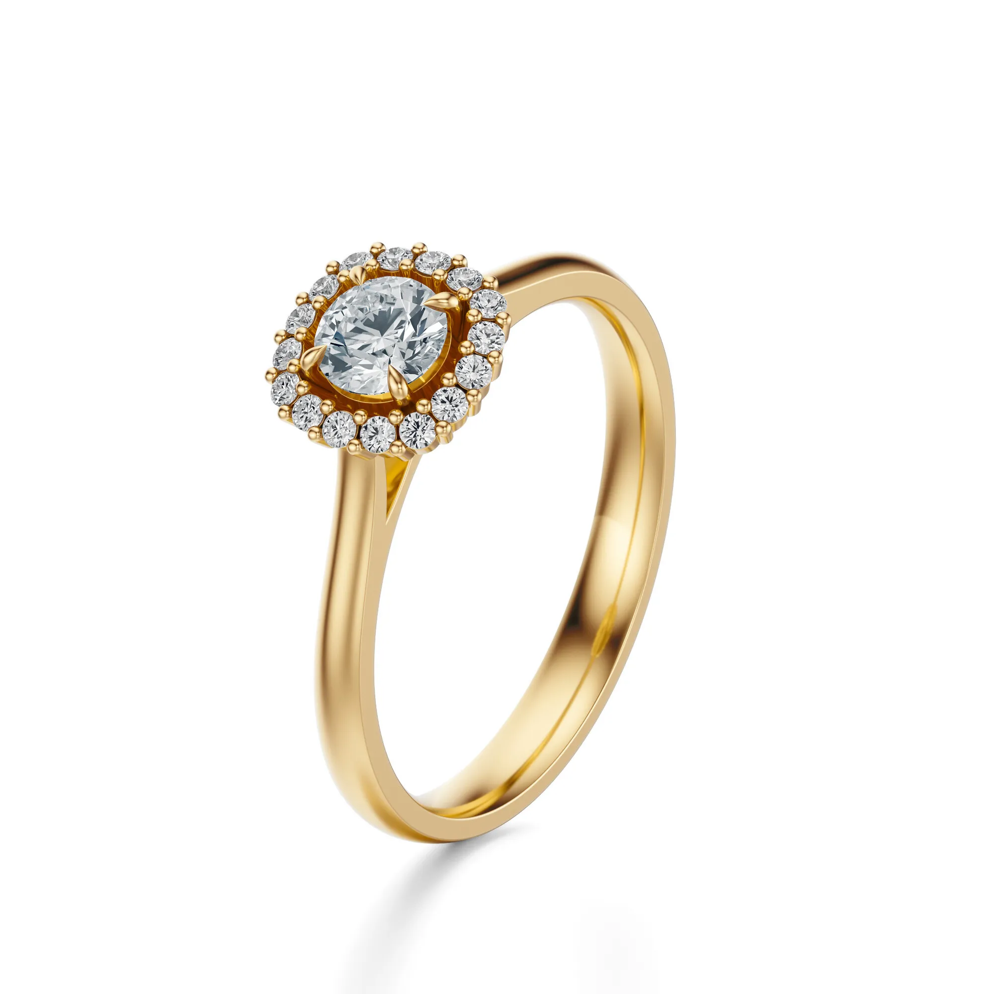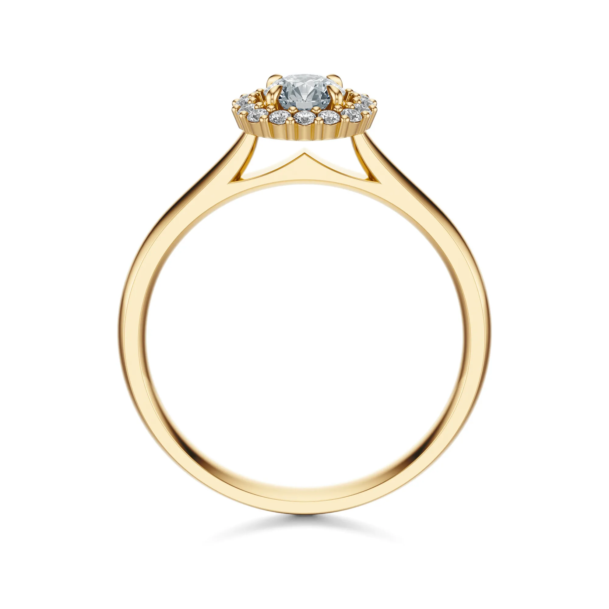 Diamenty w pierścionku mają szlif Excellent, który potęguje grę światła, wydobywając z kamieni maksymalny blask. Standardowe parametry to czystość VS2, barwa H, a masa głównego kamienia dostępna jest w wariantach od 0.30 do 0.70 ct. Układ diamentów w formie okrągłego halo nie tylko podkreśla centralny kamień, ale także optycznie go powiększa, nadając całości wyjątkowego charakteru.