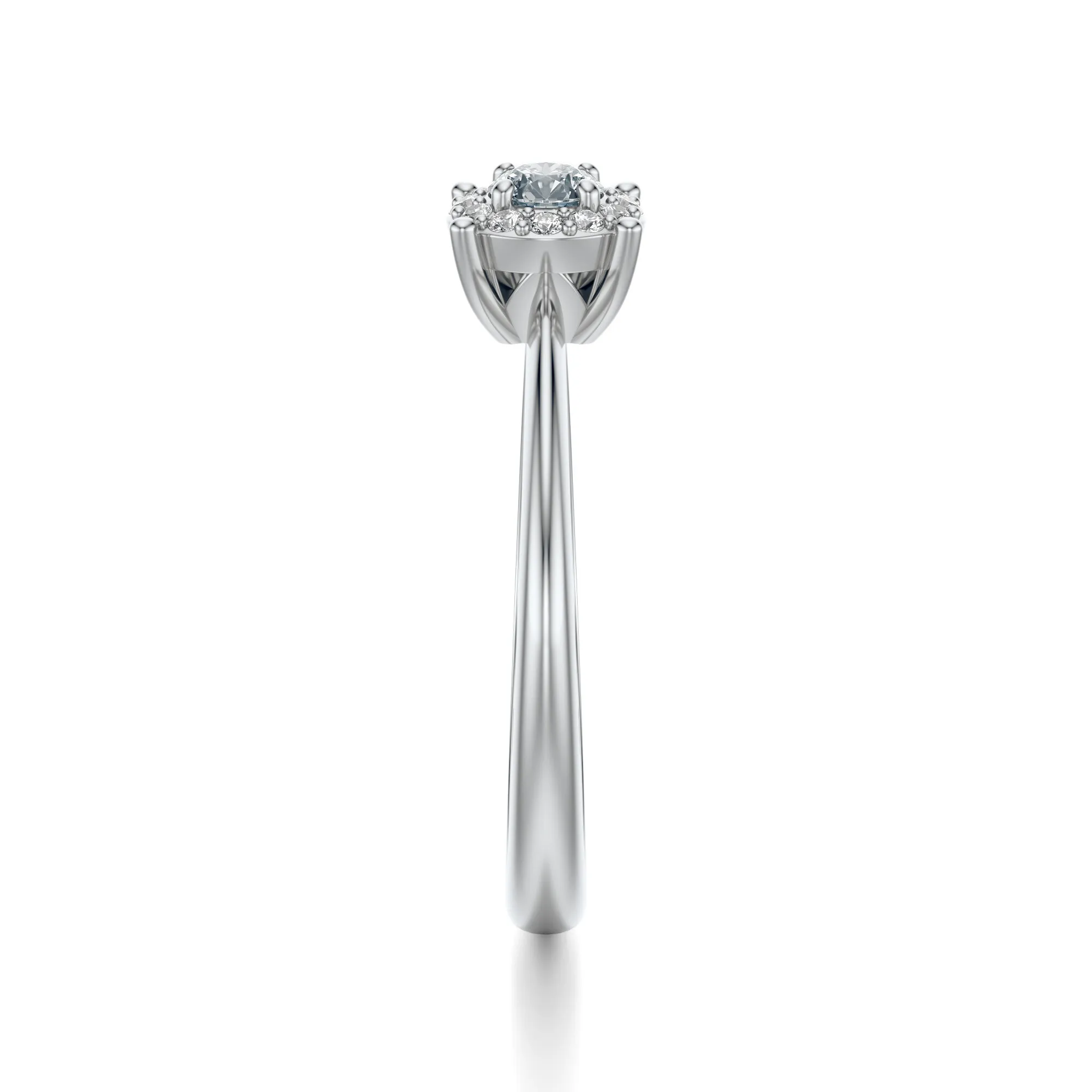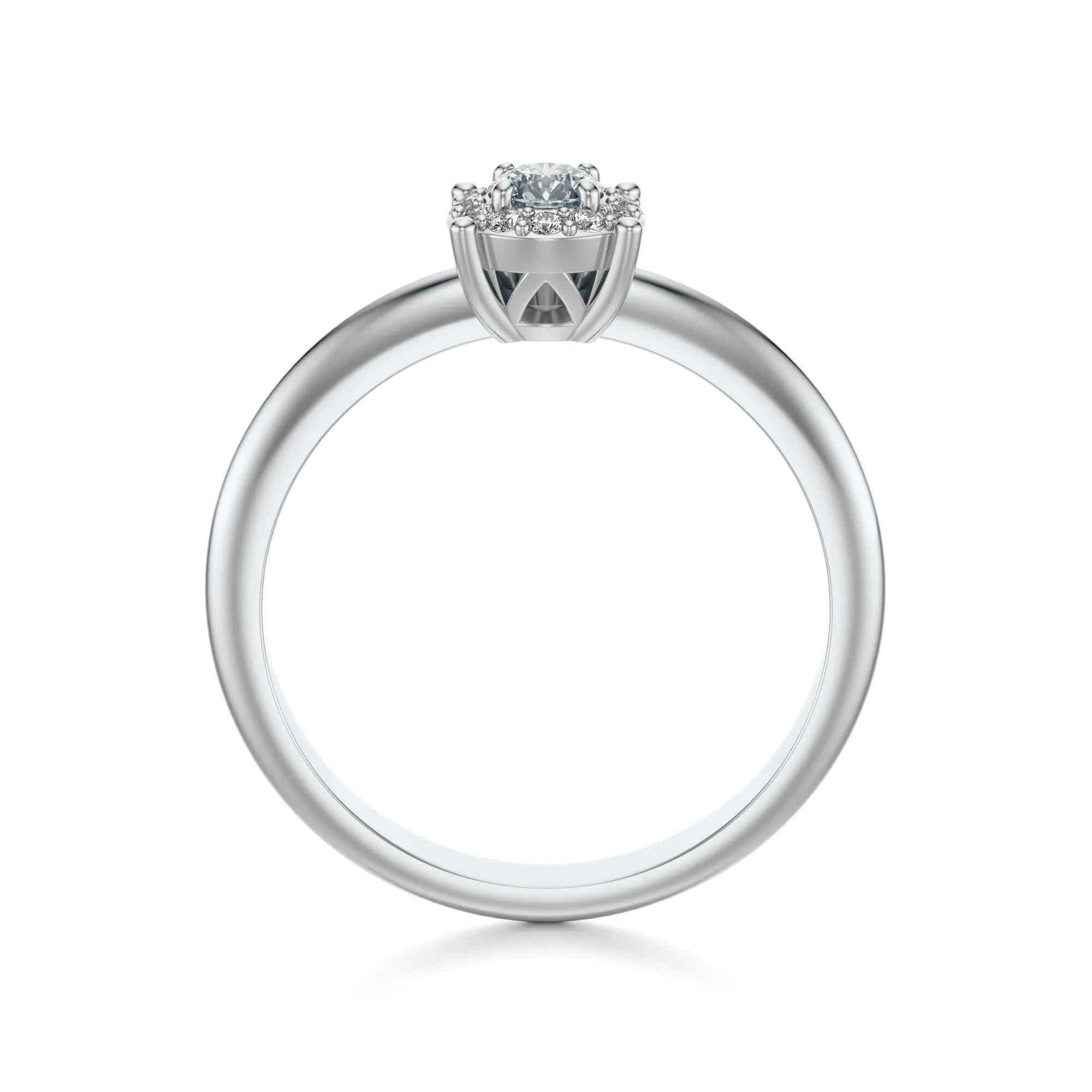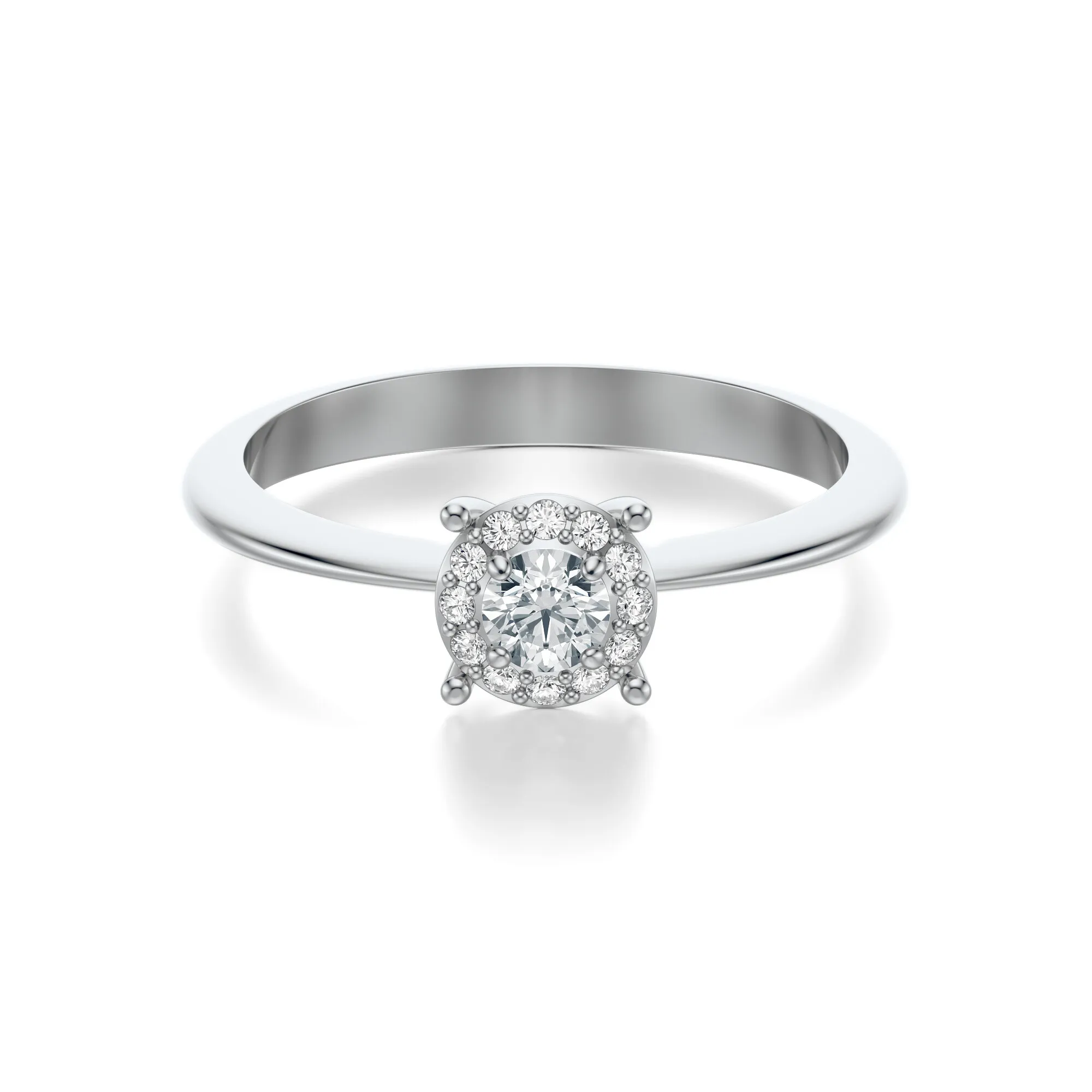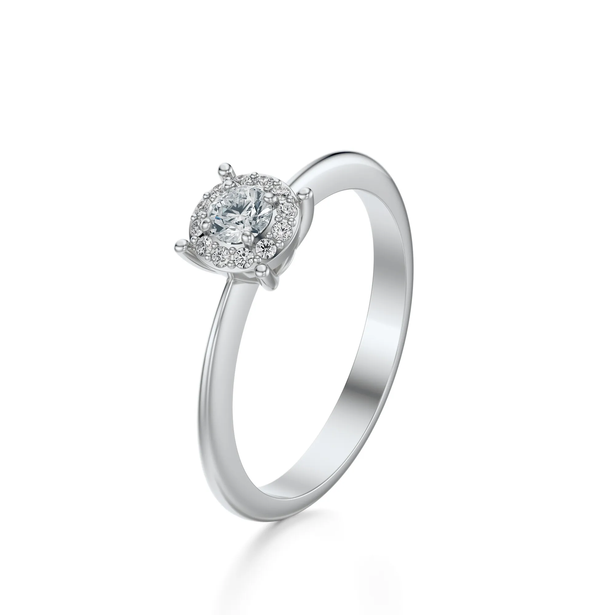 Zastosowane w tym modelu diamenty charakteryzują się parametrami: czystość VS2, barwa H, szlif Excellent. Centralny kamień może występować w wersjach 0.30, 0.40, 0.50 lub 0.70 ct – z możliwością personalizacji wedle życzenia klienta. Otaczające go mniejsze diamenty dodatkowo potęgują świetlistość całości, zapewniając efekt pełnego rozbłysku. Wszystkie kamienie są starannie selekcjonowane i oprawiane zgodnie z międzynarodowymi normami jubilerskimi.