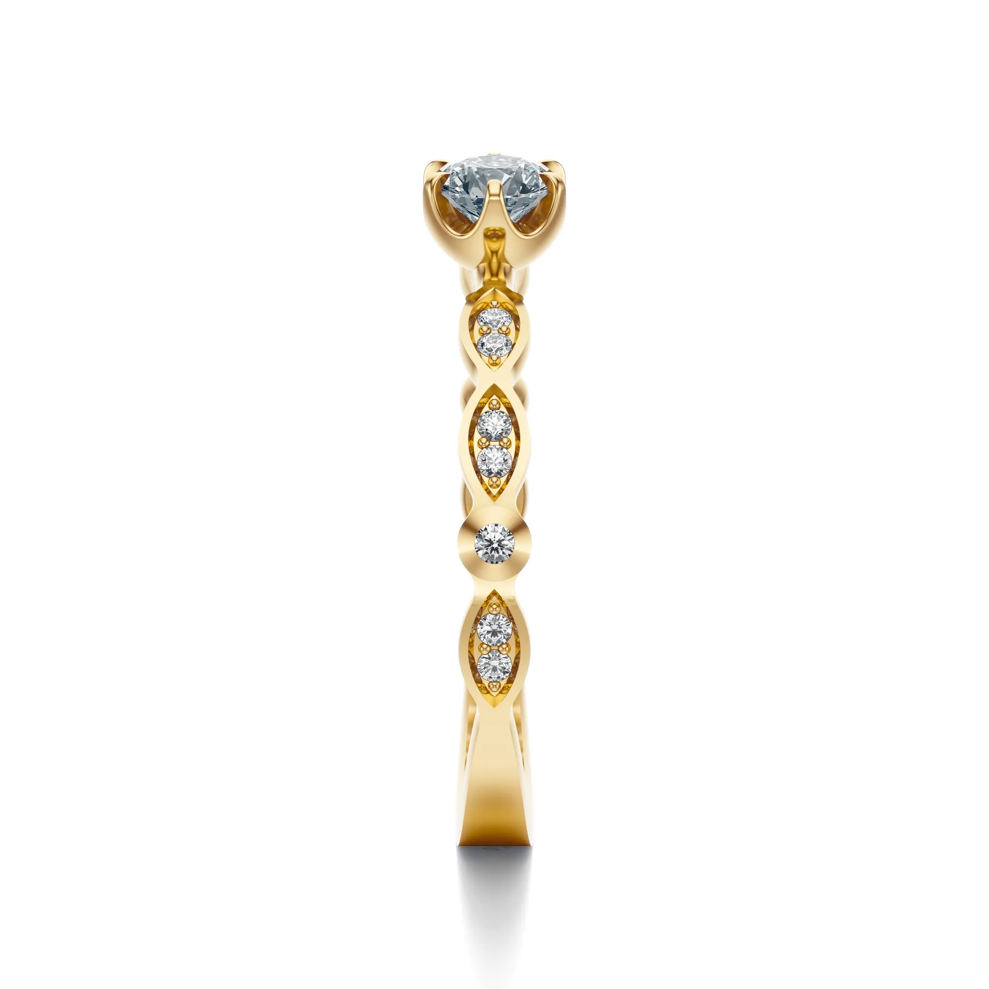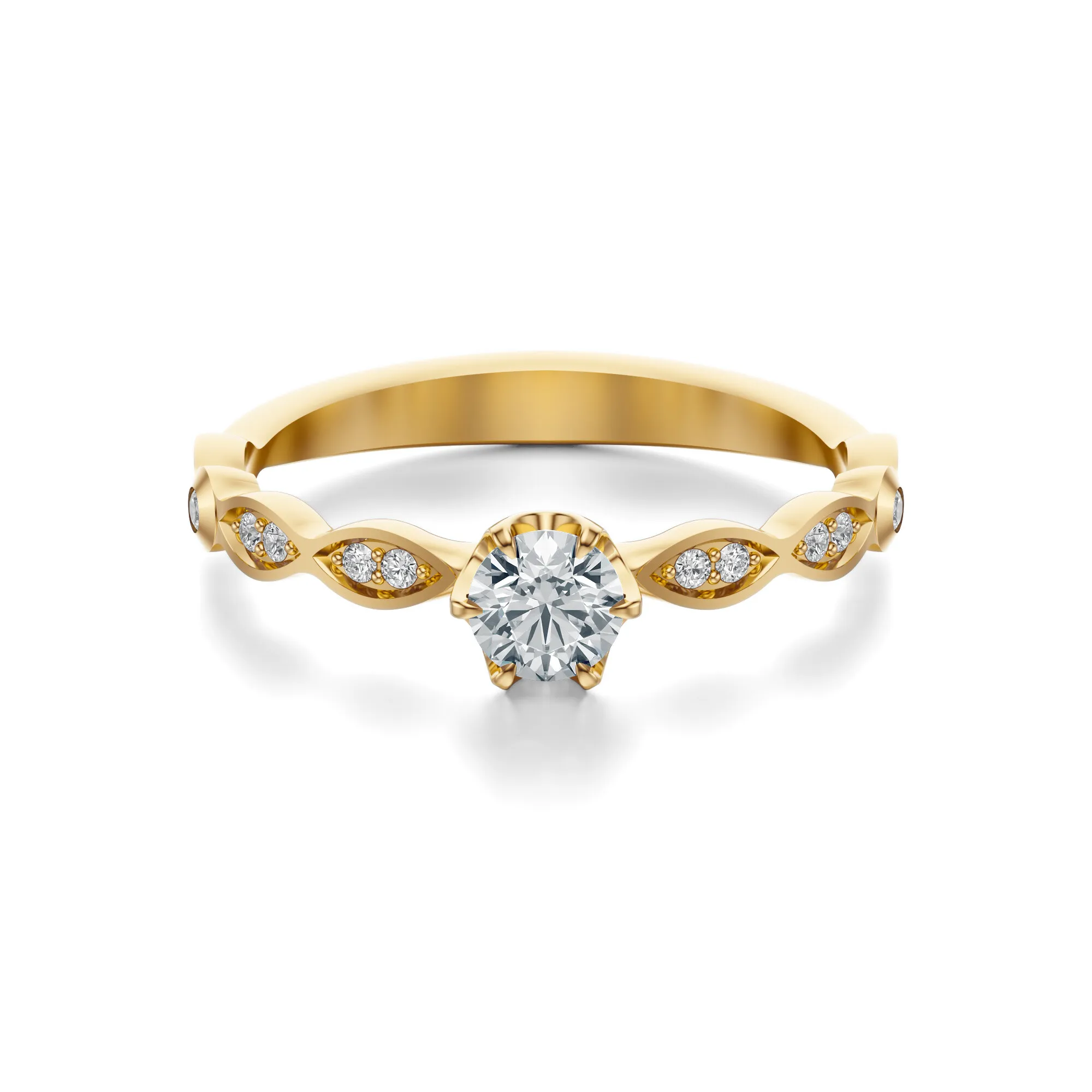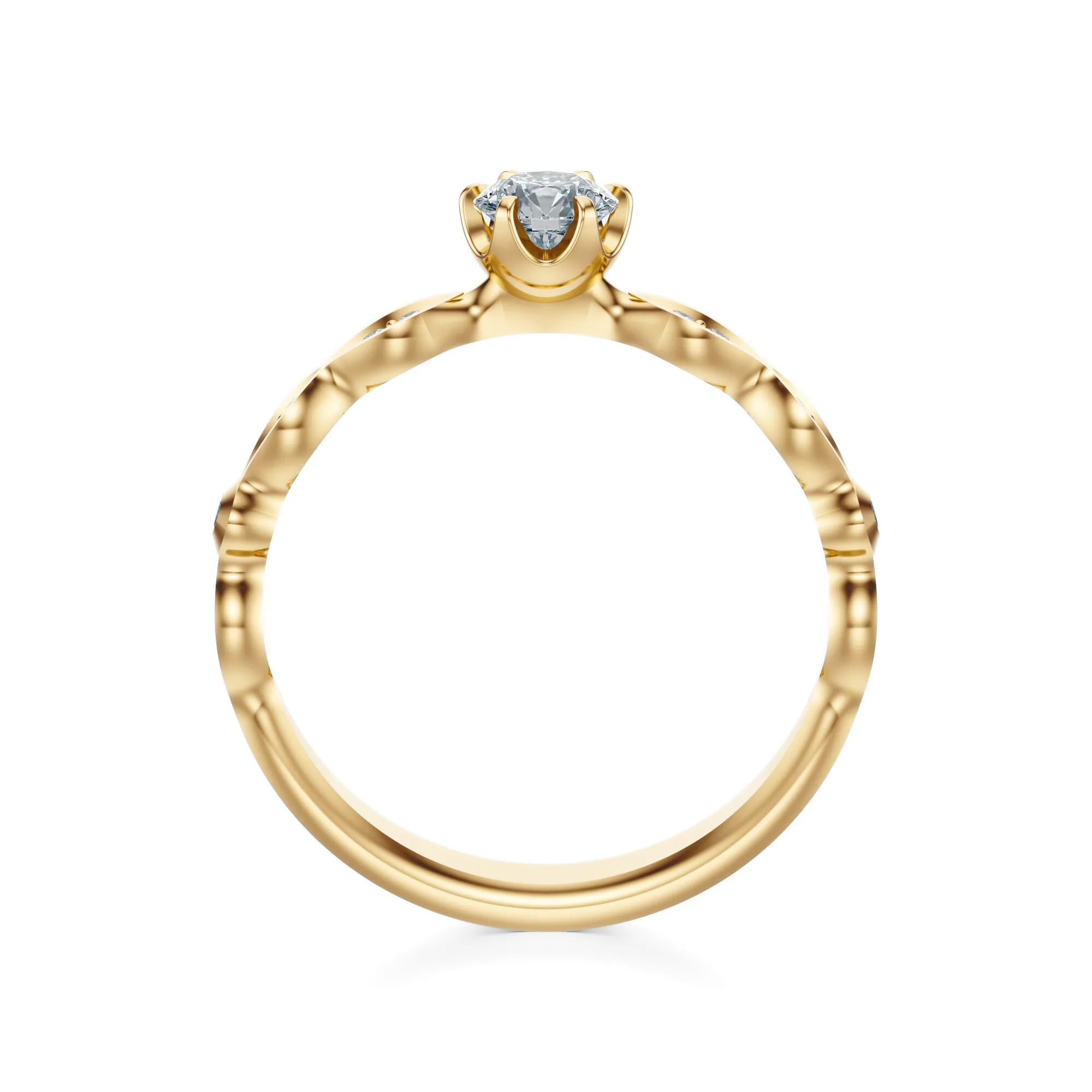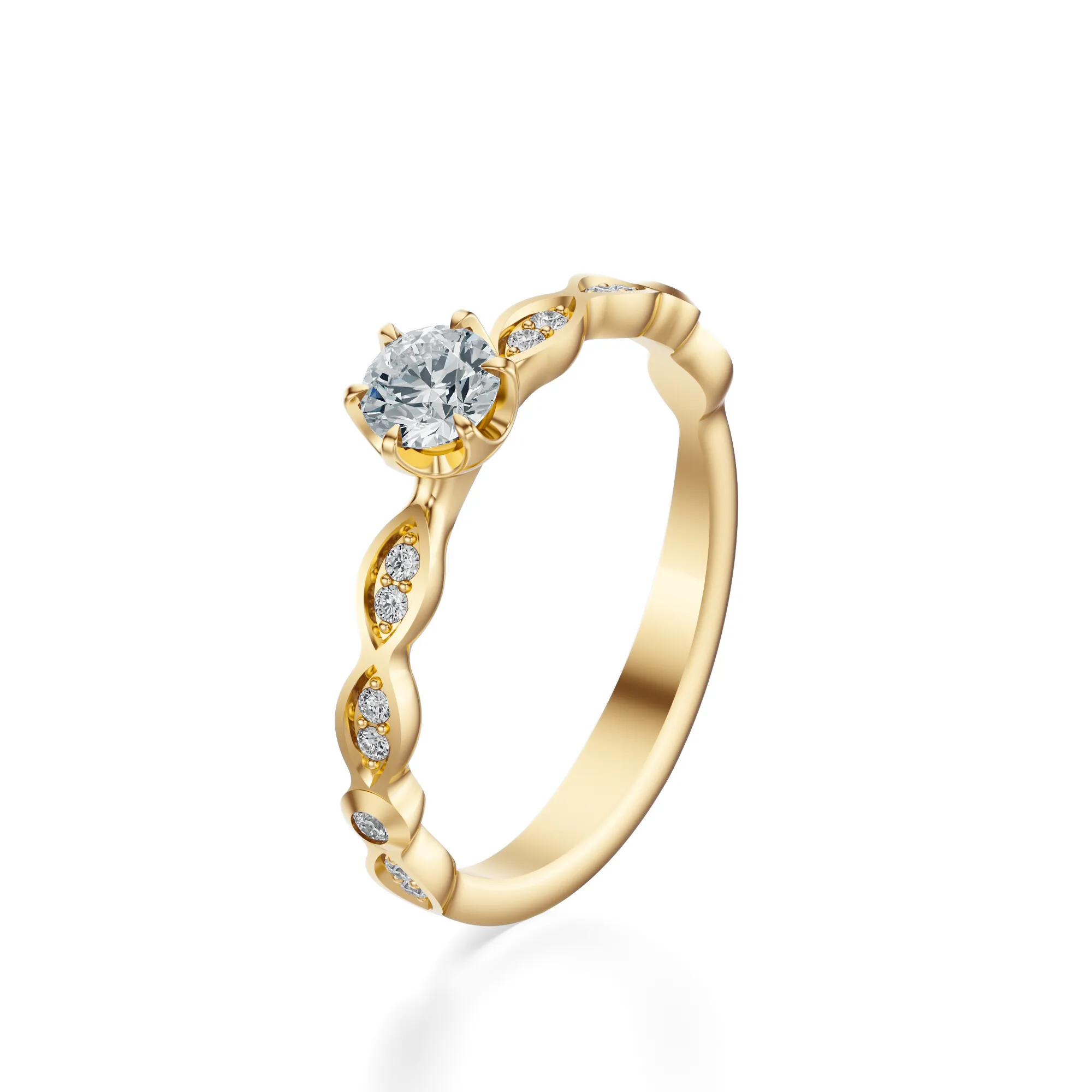 Ten wyjątkowy pierścionek wykonany ze złota o próbie 585 w kolorze żółtym zachwyca subtelnością detalu i misternym wykonaniem. Jego wyrafinowana forma przyciąga uwagę dynamiczną linią obrączki oraz intensywnym blaskiem centralnego diamentu, który stanowi serce kompozycji. Okrągły kamień szlachetny osadzono w sześciu delikatnych łapkach, otaczając go oprawą z finezyjnie rozmieszczonymi mniejszymi diamentami w formie liści.