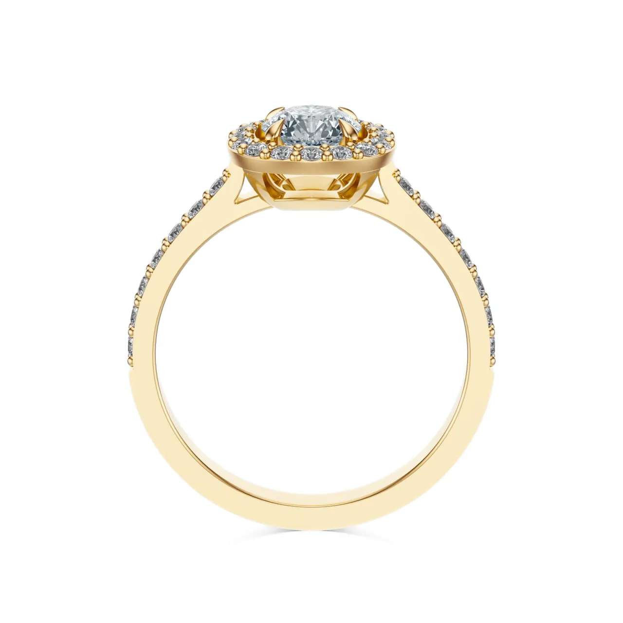 Dodatkowo pierścionek zdobią drobne diamenty ułożone w halo wokół centralnego kamienia, a także na szynie, co nadaje mu niezwykle wyrafinowanego charakteru i dodaje jeszcze więcej blasku. Takie połączenie czyni go idealnym wyborem na zaręczyny lub inną wyjątkową okazję.