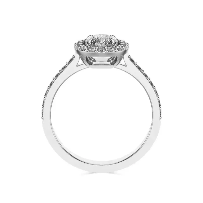 Pierścionek zdobi również delikatne diamentowe halo otaczające centralny kamień oraz drobne diamenty na szynie, które nadają mu wyjątkowej finezji i dodatkowego blasku. To harmonijne połączenie sprawia, że pierścionek jest idealnym wyborem na zaręczyny lub inne ważne okazje.