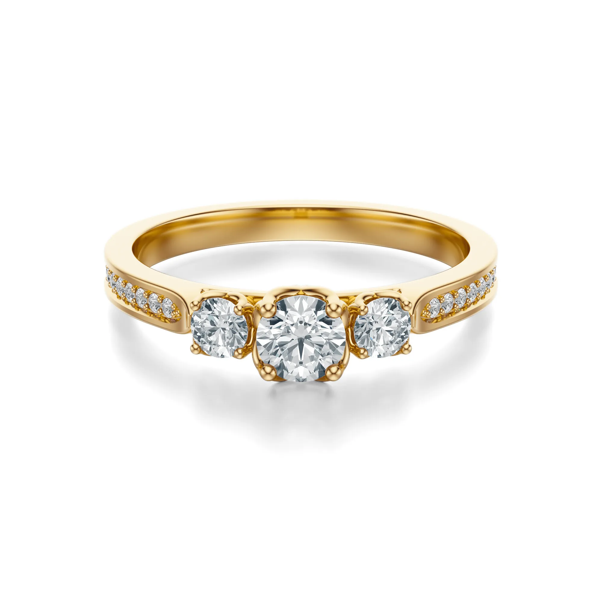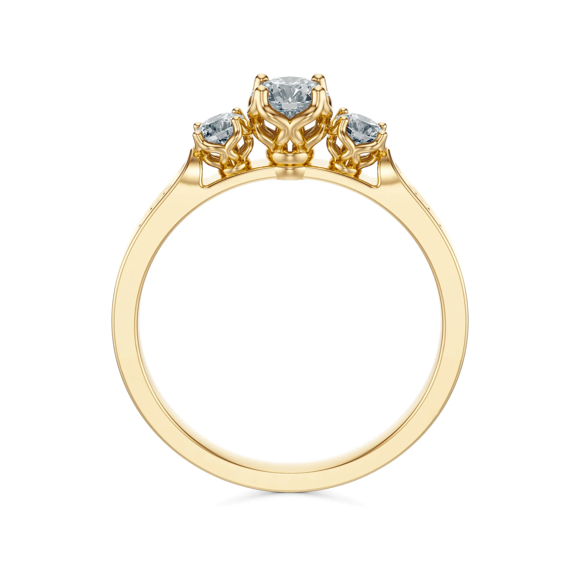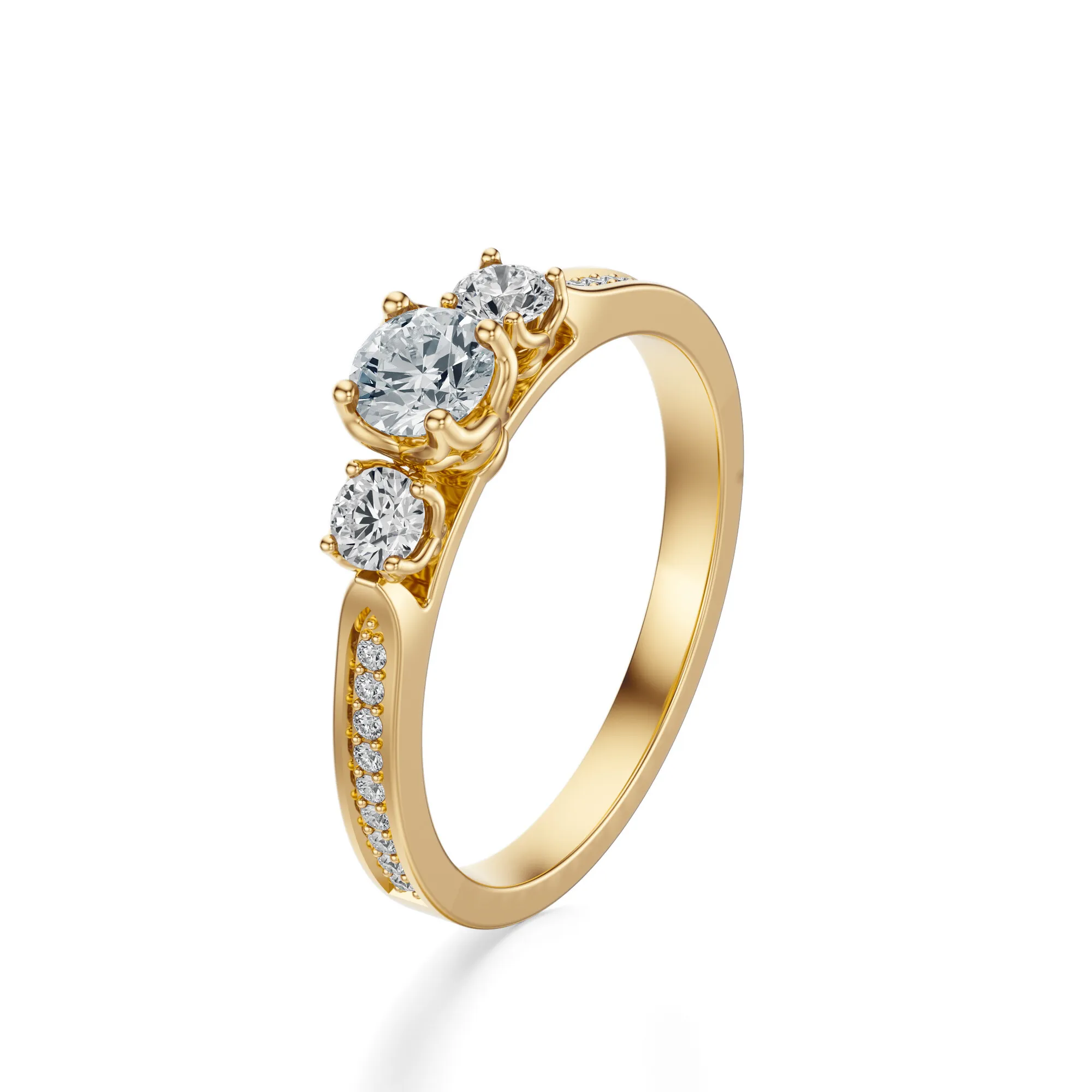 Ten olśniewający pierścionek zaręczynowy z diamentami to kwintesencja luksusu i ponadczasowej elegancji. Wykonany z żółtego złota o próbie 585, zachwyca swoją precyzją, klasycznym pięknem i intensywnym blaskiem szlachetnych kamieni. Centralny, okrągły diament otoczony jest dwoma mniejszymi kamieniami, a całość dopełnia rząd drobnych diamentów umieszczonych wzdłuż obrączki, co nadaje pierścionkowi głębi i spektakularnego efektu świetlnego.
