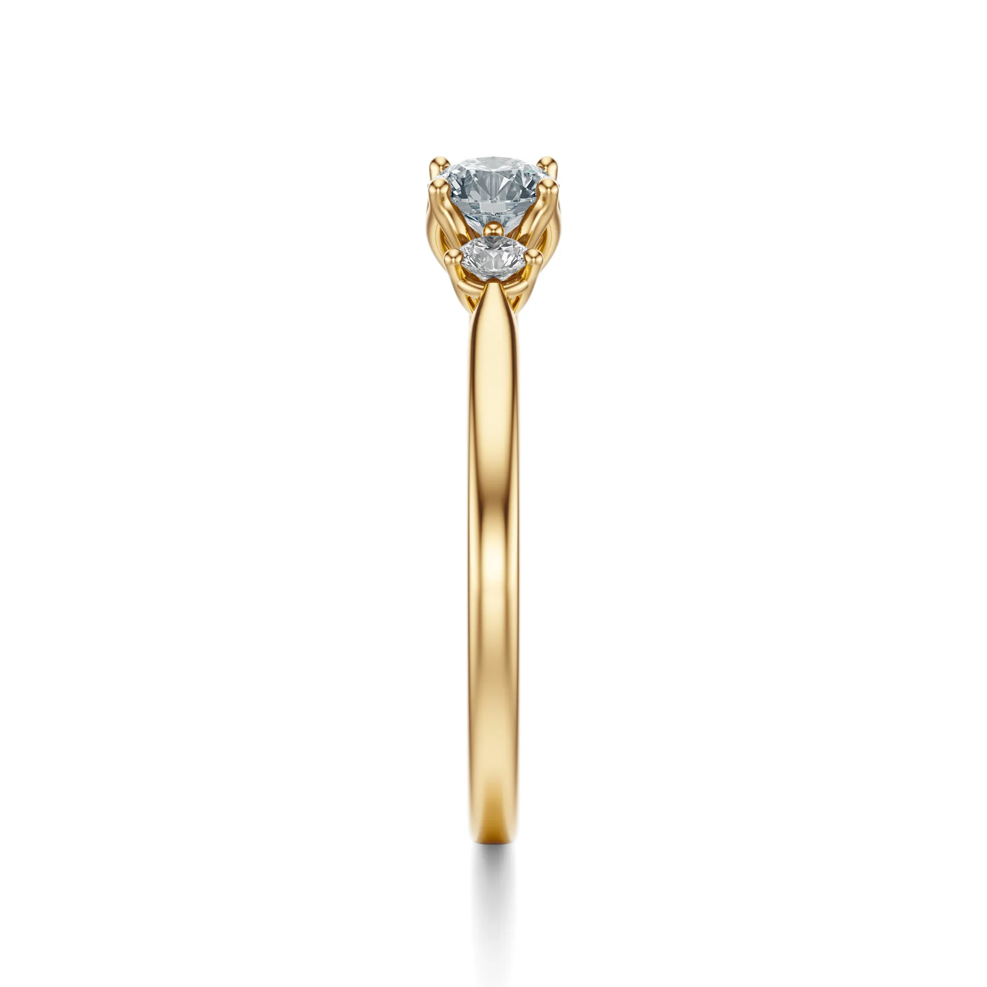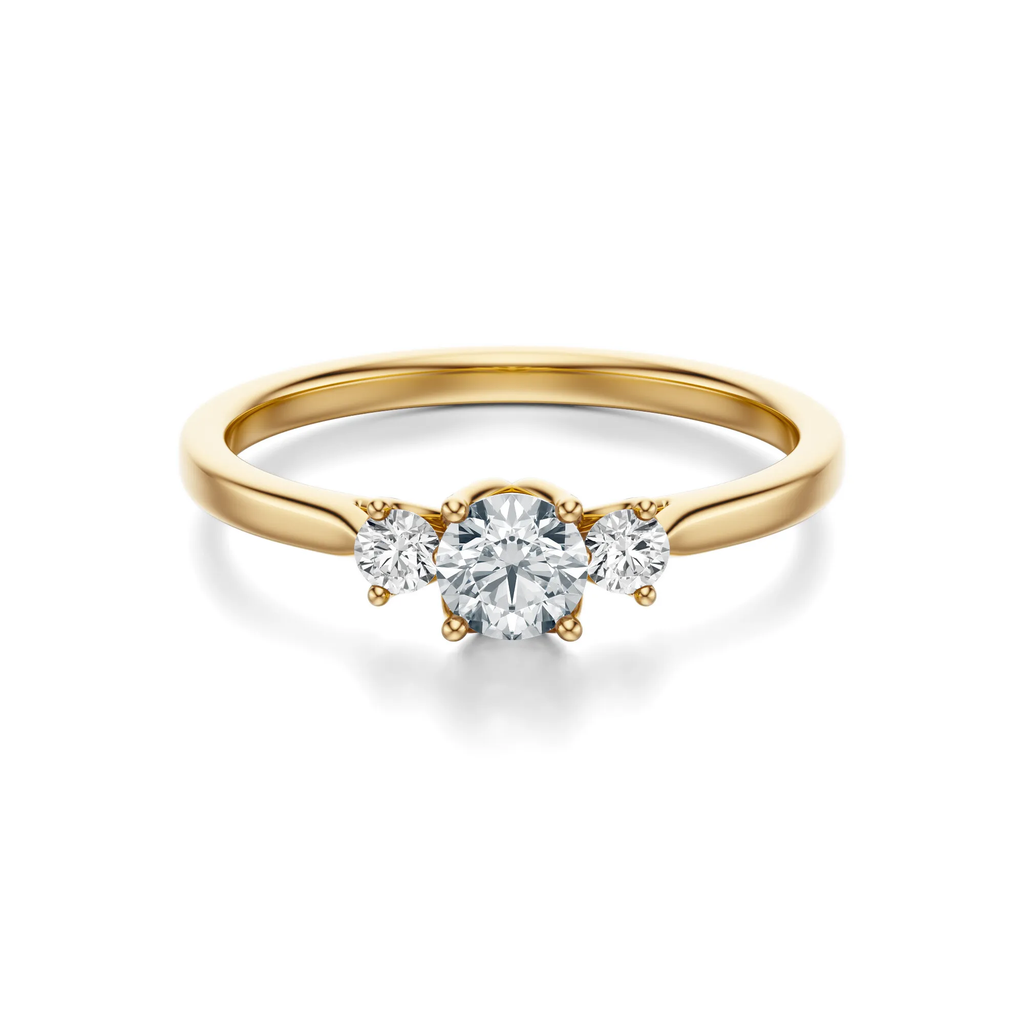 Ten zjawiskowy pierścionek zaręczynowy z diamentami to elegancja zamknięta w klasycznej formie. Wykonany ze złota o próbie 585 w ciepłym odcieniu żółci, urzeka swoją subtelnością i ponadczasowym urokiem. Centralny okrągły diament, osadzony pomiędzy dwoma mniejszymi kamieniami, tworzy harmonijną kompozycję, która przyciąga spojrzenia i podkreśla wyrafinowany gust osoby, która go nosi.