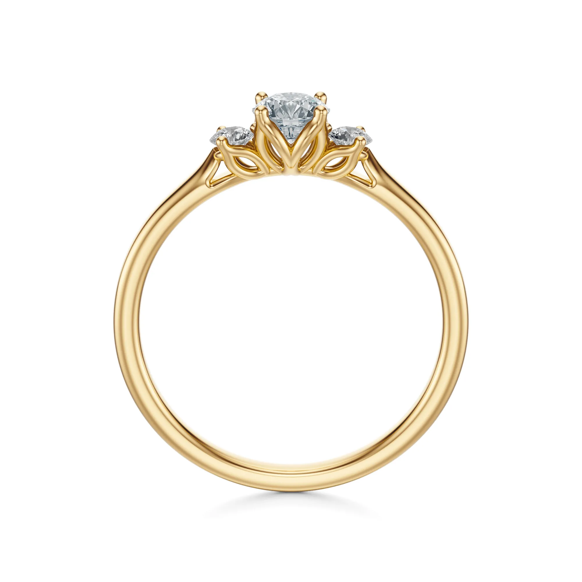 Główny kamień został oszlifowany w szlifie brylantowym, zapewniającym maksymalne odbicie światła i wyjątkowy połysk. W towarzystwie dwóch mniejszych diamentów uzyskujemy efekt głębi i elegancji. W standardzie oferujemy diamenty o czystości VS2, barwie H i szlifie Excellent, w masie od 0.30 do 0.70 ct – z możliwością dostosowania parametrów na życzenie klienta.