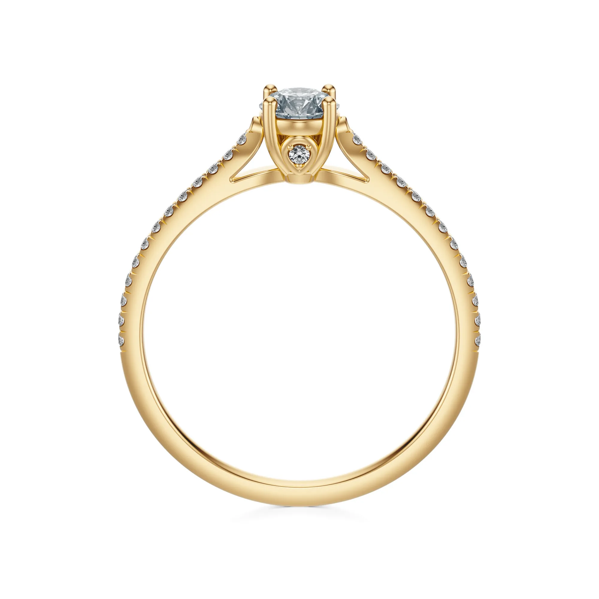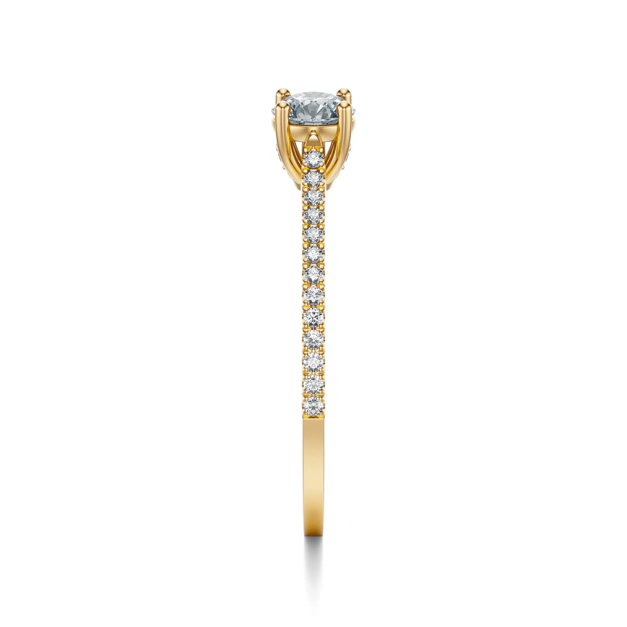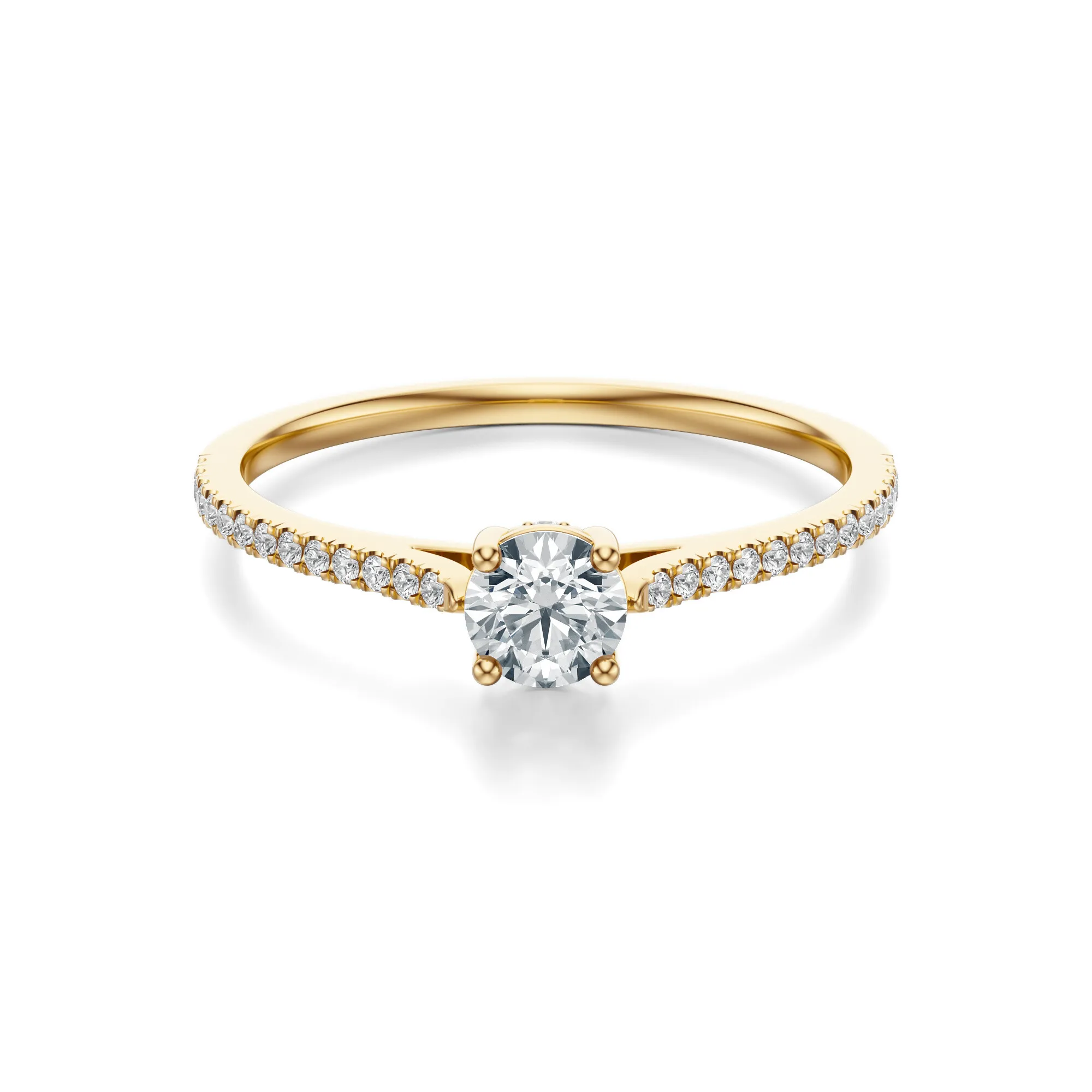 Ten pierścionek zaręczynowy z diamentami wykonany z żółtego złota o próbie 585 urzeka subtelnością i wyrafinowaną formą. Smukła obrączka ozdobiona została rzędem drobnych, lśniących diamentów, które prowadzą wzrok ku imponującemu centralnemu kamieniowi w okrągłym szlifie. Kompozycja ta zachwyca lekkością, a zarazem szlachetnością – to biżuteria, która robi wrażenie bez zbędnego przepychu.