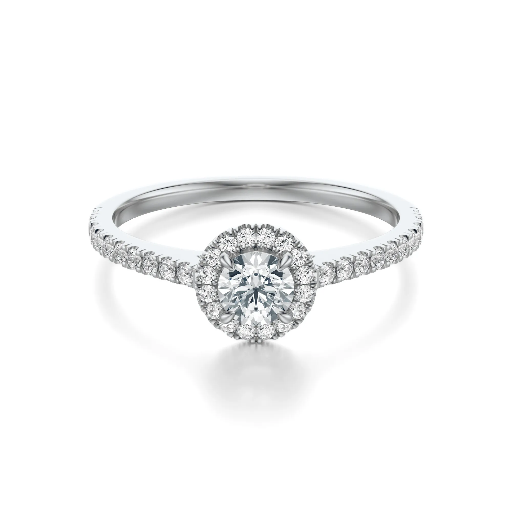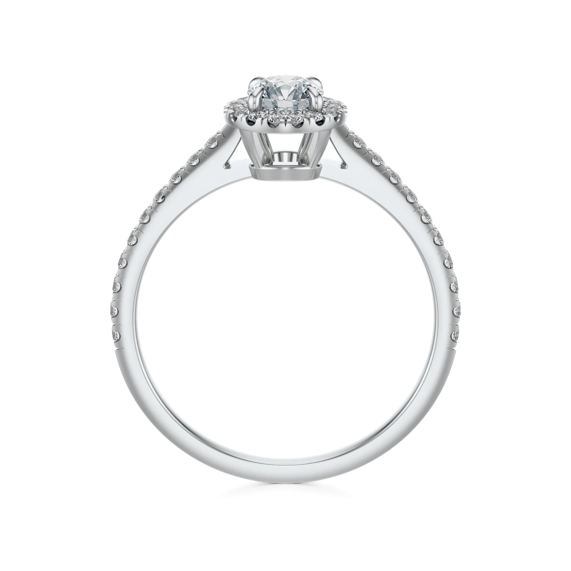 Centralny diament wyróżnia się parametrami: czystość VS2, barwa H oraz szlif Excellent – cechy te zapewniają spektakularne odbicie światła i intensywny blask. Kamień dostępny jest w masie od 0.30 do 0.70 ct. Otaczające go mniejsze diamenty nie tylko podkreślają jego urodę, ale również budują efekt przestrzeni i elegancji. Wszystkie kamienie spełniają międzynarodowe standardy, co czyni pierścionek wyborem klasy premium.