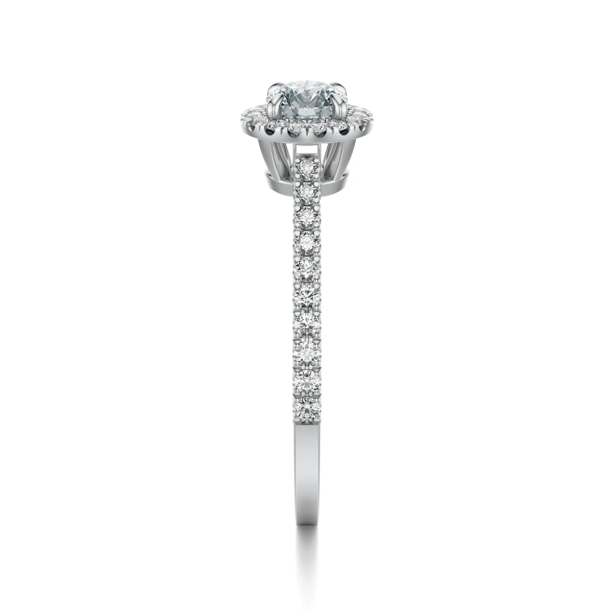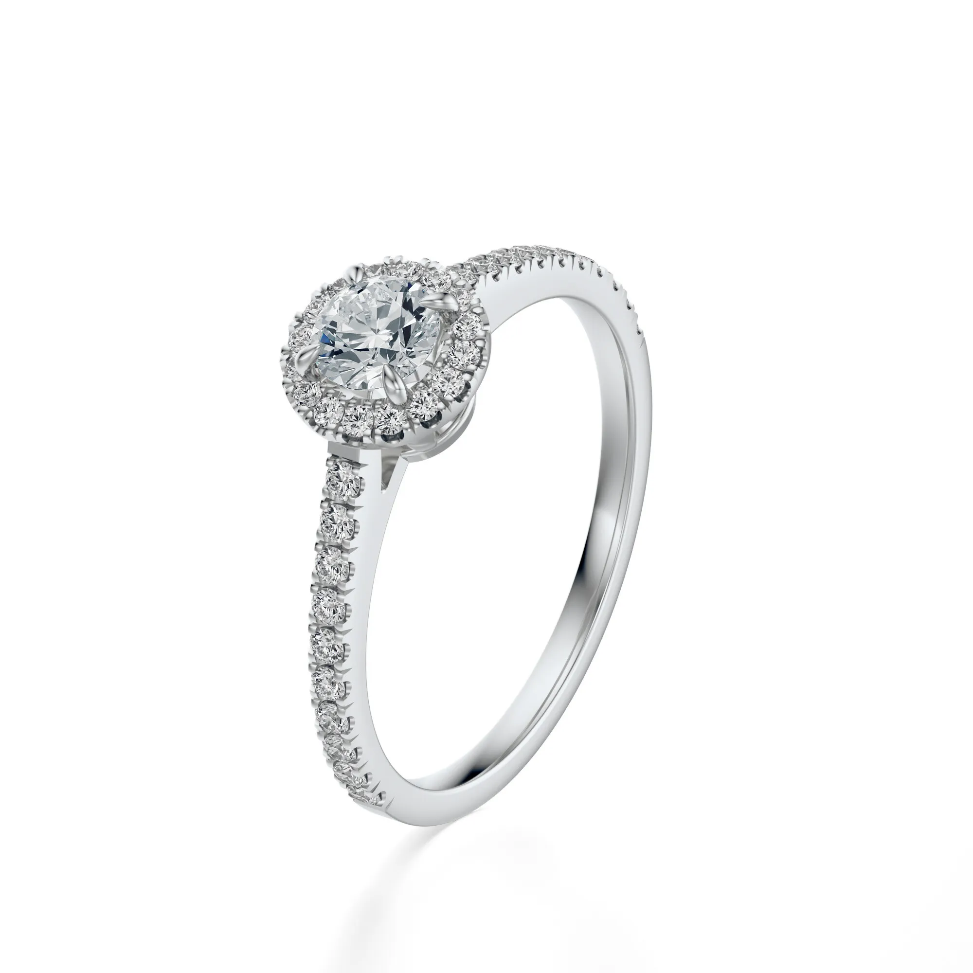 Ten pierścionek z białego złota o próbie 585 urzeka elegancją i blaskiem, który zapada w pamięć od pierwszego spojrzenia. Okrągły diament w centralnej części, osadzony w klasycznym szlifie, otoczony jest ażurową koroną mniejszych kamieni, tworząc efekt typu halo. Całość dopełnia delikatna obrączka wysadzana precyzyjnie ułożonymi diamentami, które rozświetlają każdą stronę pierścionka.