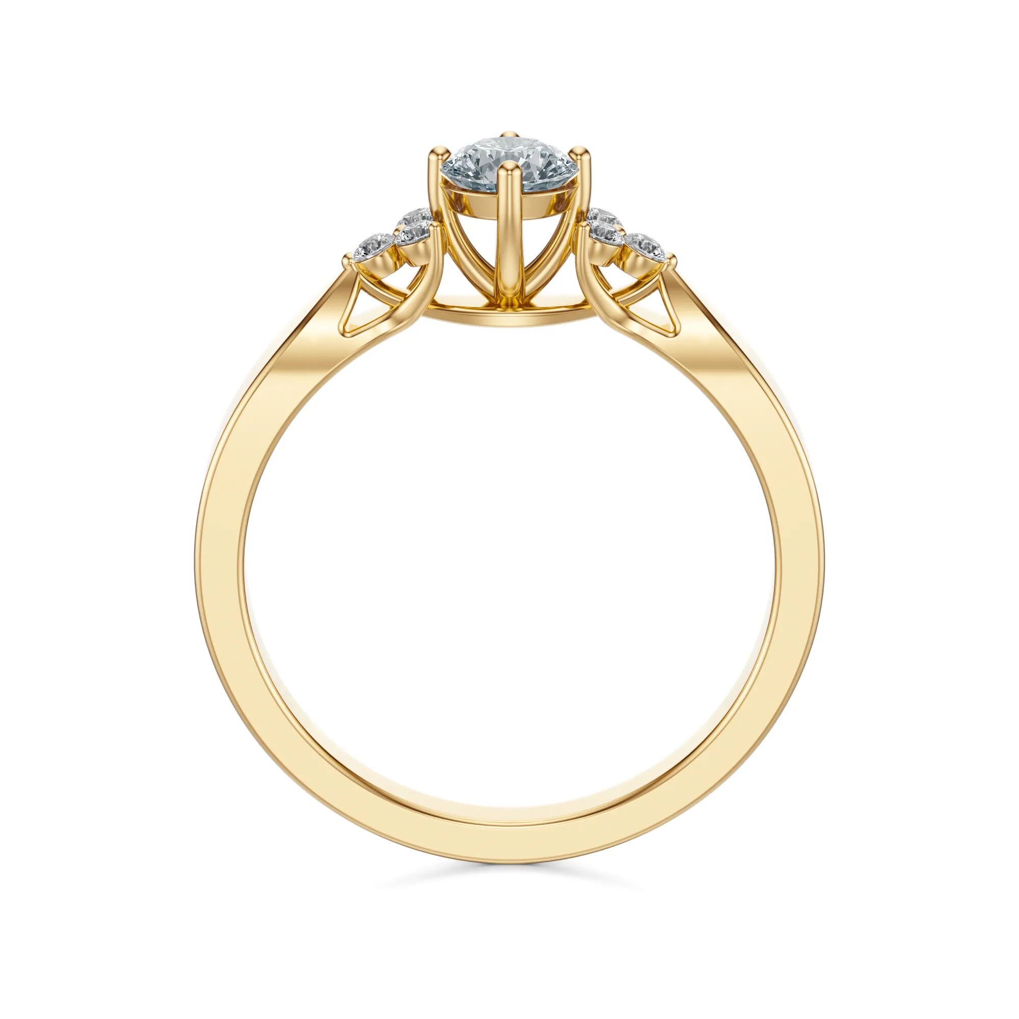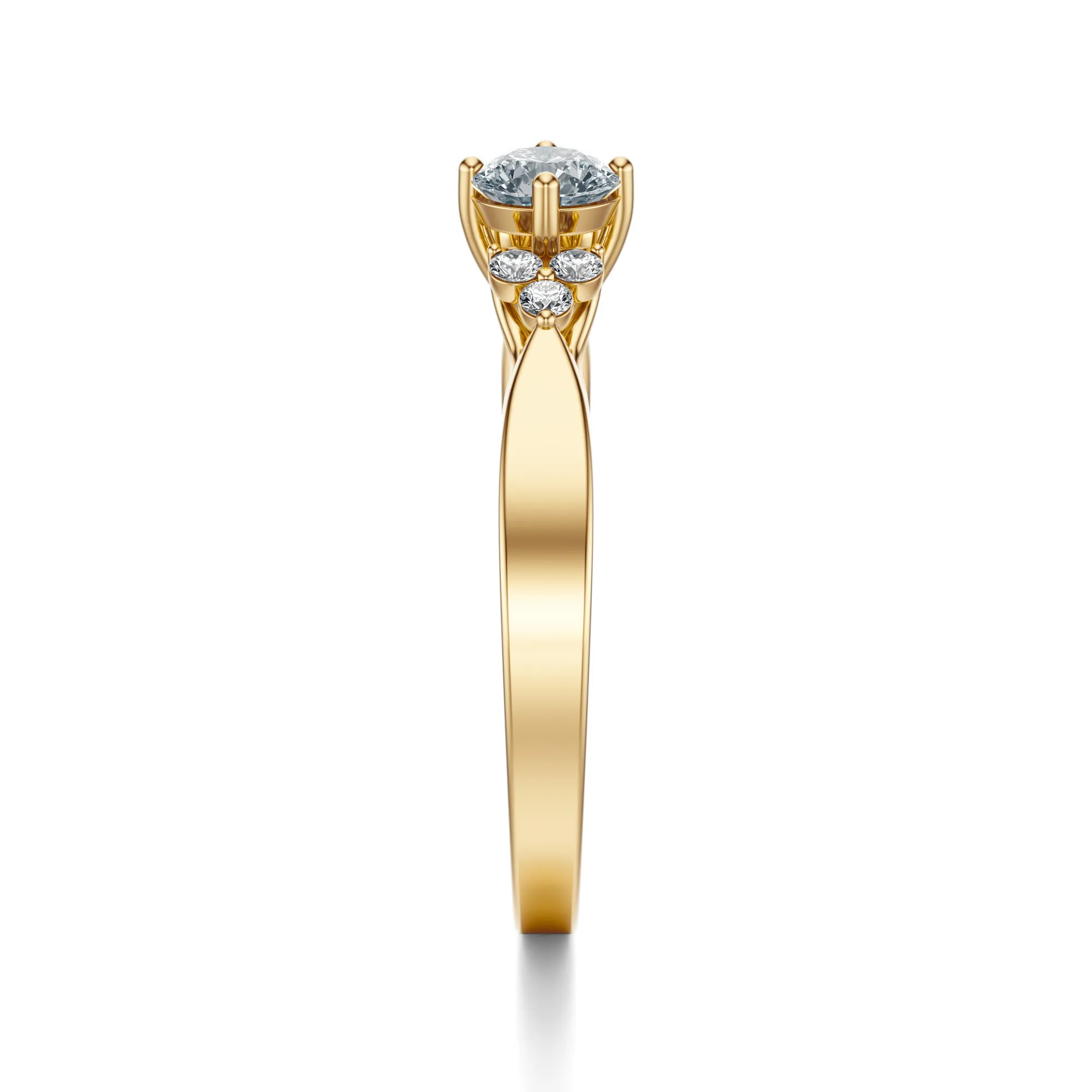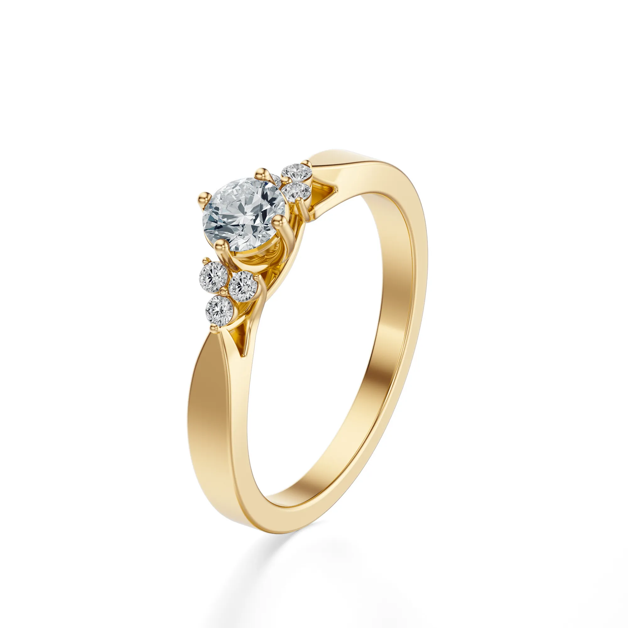Centralny kamień otoczony jest mniejszymi brylantami rozmieszczonymi asymetrycznie, co nadaje kompozycji lekkość i dynamiczny charakter. Precyzyjne wykończenie i dopracowane detale podkreślają kunszt jubilerski, czyniąc ten złoty pierścionek zaręczynowy doskonałym wyborem na wyjątkowe okazje.