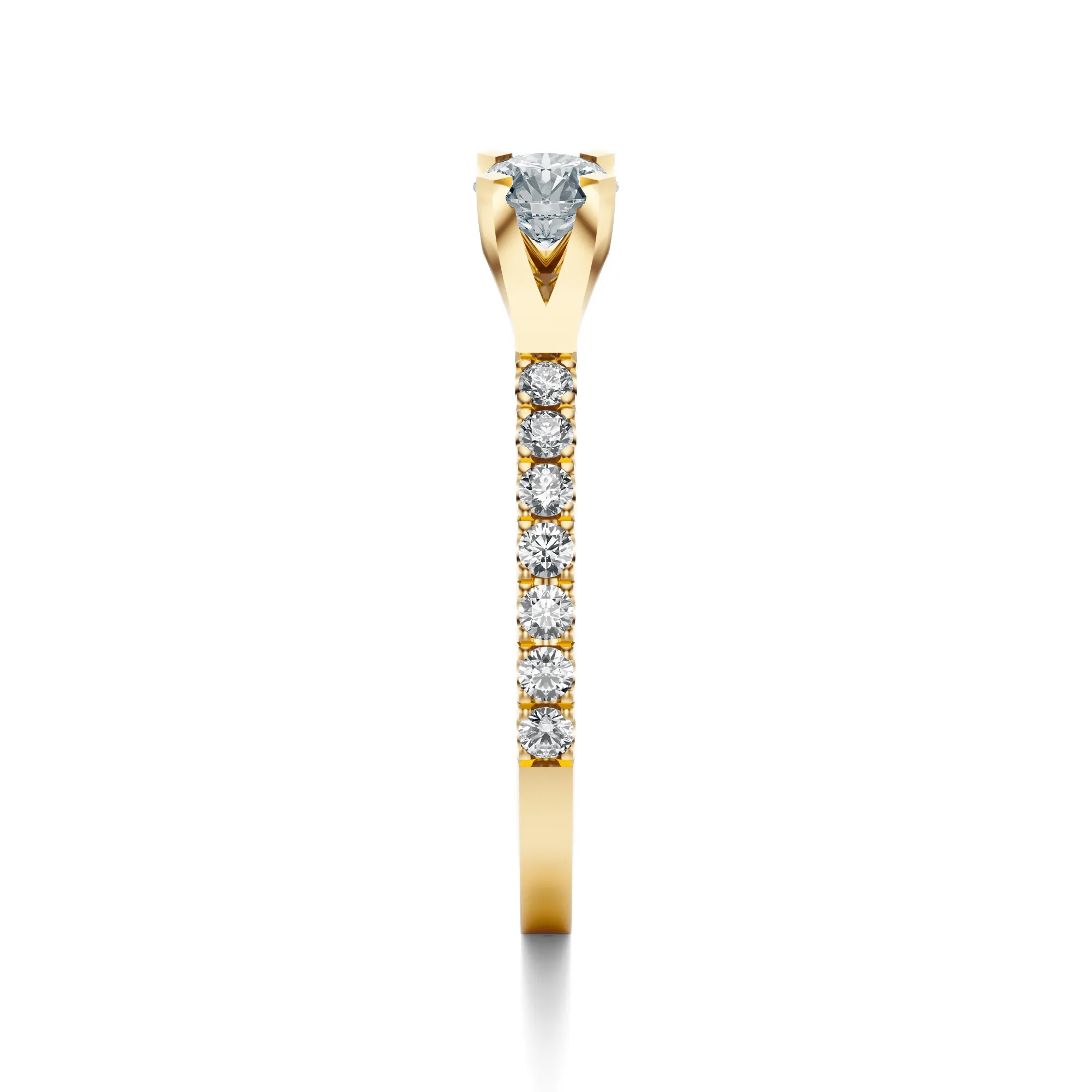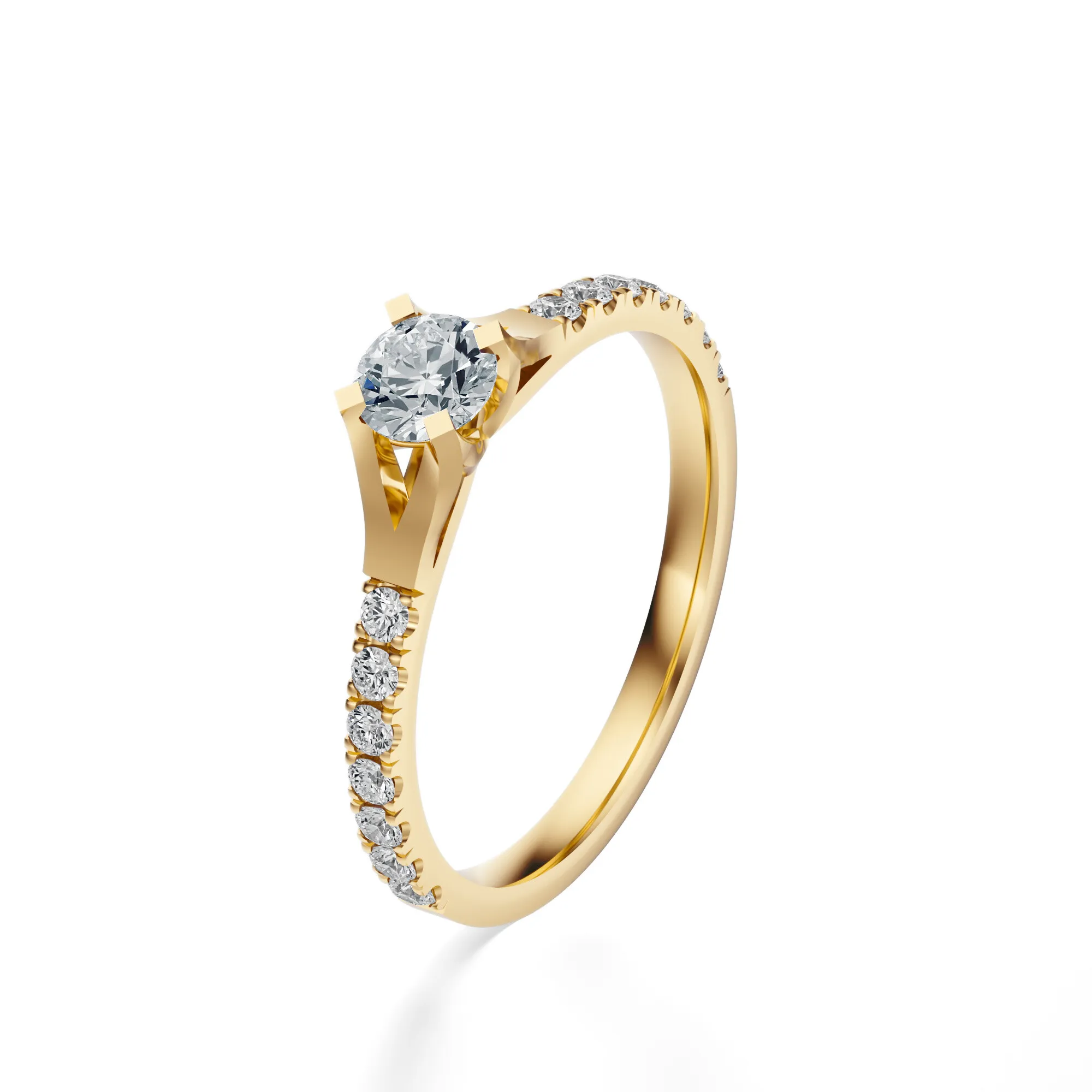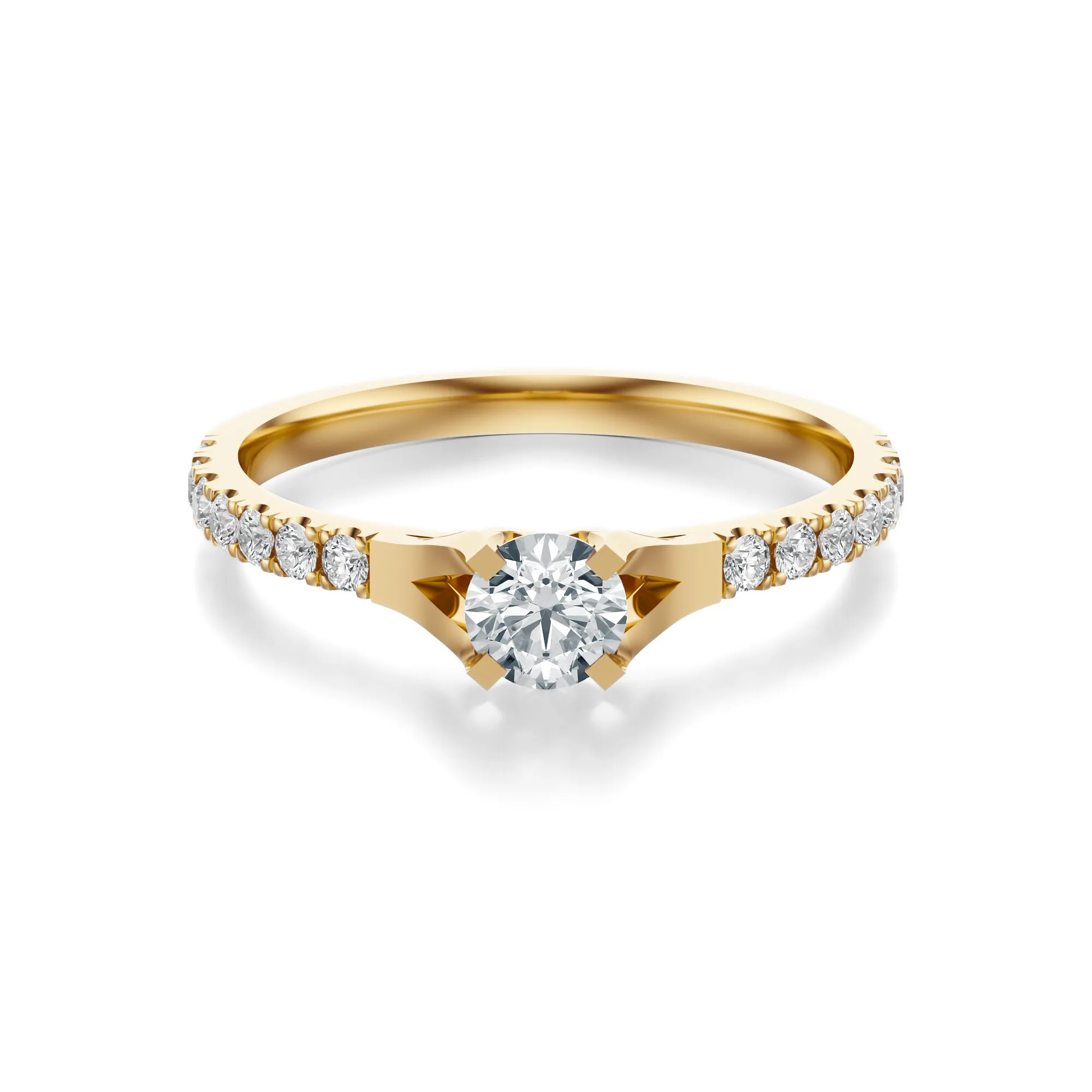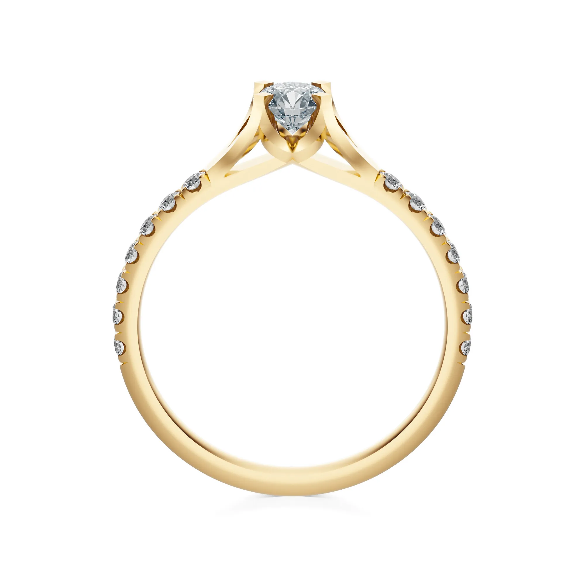 Zachwycający blaskiem i doskonałym wyważeniem formy, ten pierścionek zaręczynowy z żółtego złota stanowi kwintesencję klasycznej elegancji. Wykonany ze złota o próbie 585, odznacza się ciepłym, szlachetnym odcieniem, który idealnie podkreśla świetlistość okrągłych diamentów. Centralny kamień osadzony w subtelnej oprawie typu katedralnej, otoczony został rzędem mniejszych diamentów wzdłuż obrączki, nadając całości wyjątkowego blasku i głębi.