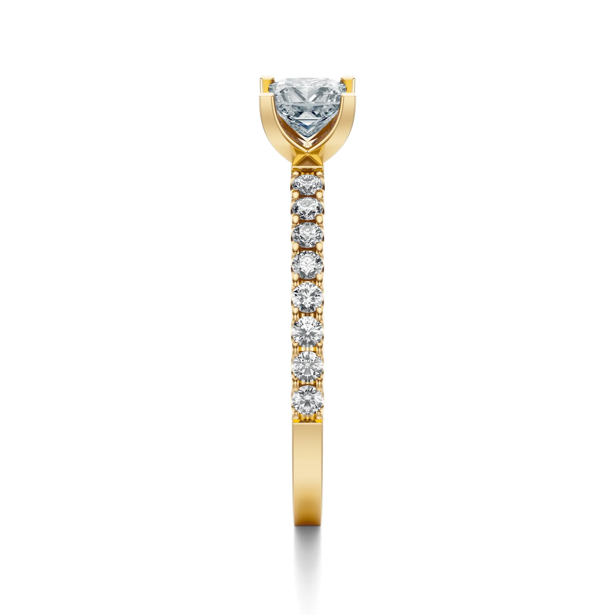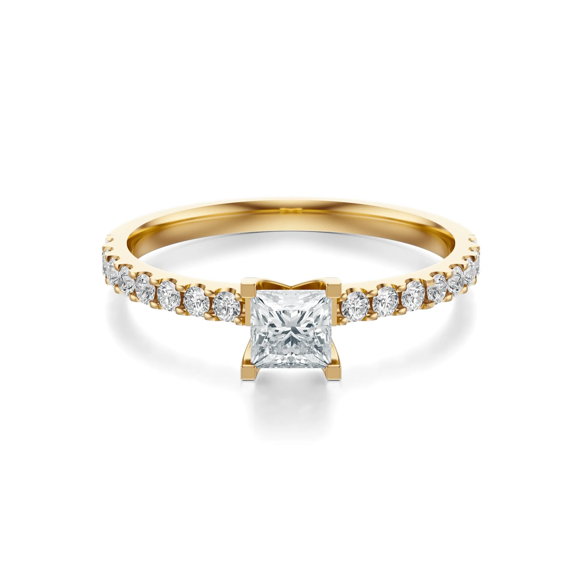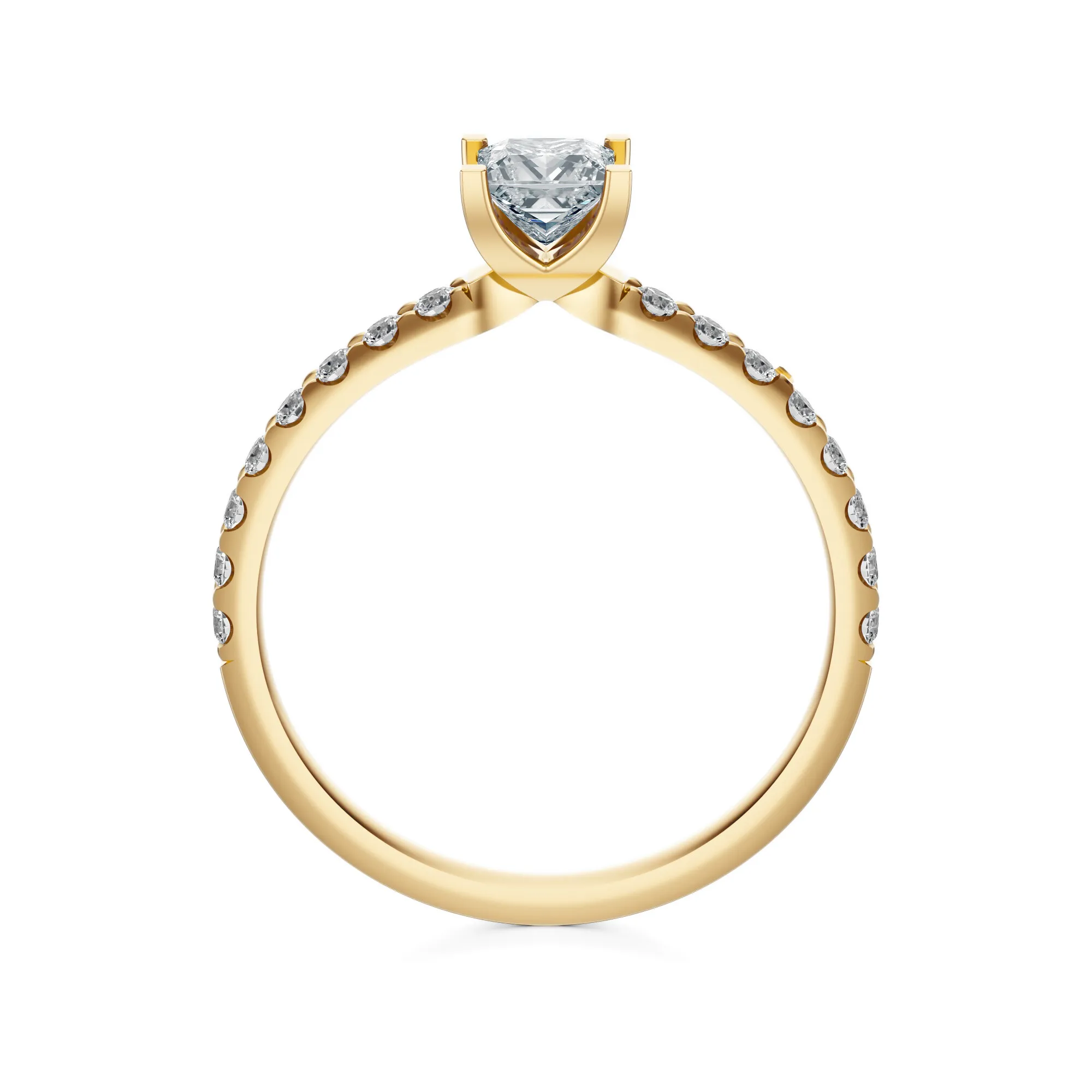 Ten olśniewający pierścionek zaręczynowy z żółtego złota o próbie 585 łączy w sobie elegancję i luksus w najczystszej postaci. W centrum oprawy lśni diament o szlifie princessa, który zachwyca symetrią i precyzją cięcia. Obrączka ozdobiona została szeregiem mniejszych, okrągłych diamentów, które dodają całości wyjątkowego blasku i wyrafinowania.