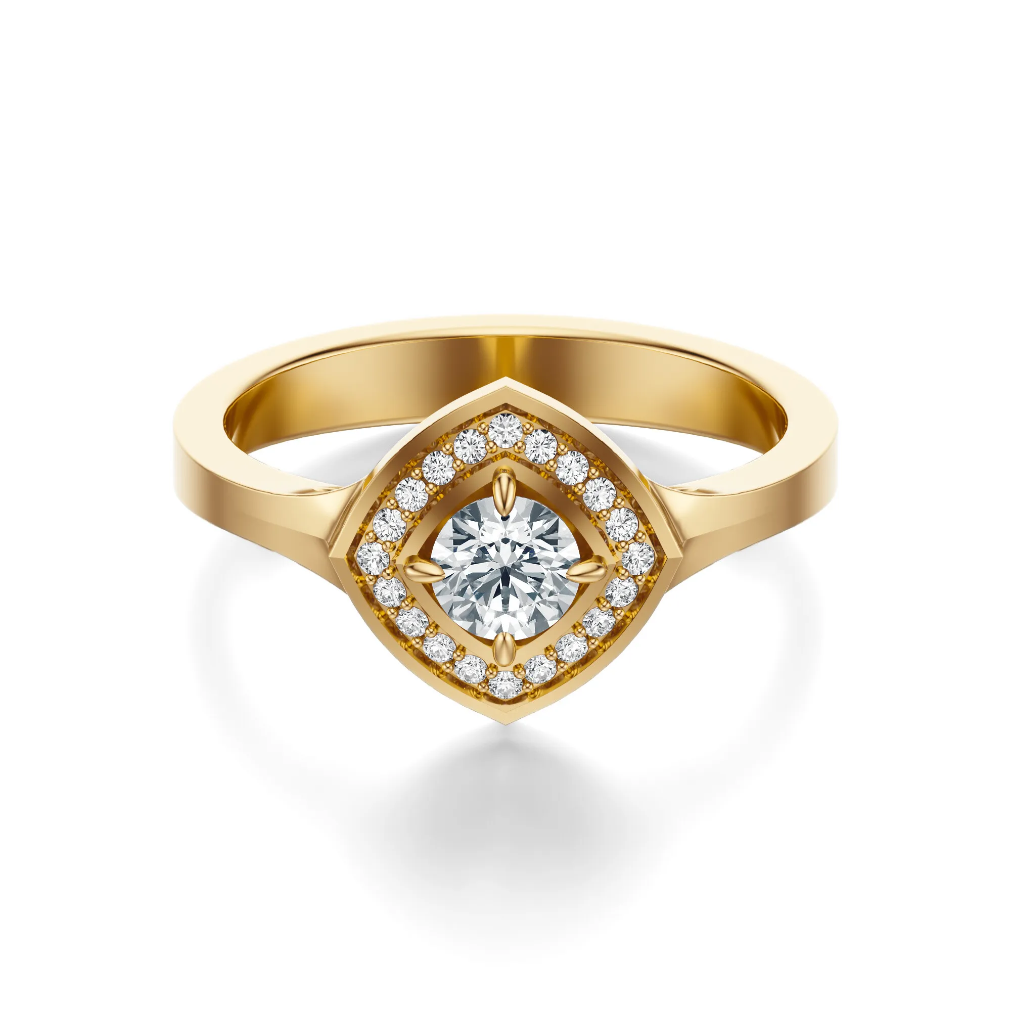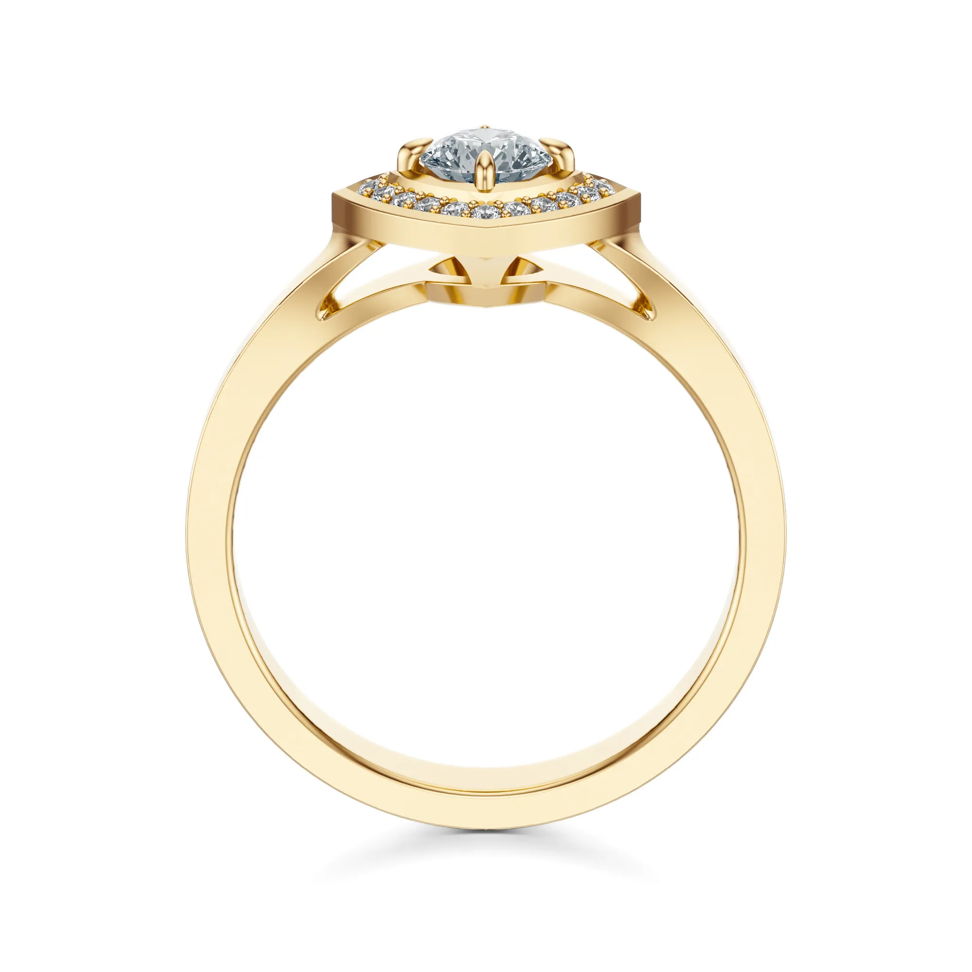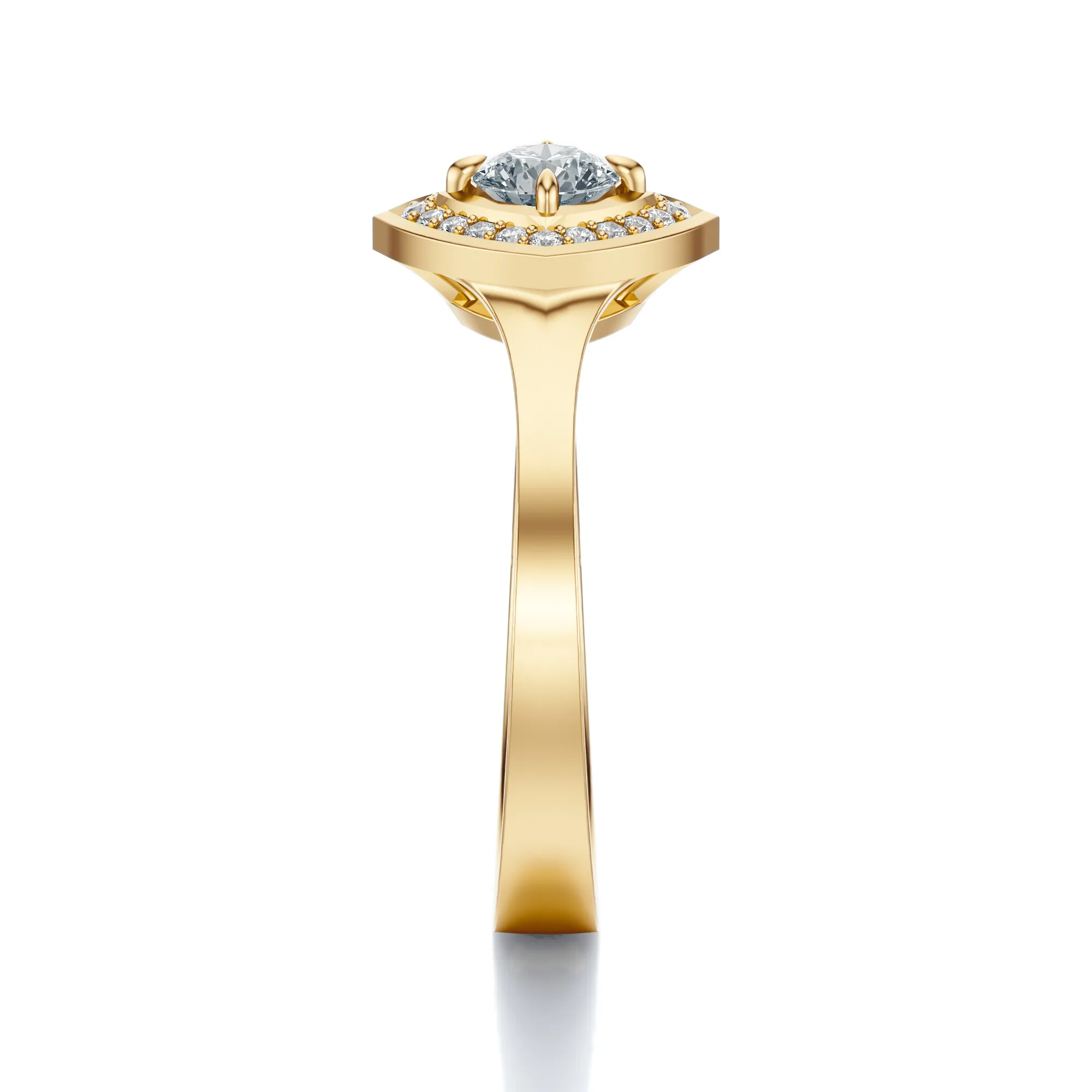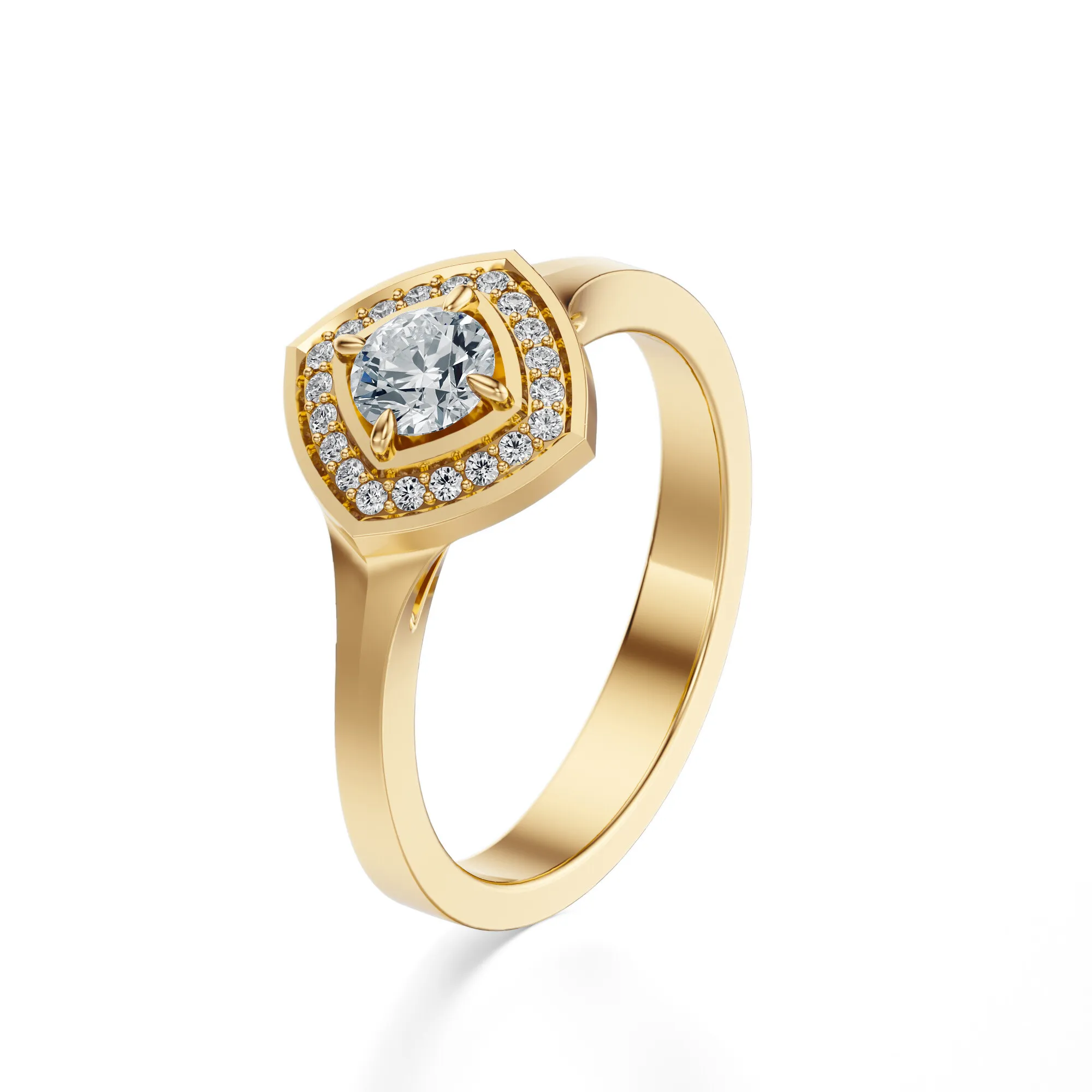 Ten wyjątkowy pierścionek zaręczynowy z żółtego złota zachwyca kunsztownym designem i olśniewającym blaskiem diamentów. Został wykonany ze złota o próbie 585, co nadaje mu trwałość i ponadczasowy charakter. Centralny okrągły diament, oprawiony w dekoracyjną ramę z drobniejszych kamieni, przyciąga uwagę wyrafinowaną formą i niezwykłą symetrią.