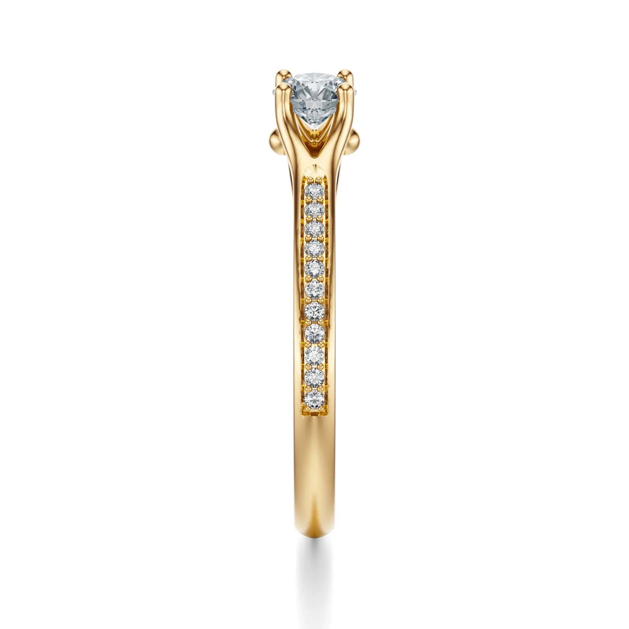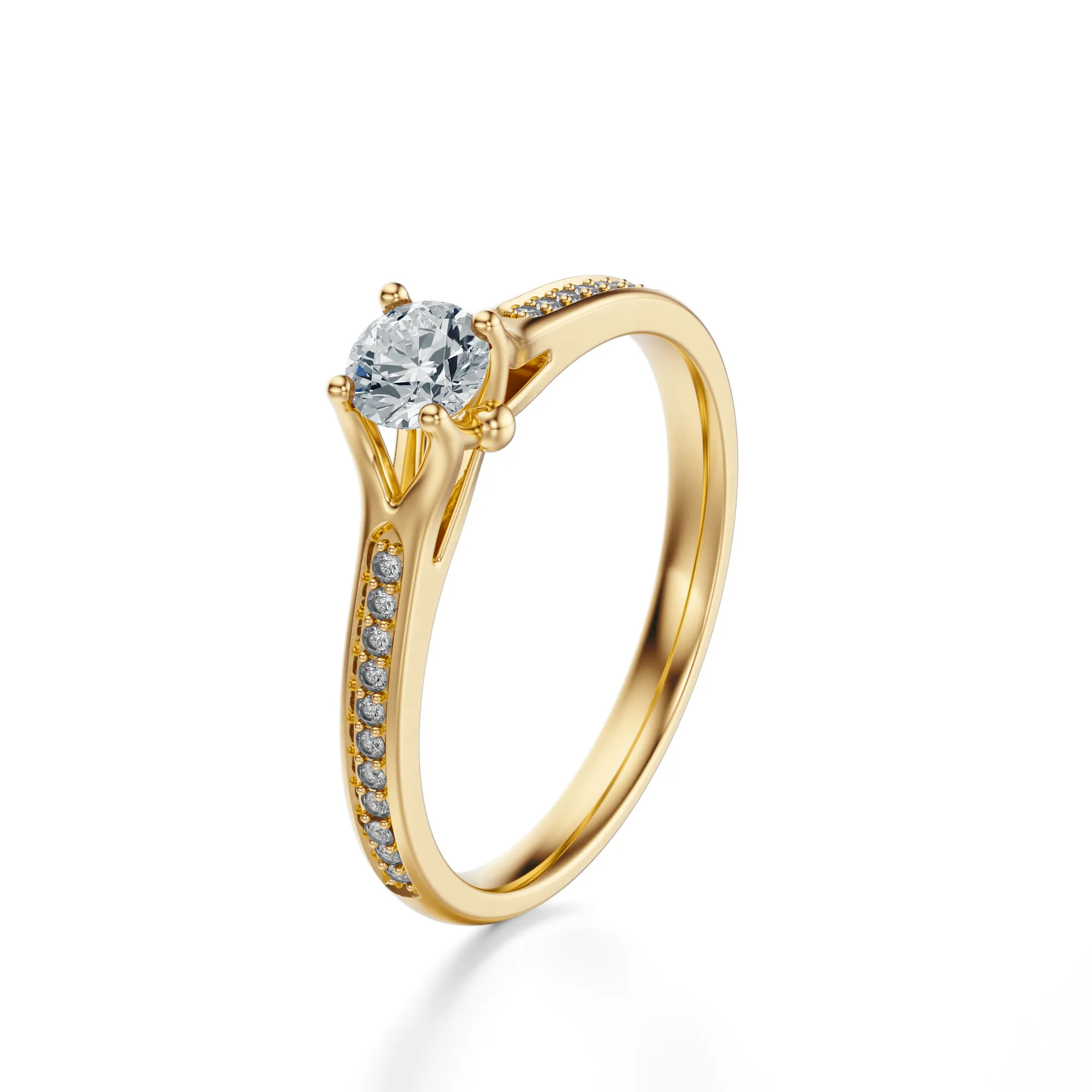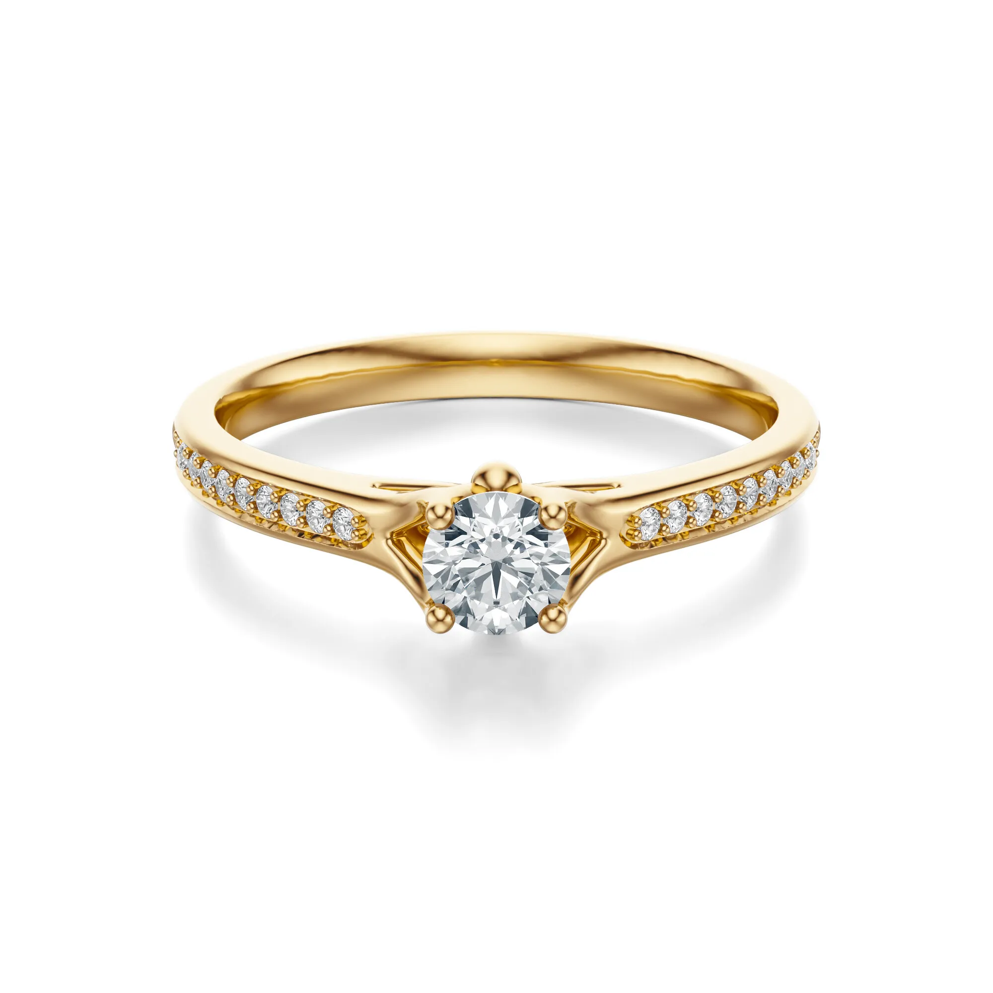 Ten pierścionek zaręczynowy z żółtego złota emanuje ponadczasową elegancją i subtelnym luksusem. Wykonany z żółtego złota o próbie 585, przyciąga wzrok swoim ciepłym odcieniem i wyrafinowanym blaskiem. Centralny okrągły diament w efektownej oprawie wznosi się ponad linią obrączki, a towarzyszące mu mniejsze kamienie podkreślają lekkość i harmonię całej kompozycji.
