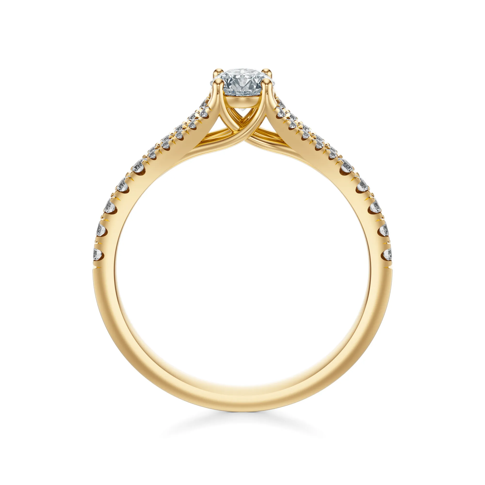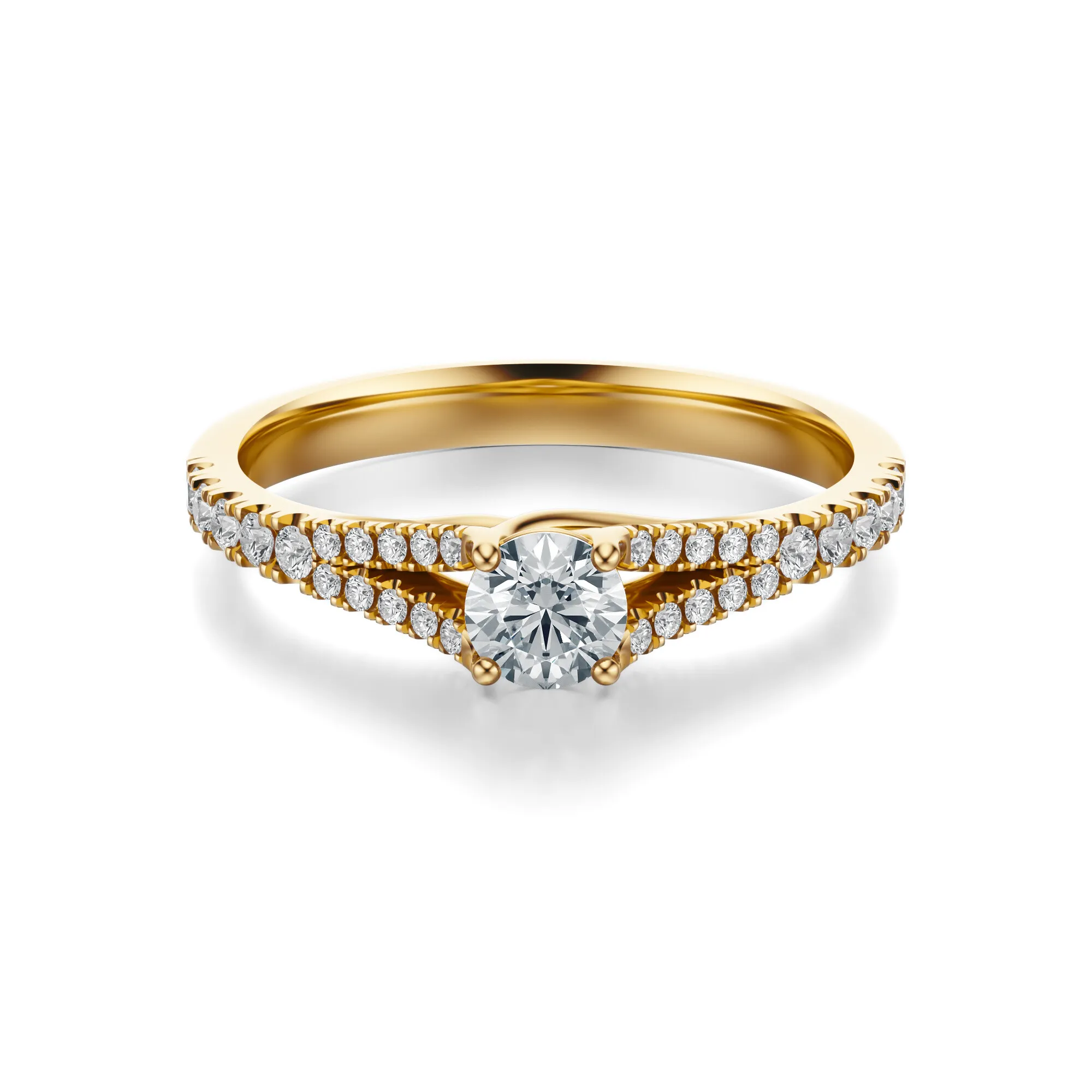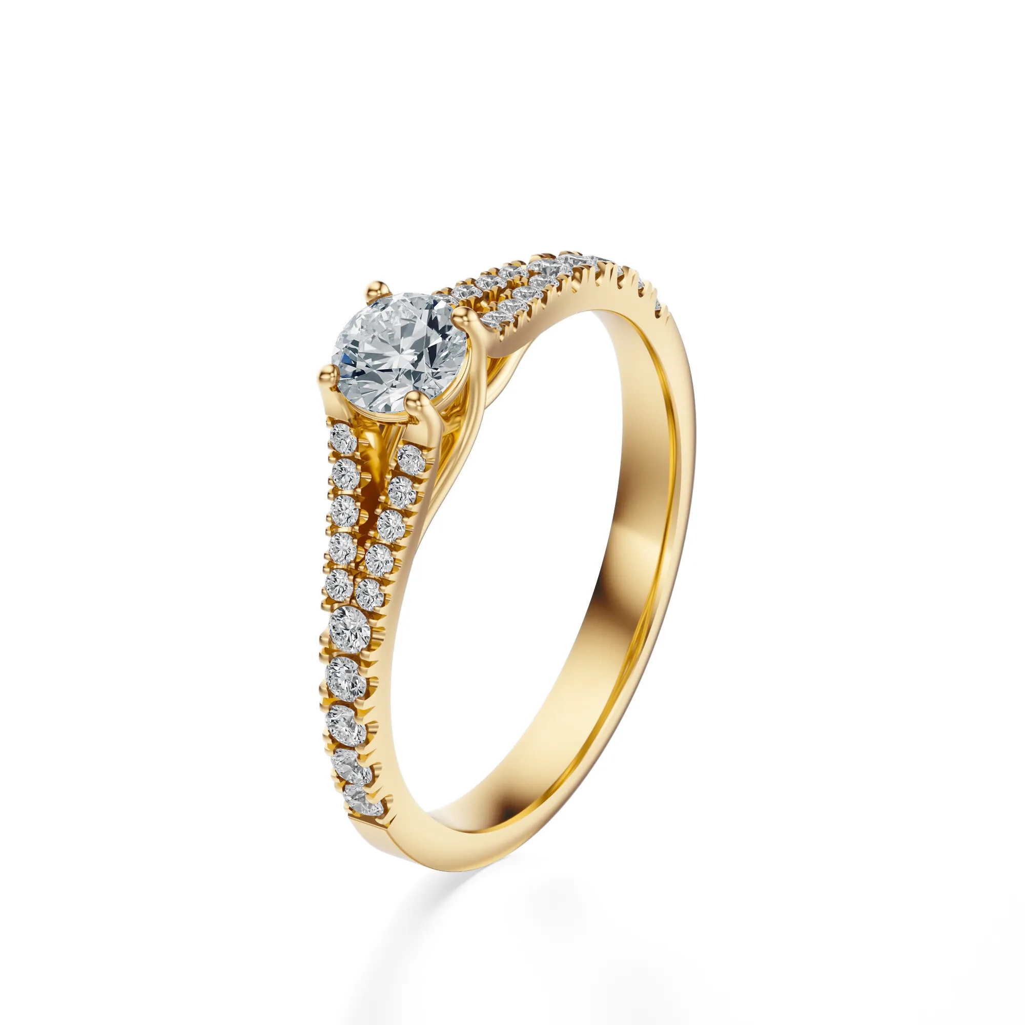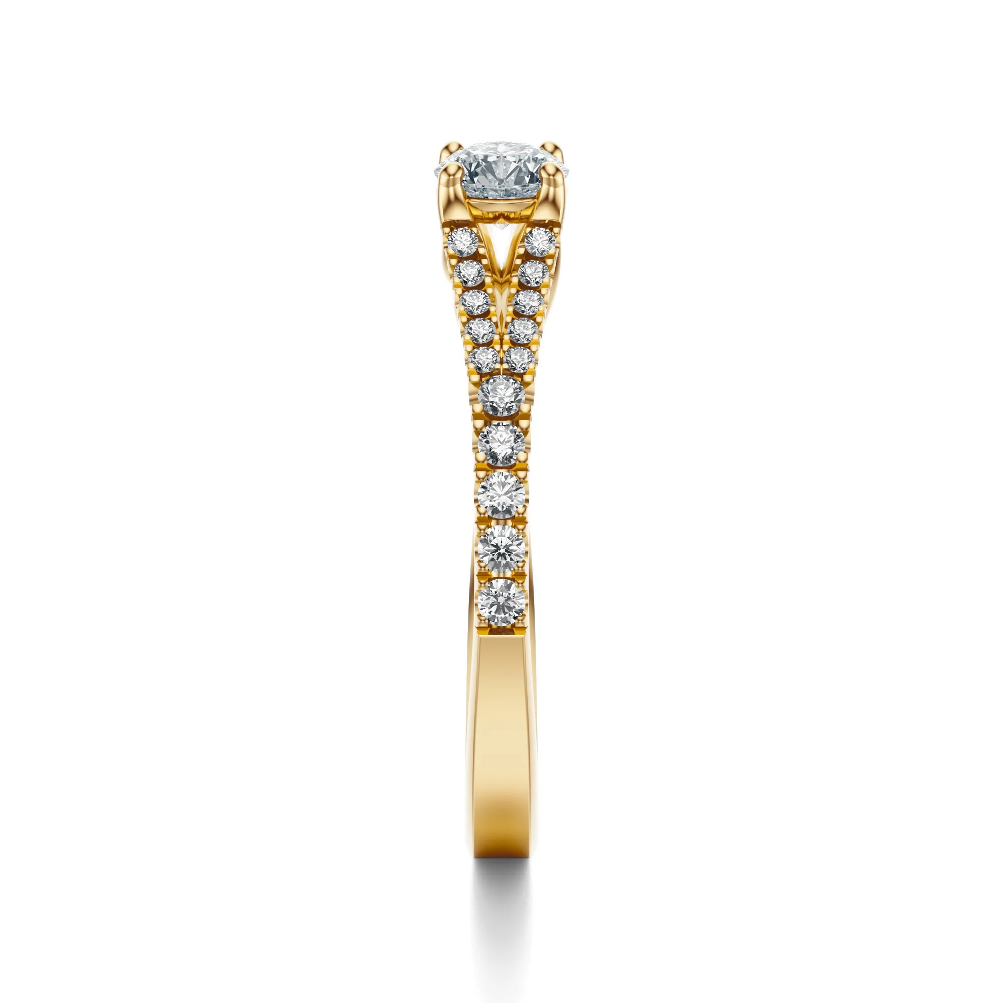 Ten zachwycający pierścionek zaręczynowy wykonany został z żółtego złota o próbie 585 i stanowi wyjątkowe połączenie klasyki oraz olśniewającego blasku. Jego elegancki charakter podkreśla centralny, okrągły diament, który osadzony został w efektownej koronie, otoczony rzędem drobnych, misternie osadzonych brylantów zdobiących ramiona obrączki. Taki design dodaje biżuterii spektakularnego światła i wrażenia głębi.