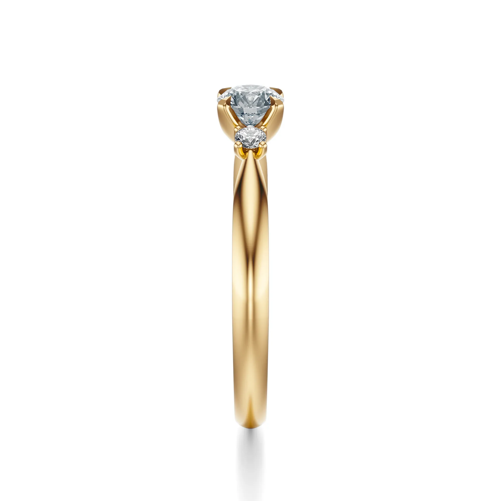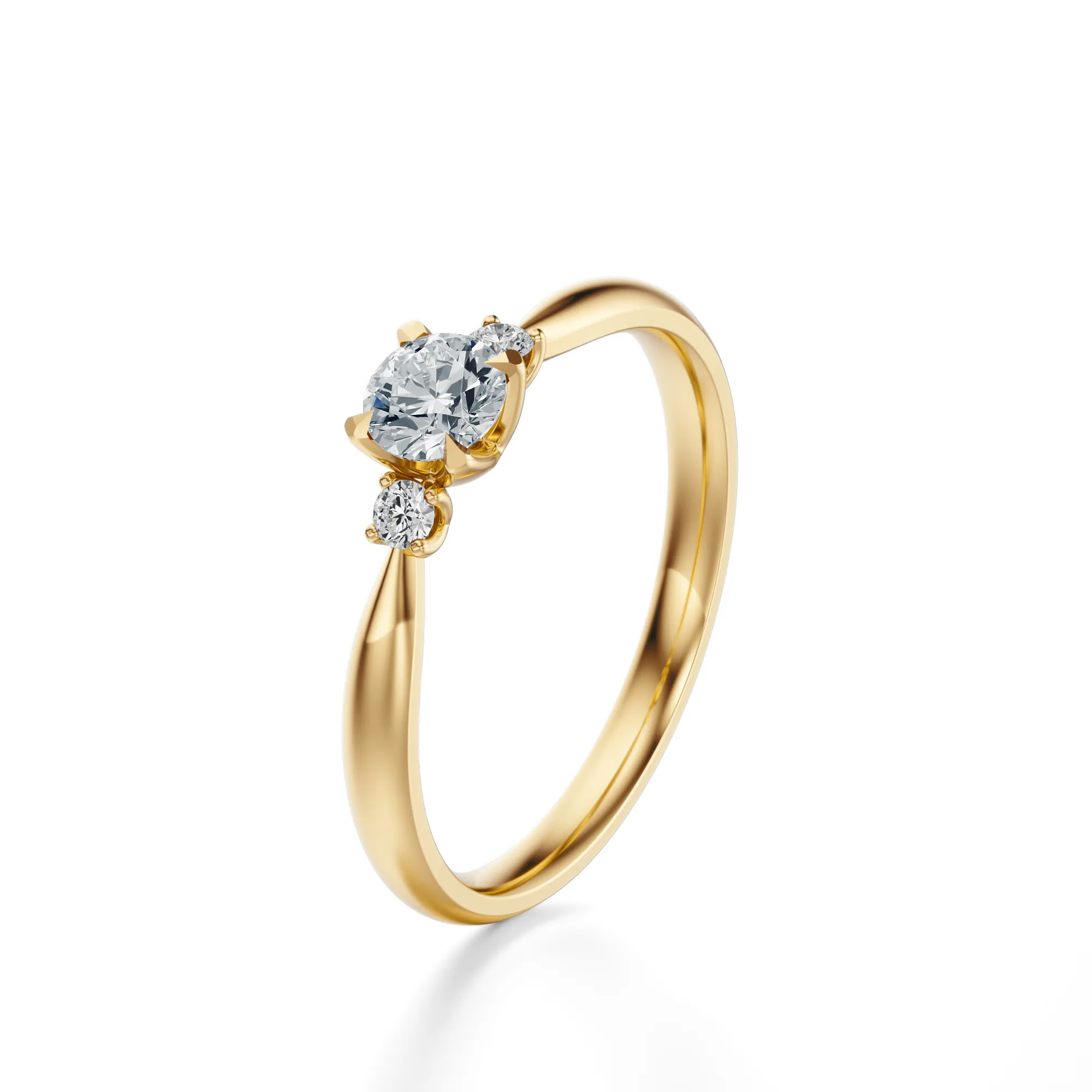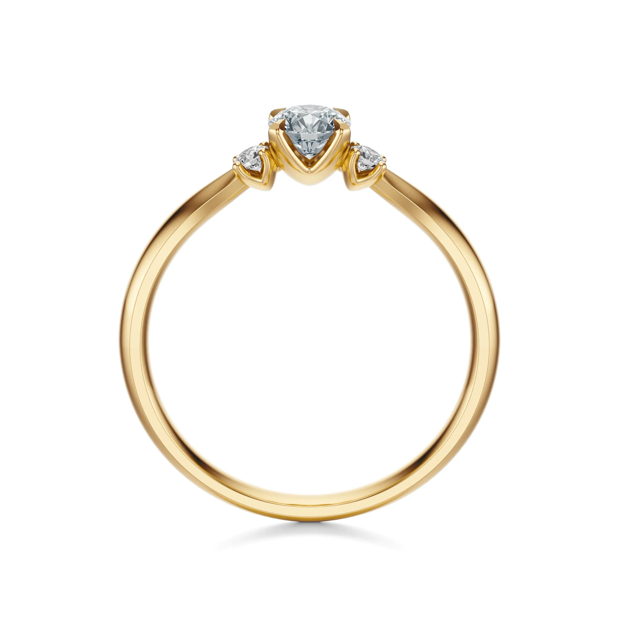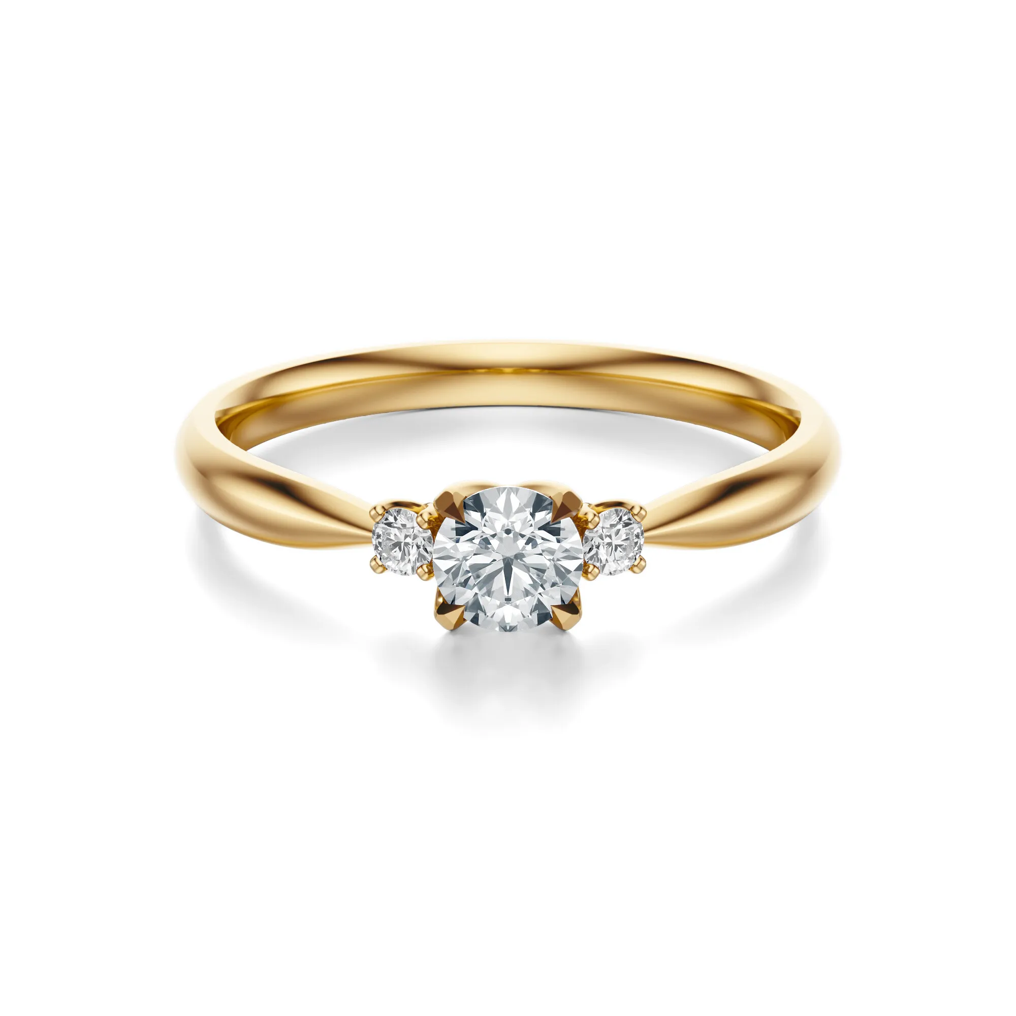 Zachwycający pierścionek wykonany ze złota o próbie 585 w klasycznym żółtym odcieniu to kwintesencja ponadczasowej elegancji. Centralny okrągły diament, wspierany przez trzy mniejsze kamienie, tworzy harmonijną kompozycję, która przyciąga spojrzenia intensywnym blaskiem. Subtelna, lekko zwężająca się obrączka dodaje całości lekkości i wyrafinowanego charakteru.