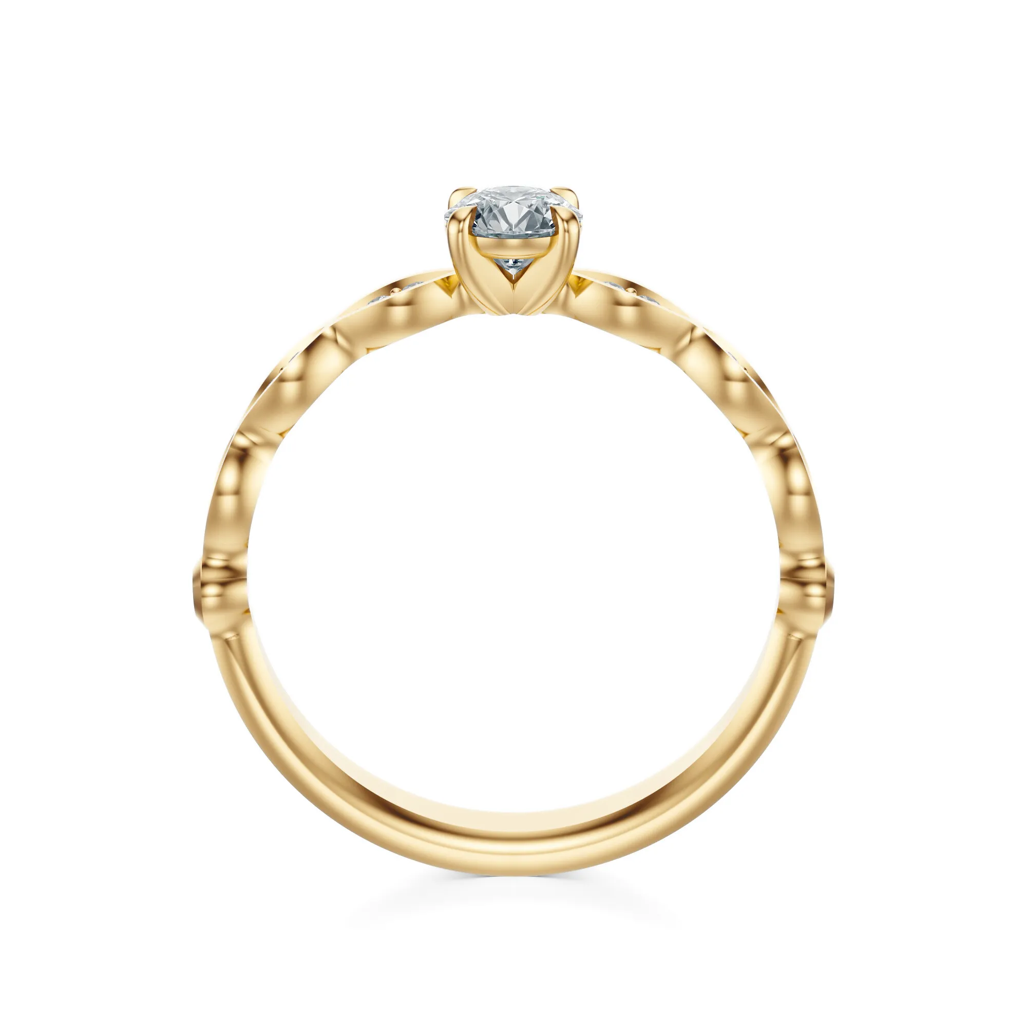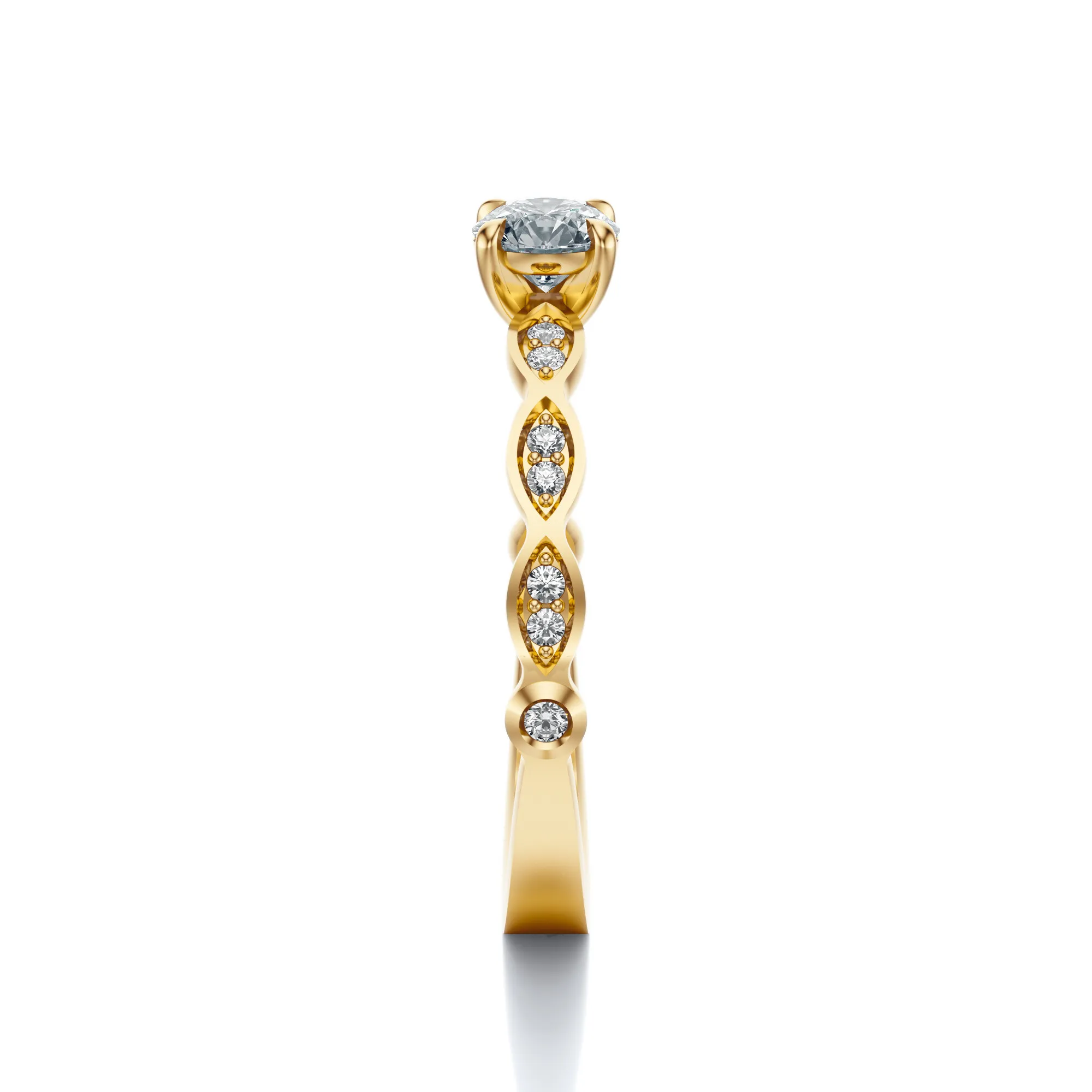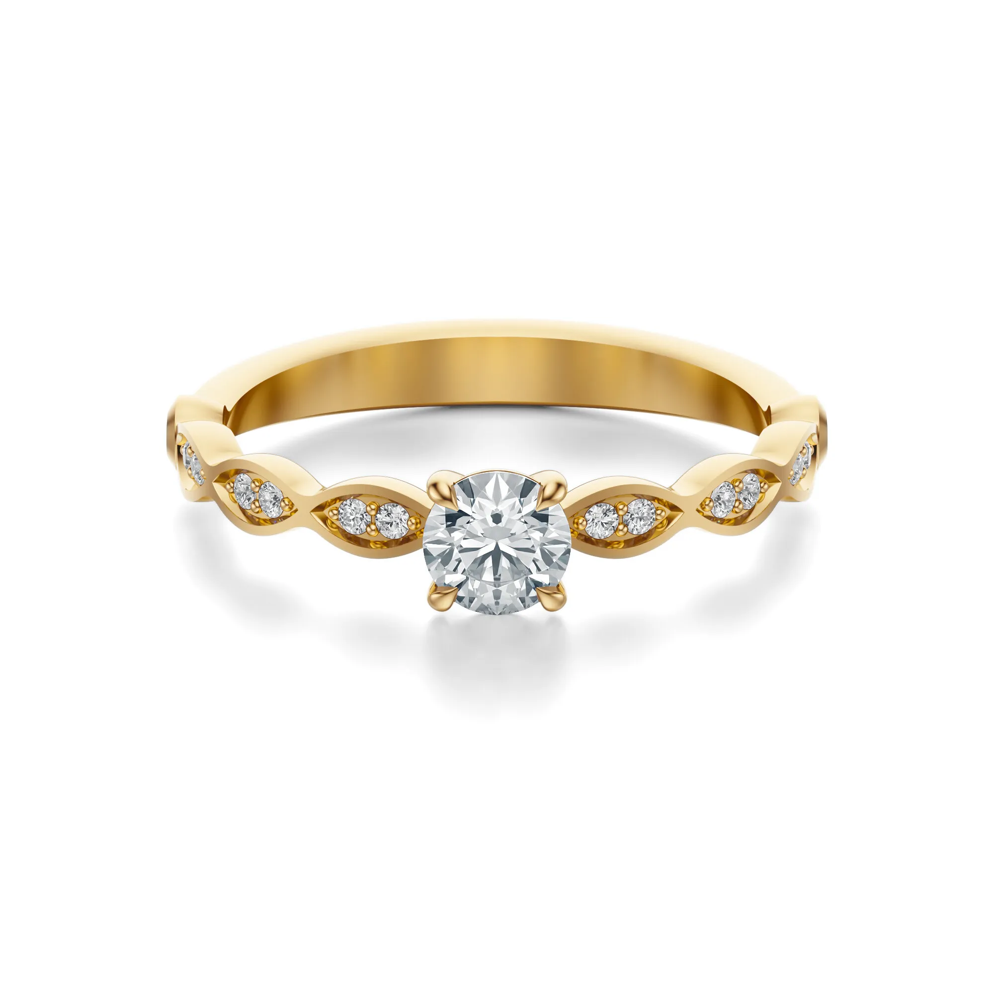 Centralny diament o szlifie Excellent, barwie H i czystości VS2 zapewnia wyjątkowy blask i doskonałą przejrzystość. Boczne kamienie harmonijnie dopełniają kompozycję, tworząc spójny, promienny efekt. Dostępne masy głównego kamienia to: 0.30, 0.40, 0.50 oraz 0.70ct, z możliwością indywidualnego dopasowania.