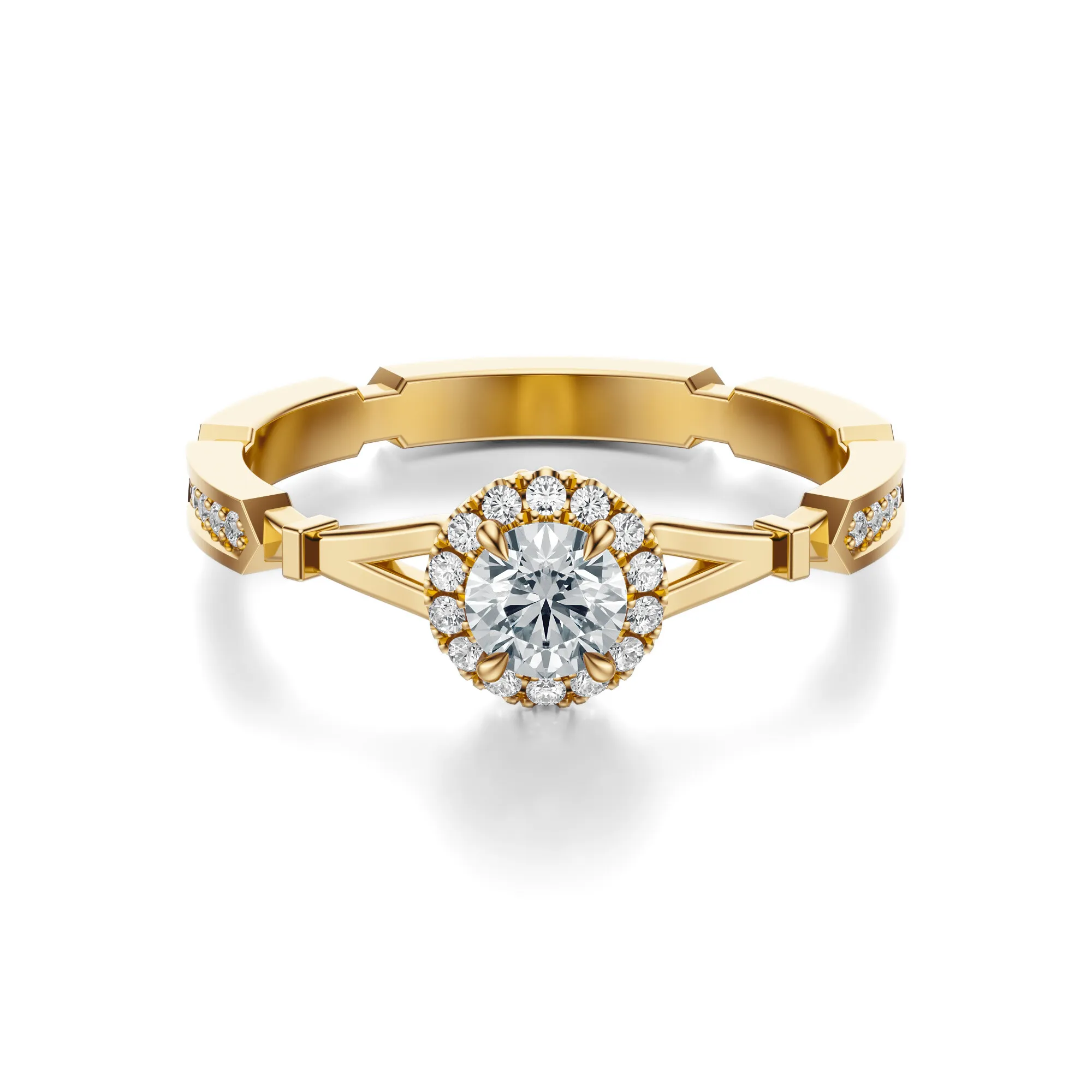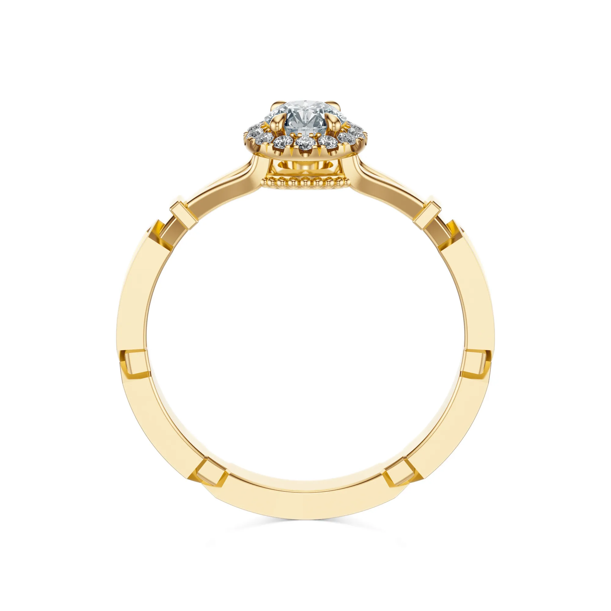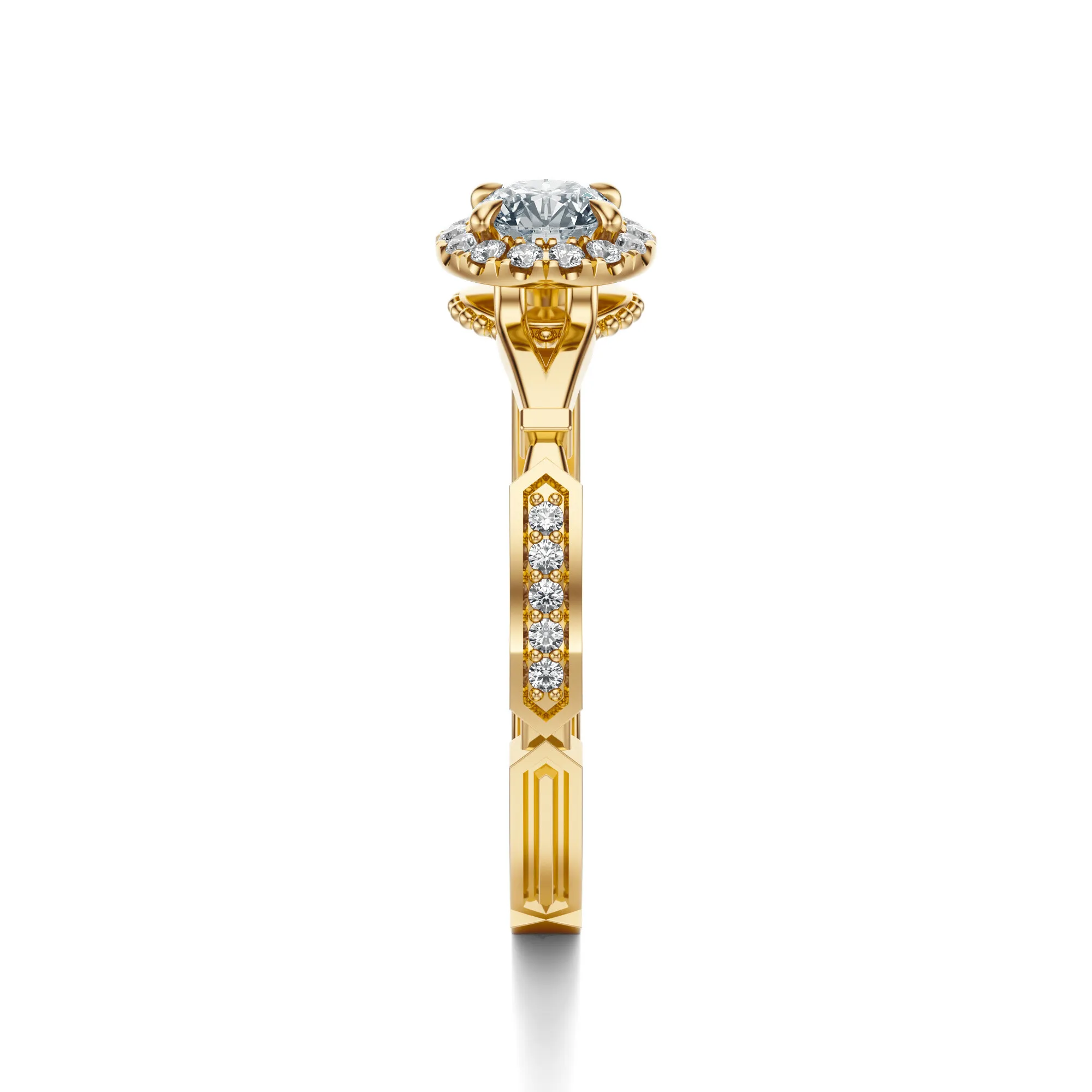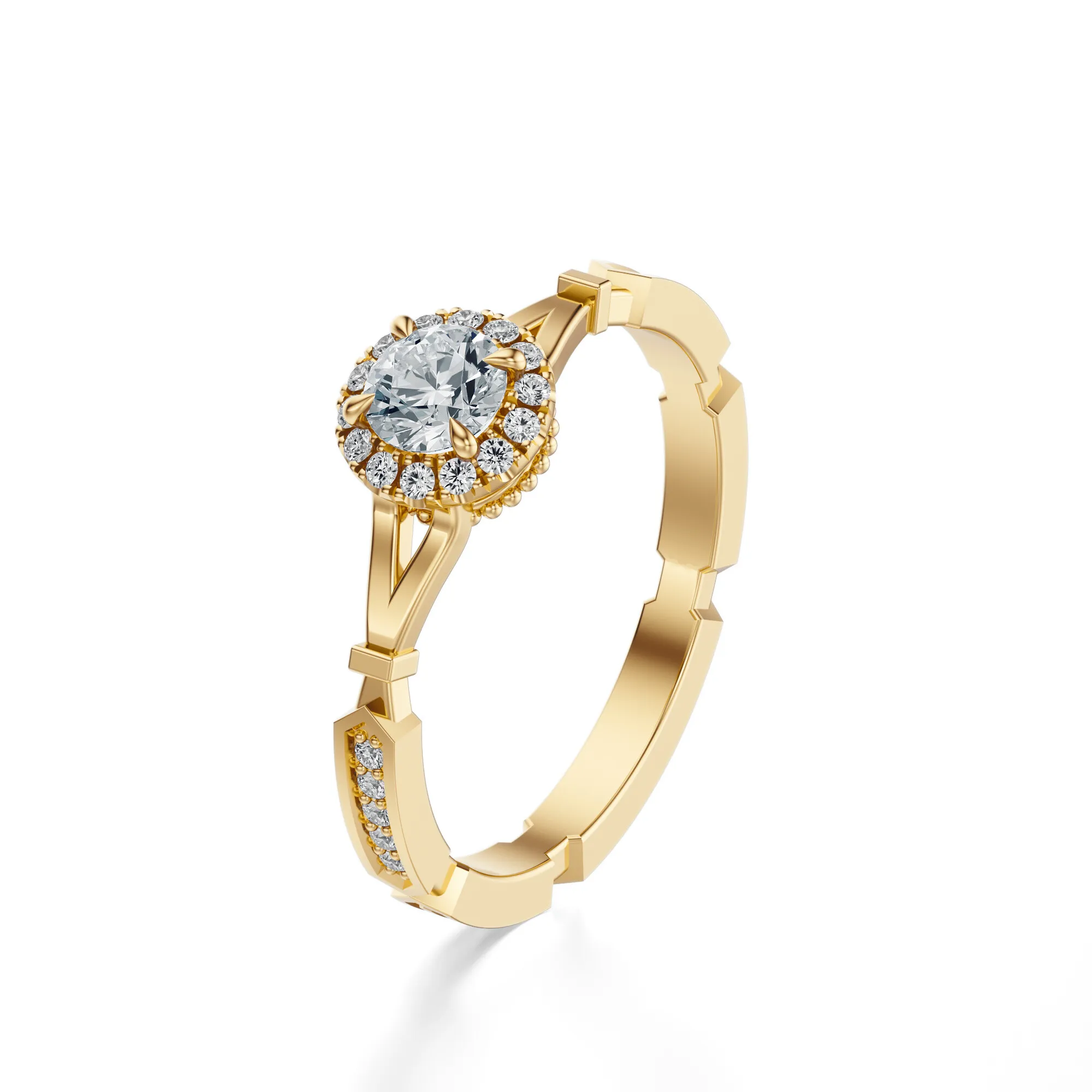 Odkryj niepowtarzalne piękno klasycznej elegancji w nowoczesnym wydaniu – ten wyjątkowy pierścionek zaręczynowy zachwyca misternym wykonaniem i olśniewającym blaskiem. Wykonany ze złota o próbie 585 w ciepłym odcieniu żółci, model ten przyciąga uwagę wyjątkowym projektem, który harmonijnie łączy kunszt jubilerski z luksusem szlachetnych materiałów. Centralny, okrągły diament otoczony został świetlistą aureolą mniejszych kamieni, podkreślających jego intensywny blask i nadających całej kompozycji niepowtarzalnego charakteru.