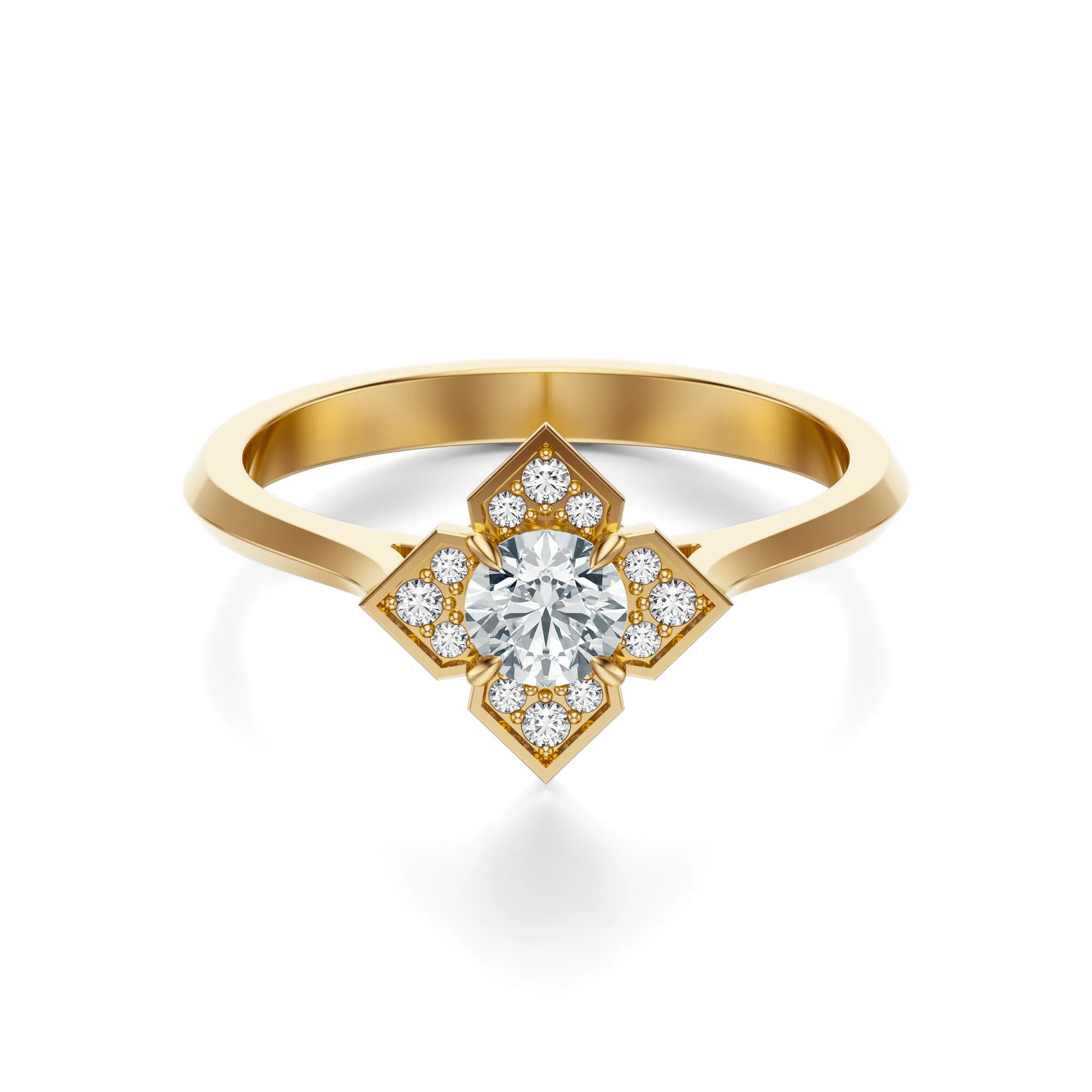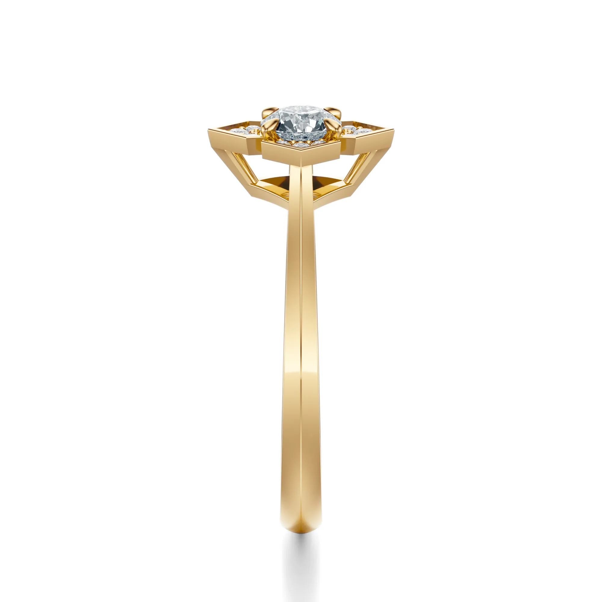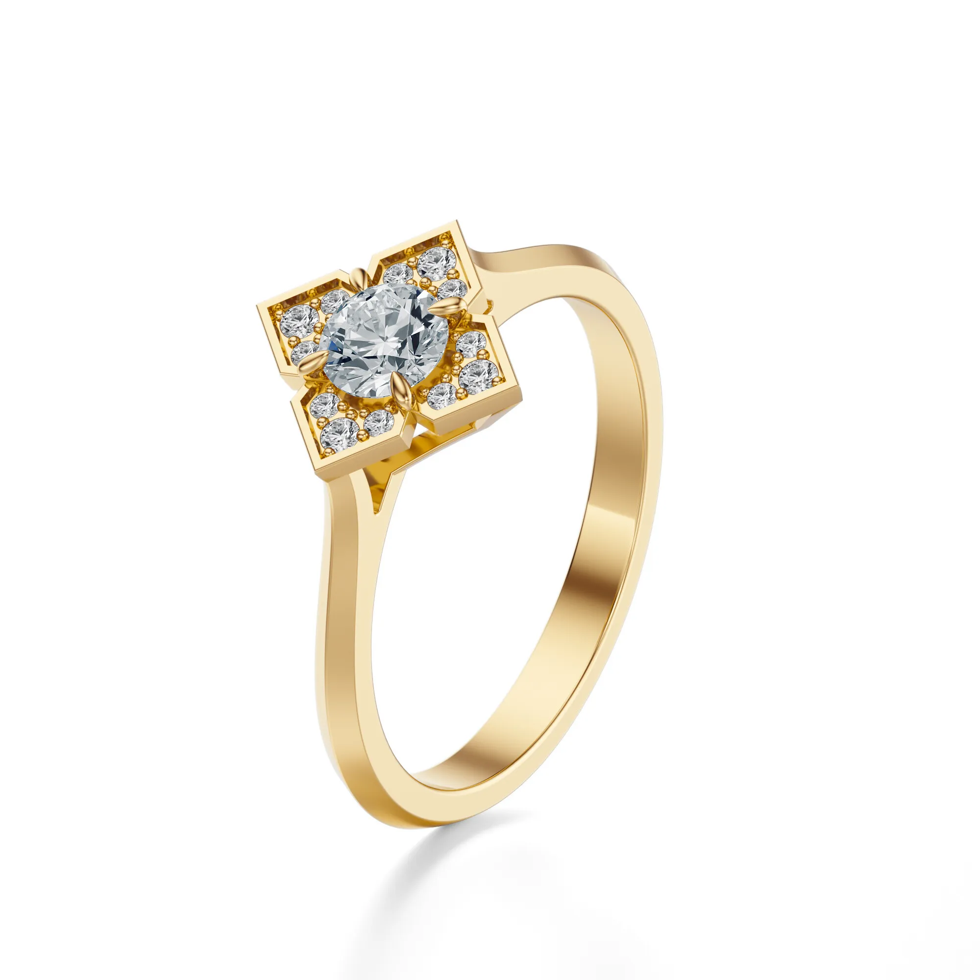 Ten zachwycający pierścionek zaręczynowy wykonany został ze złota o próbie 585 w ciepłym odcieniu żółci, który pięknie współgra z intensywnym blaskiem naturalnych diamentów. Wyróżnia się oryginalnym designem – geometryczna oprawa w formie stylizowanego krzyża otacza centralny kamień, tworząc efektowny kontrast klasyki i nowoczesności. Subtelna gra światła na polerowanej powierzchni metalu podkreśla wyjątkowy charakter biżuterii.