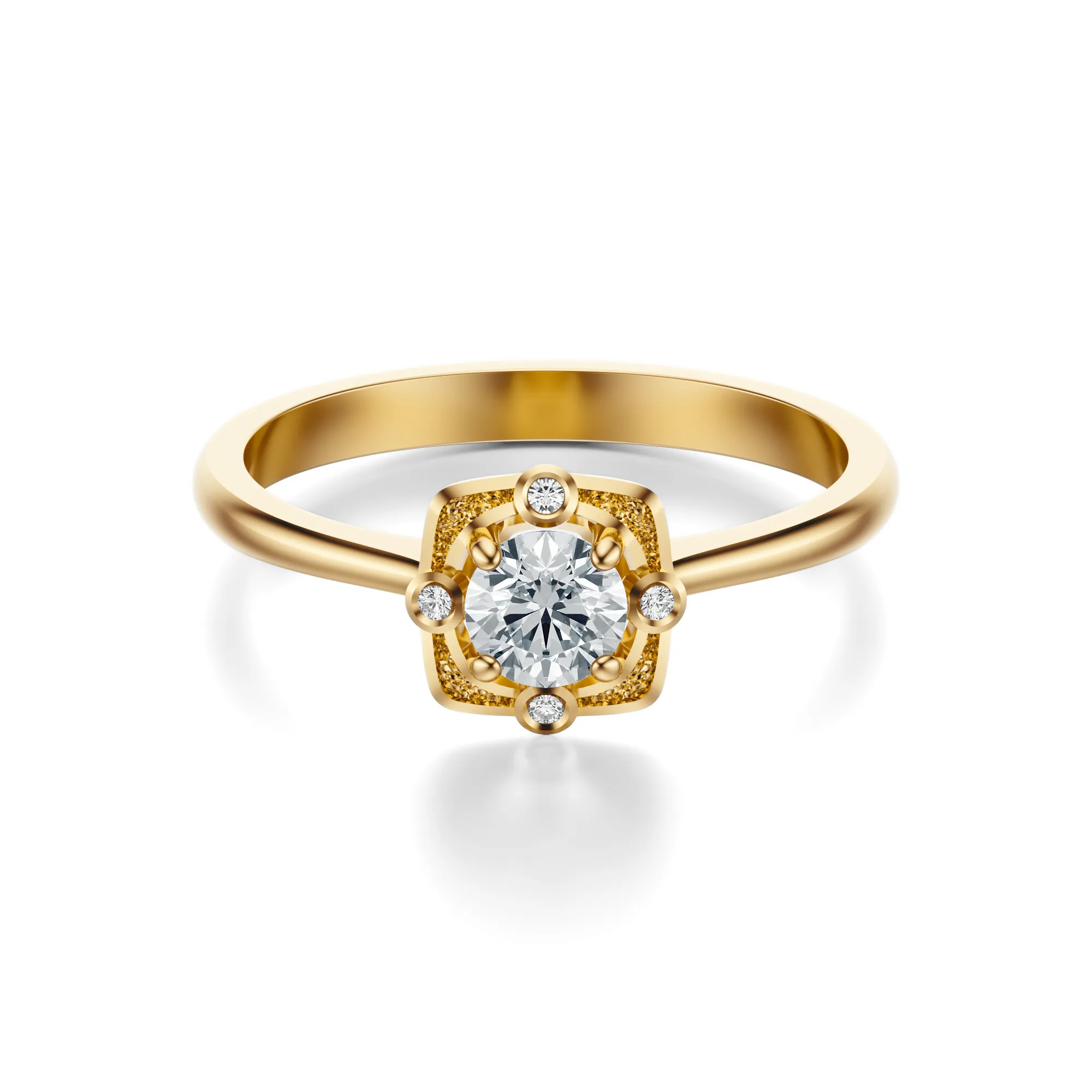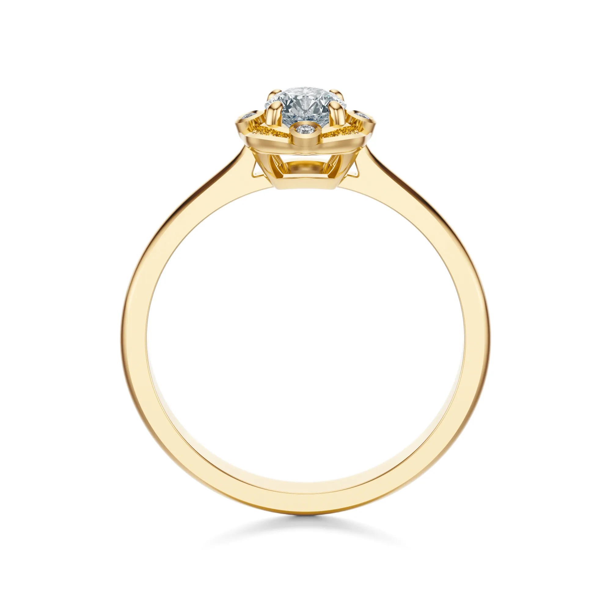 Ten niezwykły pierścionek zaręczynowy zachwyca harmonijnym połączeniem elegancji, klasycznego stylu i subtelnej nuty artystycznego wyrafinowania. Wykonany ze złota o próbie 585 w ciepłym, żółtym odcieniu, emanuje ponadczasowym pięknem, które podkreślają starannie osadzone okrągłe diamenty. Każdy detal pierścionka został zaprojektowany tak, aby zachwycać intensywnym blaskiem i nadać całości wyjątkowego charakteru.