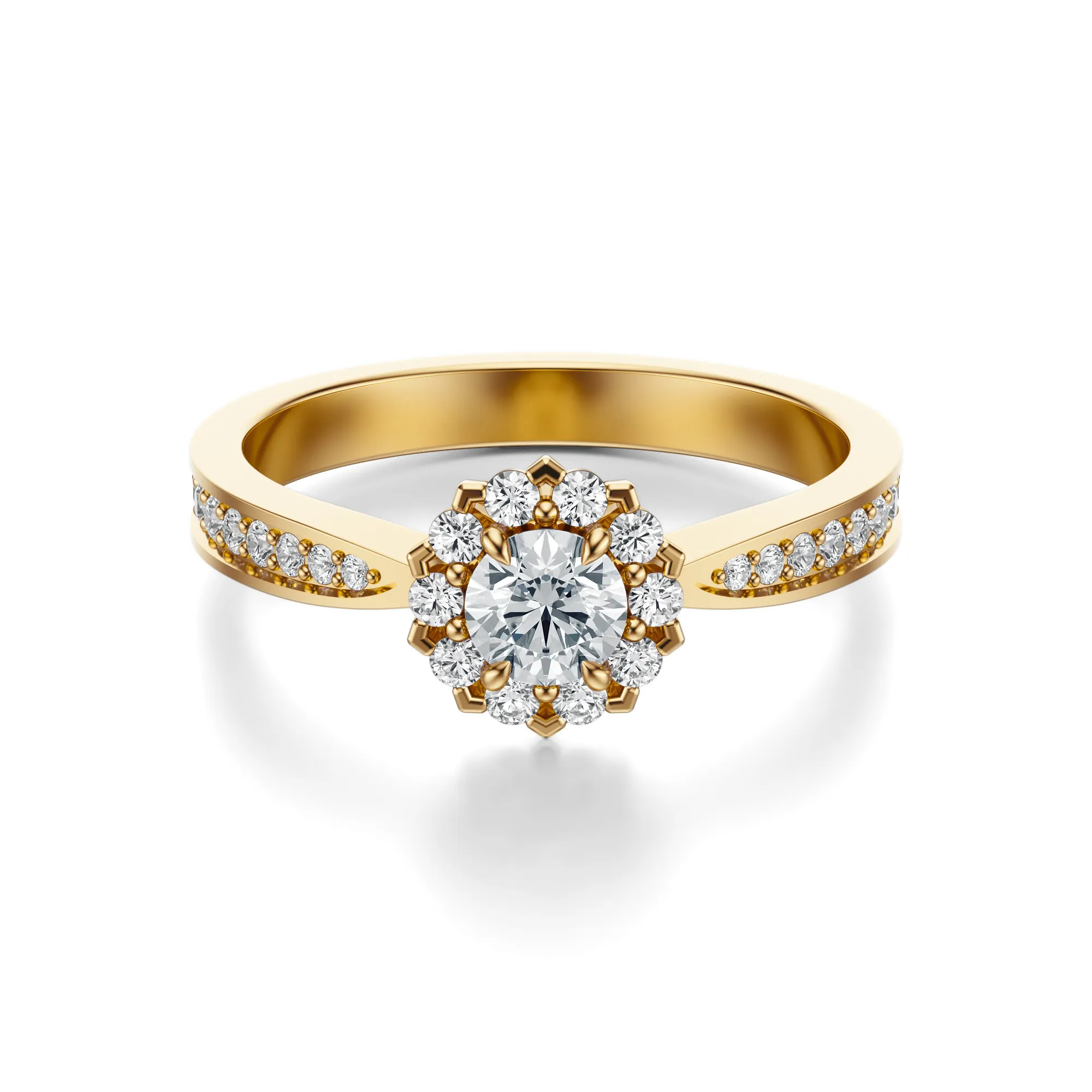 Ten olśniewający pierścionek wykonany z różowego złota o próbie 585 zachwyca subtelnym blaskiem i elegancją w każdym calu. Wyrafinowany design w połączeniu z okrągłymi diamentami tworzy wyjątkowy efekt wizualny, który przyciąga wzrok i podkreśla delikatny, romantyczny charakter biżuterii. Centralny diament otoczony jest przez misternie rozmieszczone mniejsze kamienie, tworząc harmonijną kompozycję o intensywnym połysku.