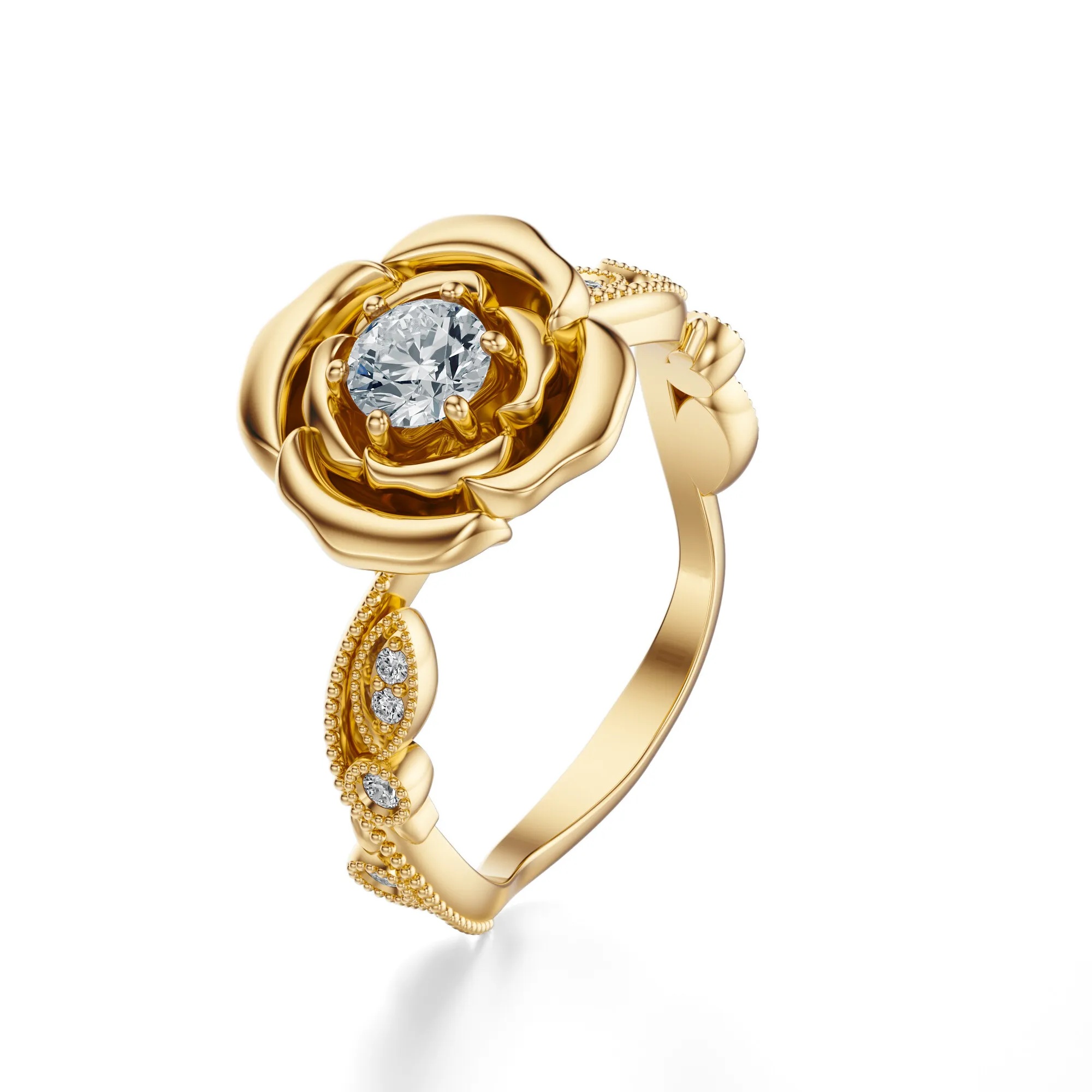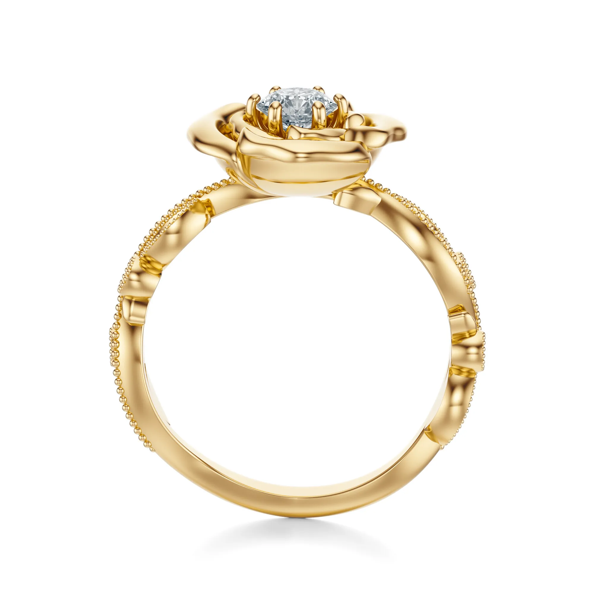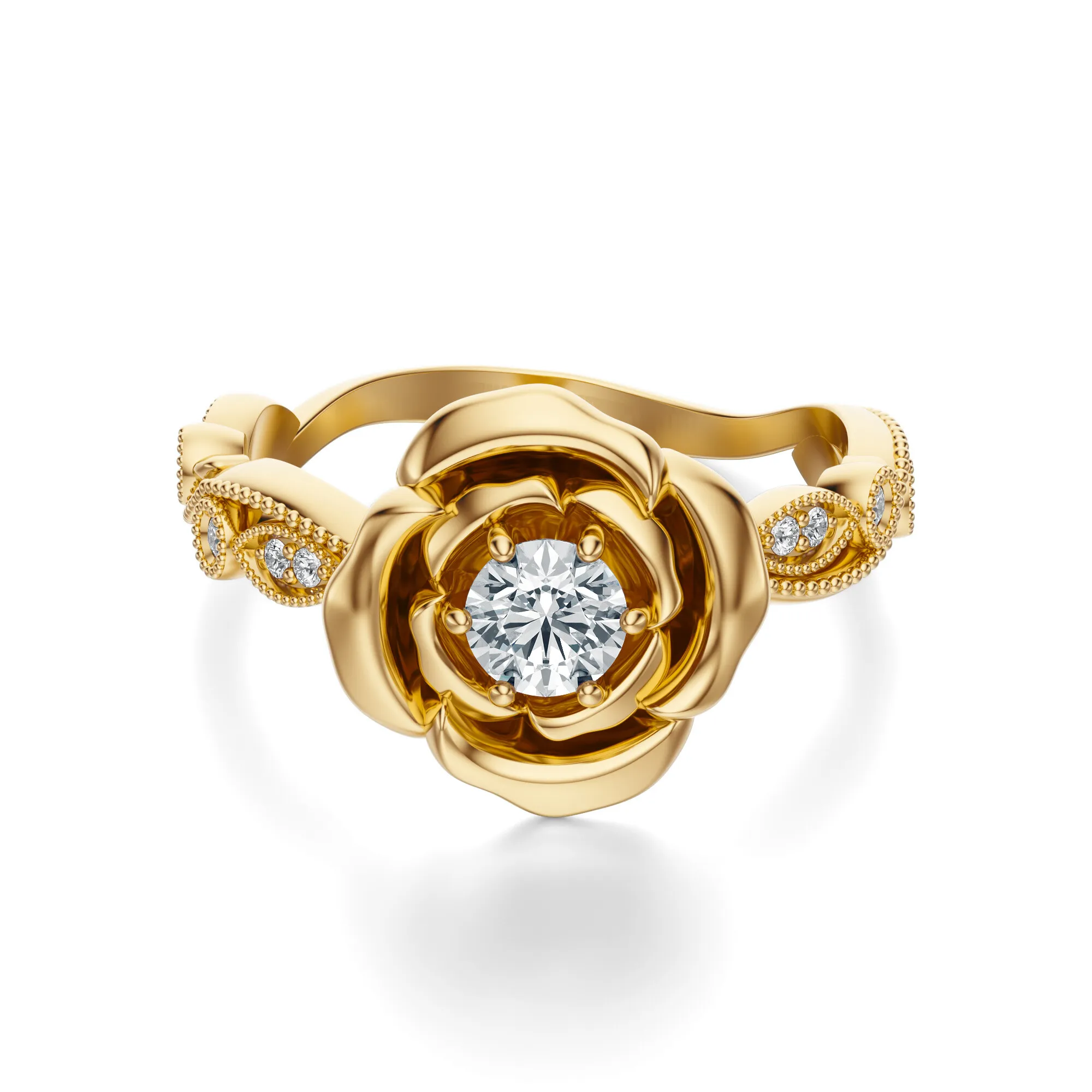 Ten niezwykle kunsztowny pierścionek zachwyca swoją estetyką i dopracowanymi detalami, czyniąc go prawdziwym dziełem sztuki jubilerskiej. Wykonany ze złota o próbie 585 w ciepłym odcieniu żółtego złota, emanuje elegancją i luksusem. Centralny diament w kształcie okrągłym osadzony jest w finezyjnej koronie przypominającej kwiat róży – symbol miłości i romantyzmu. Dodatkowe diamenty zdobią misternie plecioną szynę, podkreślając wysublimowany charakter tej wyjątkowej biżuterii.