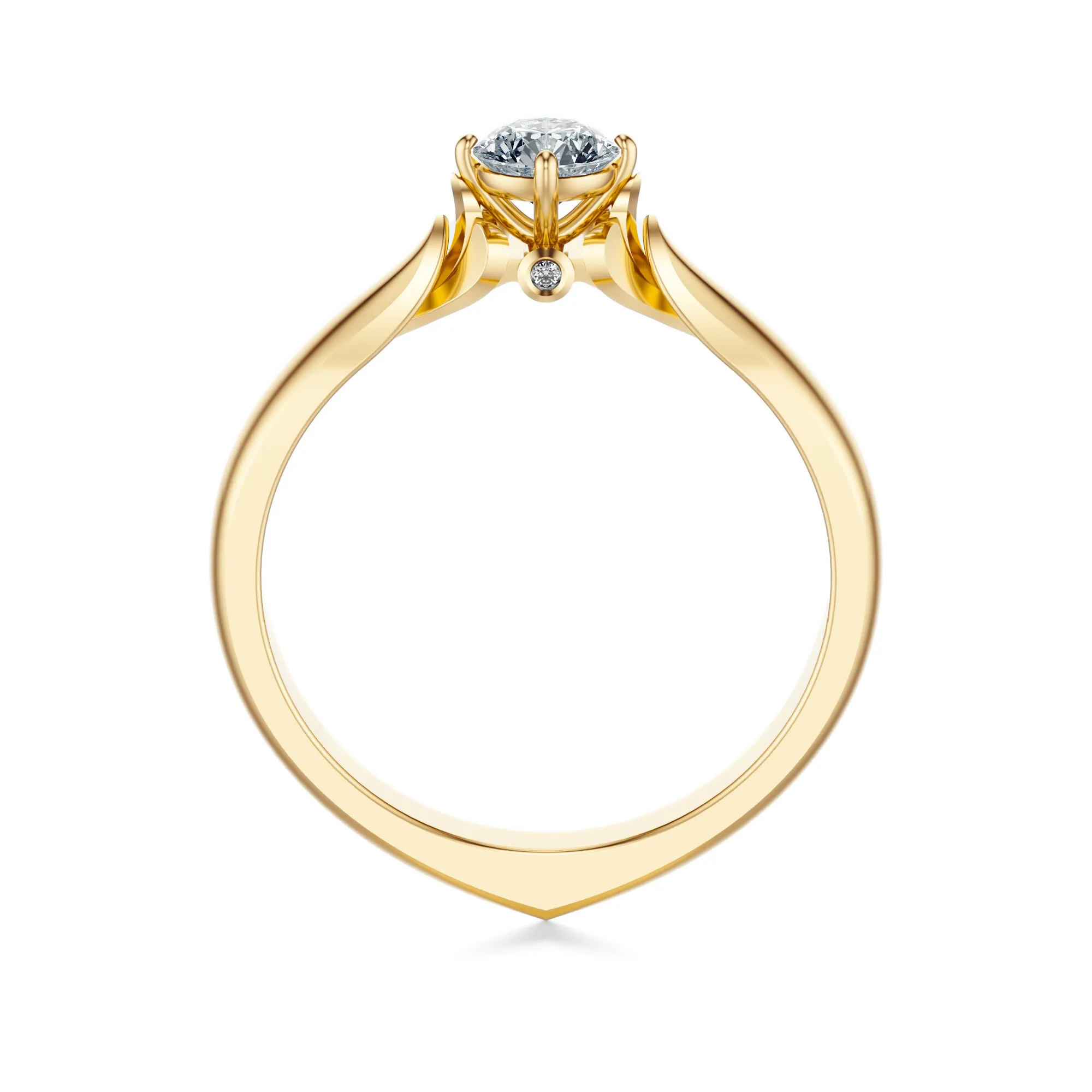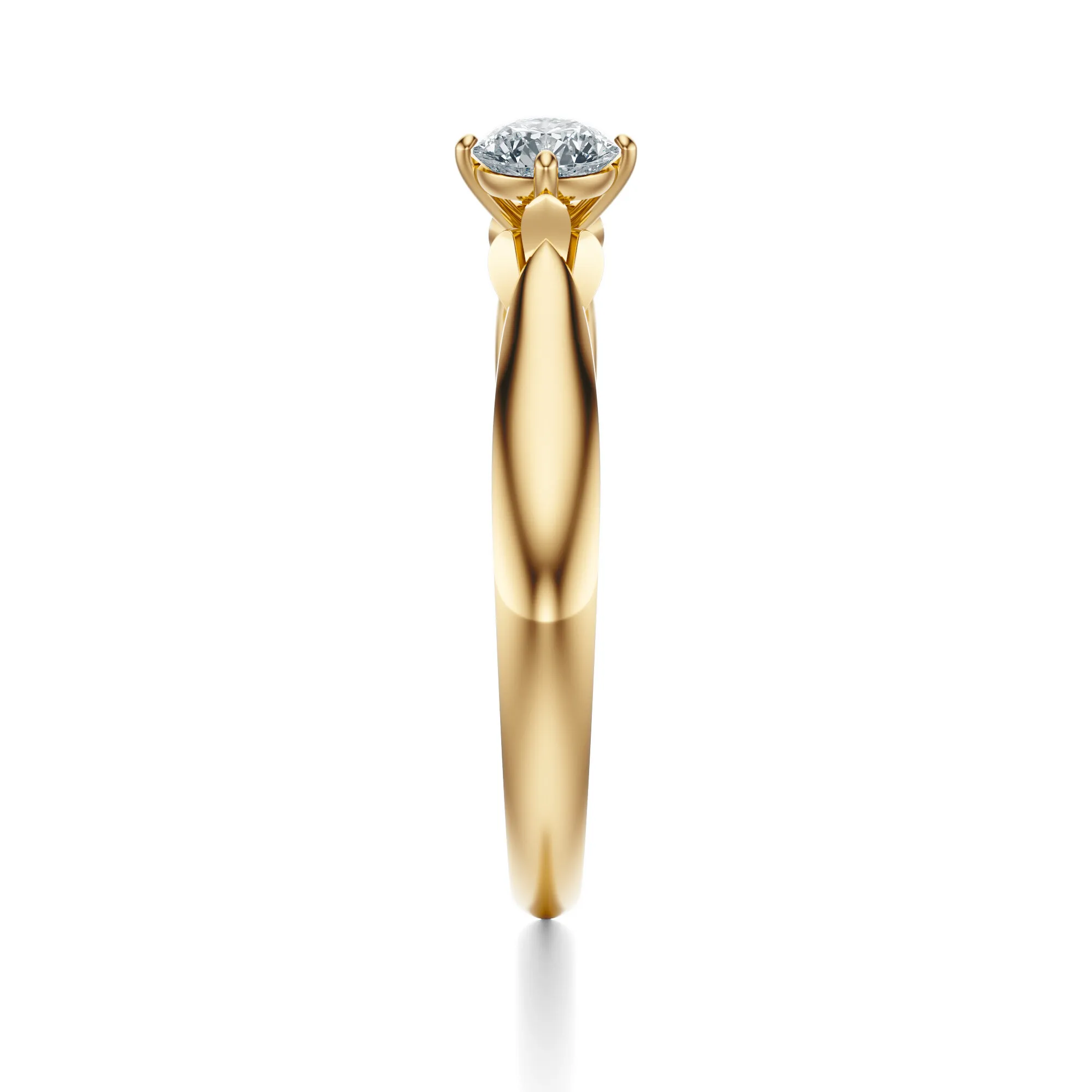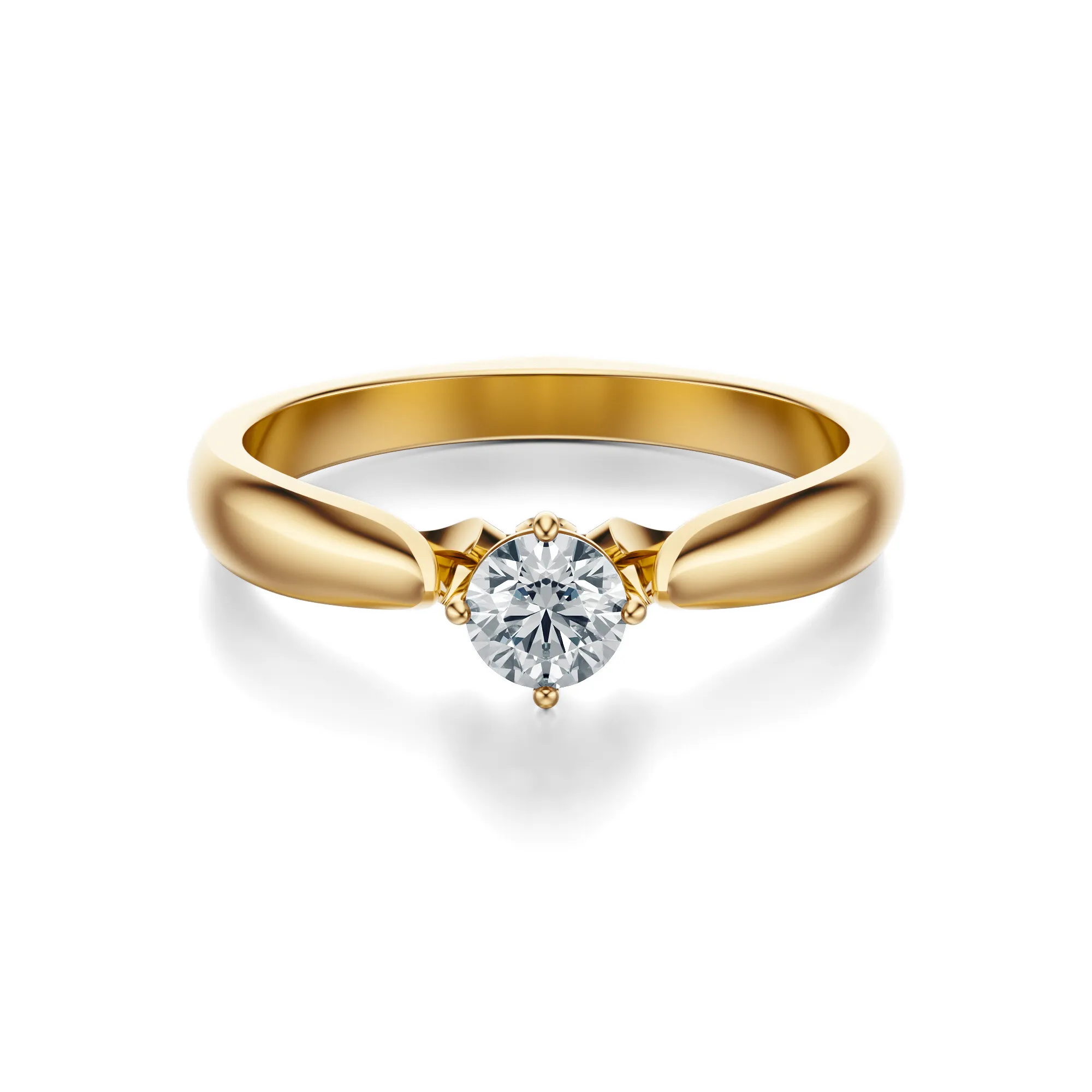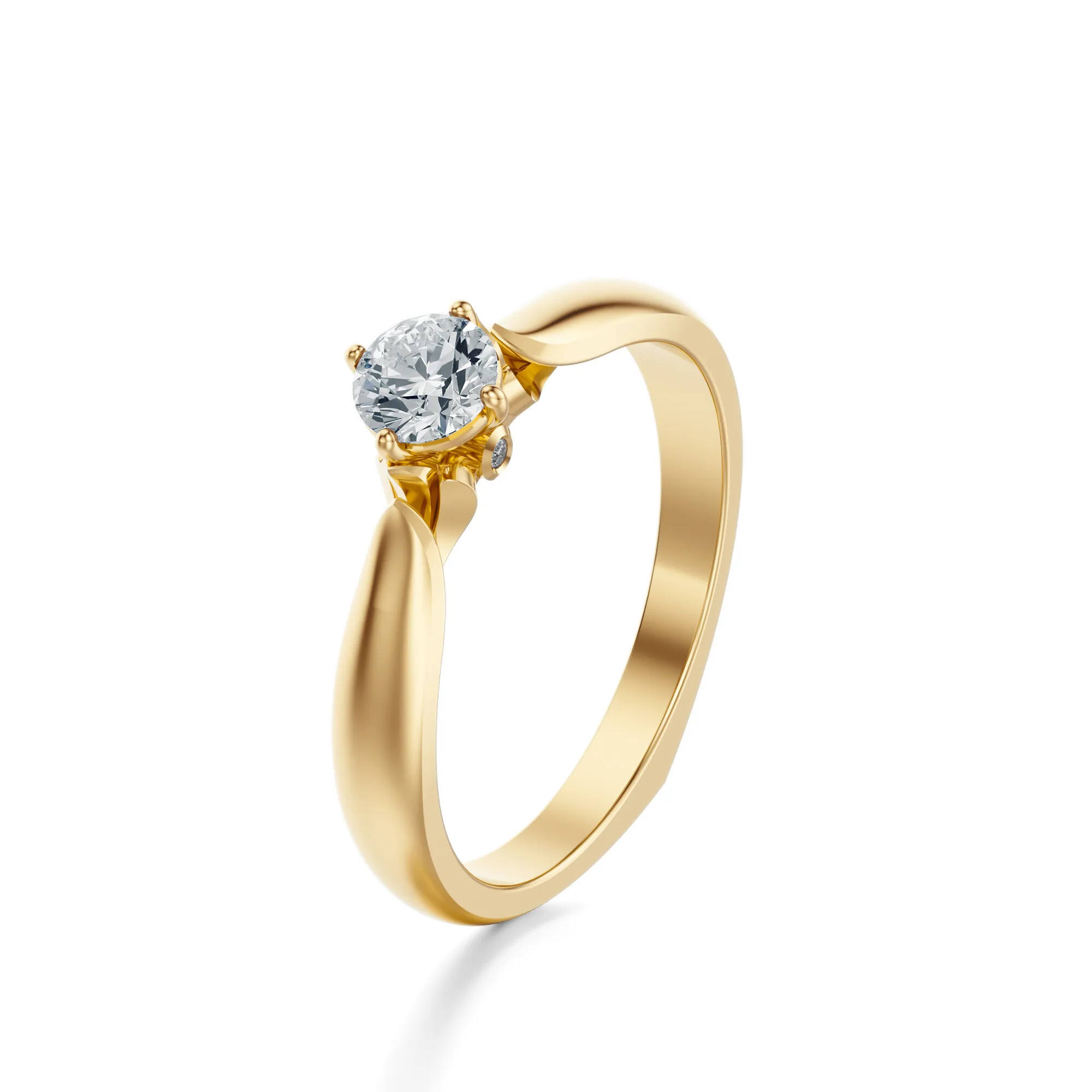 Ten zachwycający pierścionek zaręczynowy wykonany ze złota o próbie 585 w ciepłym odcieniu żółtego złota to połączenie klasyki z subtelnym powiewem nowoczesnej elegancji. Harmonijnie wyprofilowana obrączka otula okrągły diament centralny, który przyciąga wzrok intensywnym blaskiem i czystością. Uzupełnieniem kompozycji są trzy drobniejsze diamenty osadzone tuż przy głównym kamieniu, które delikatnie podkreślają jego piękno.